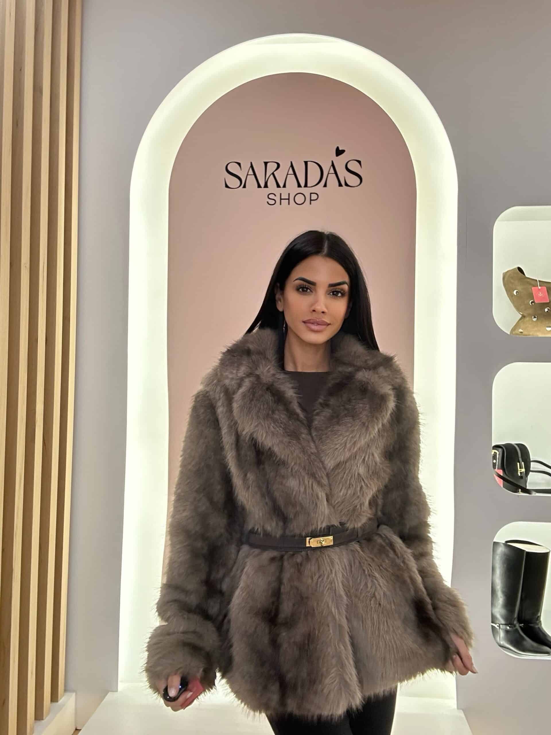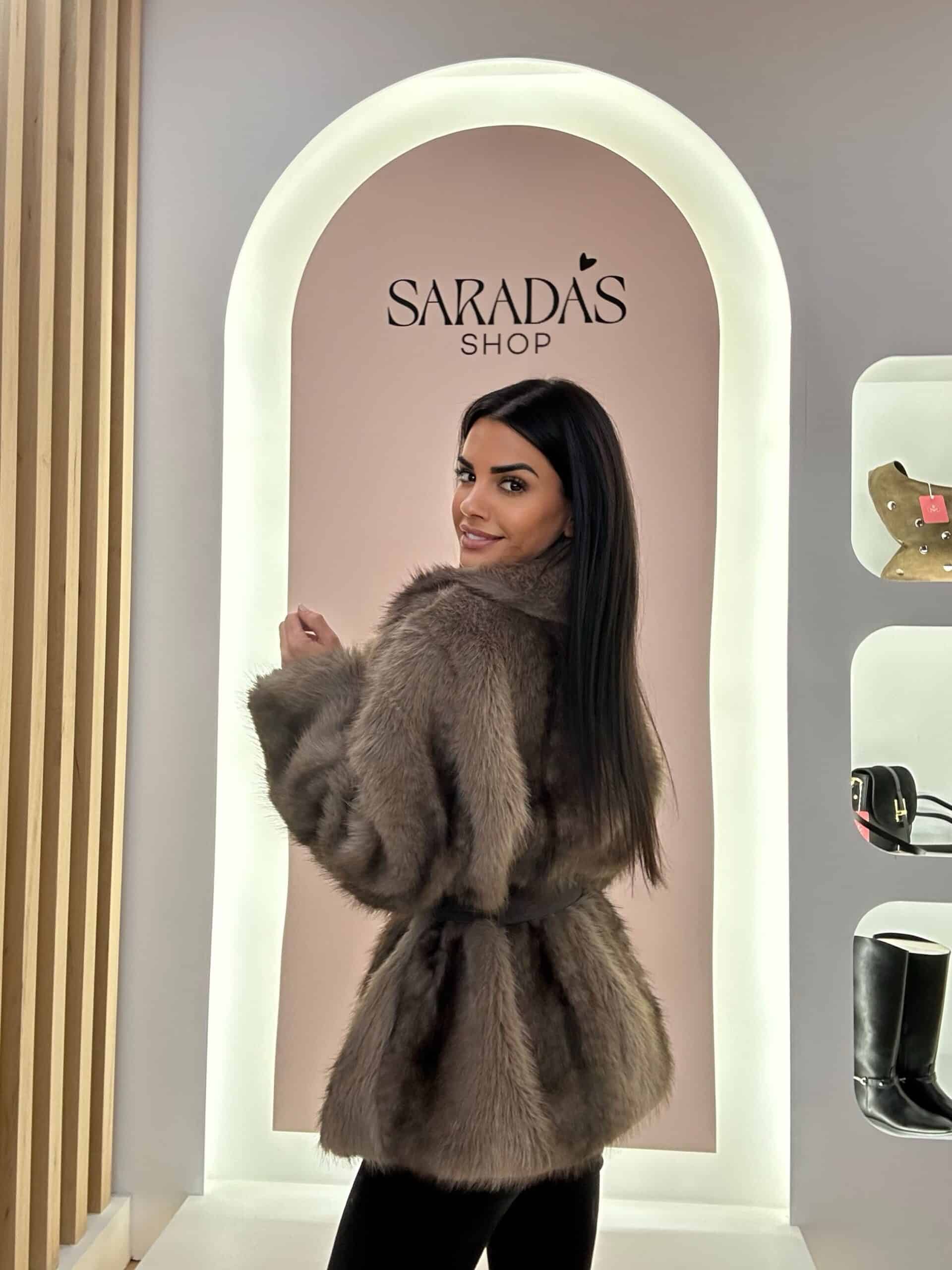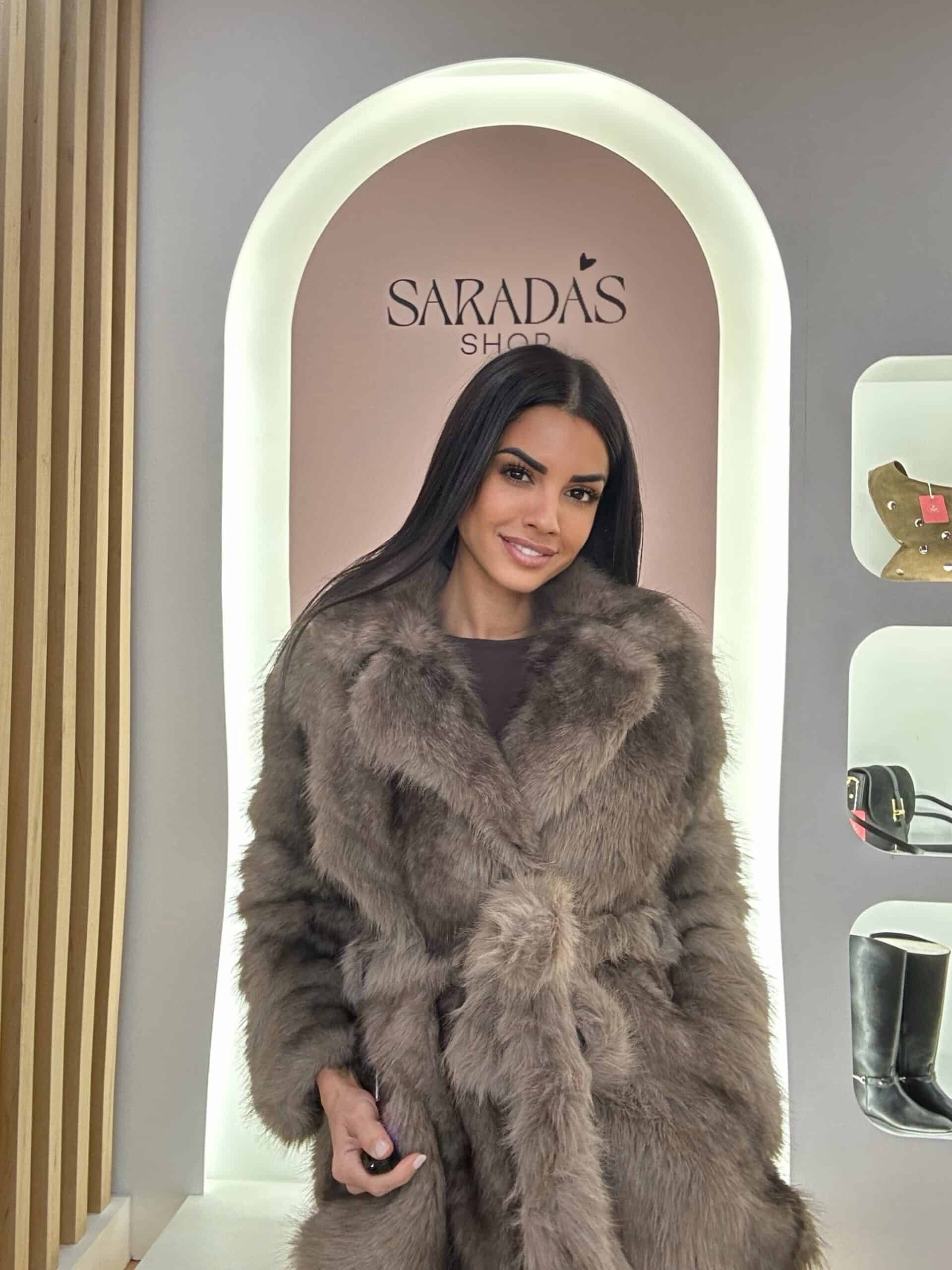 Abrigo de pelo en color taupe, cuello en solapa, cierre con dos botones de clic, bolsillos laterales, cintura con trabillas, con cinturón de nudo en mismo color y textura. Totalmente forrada.