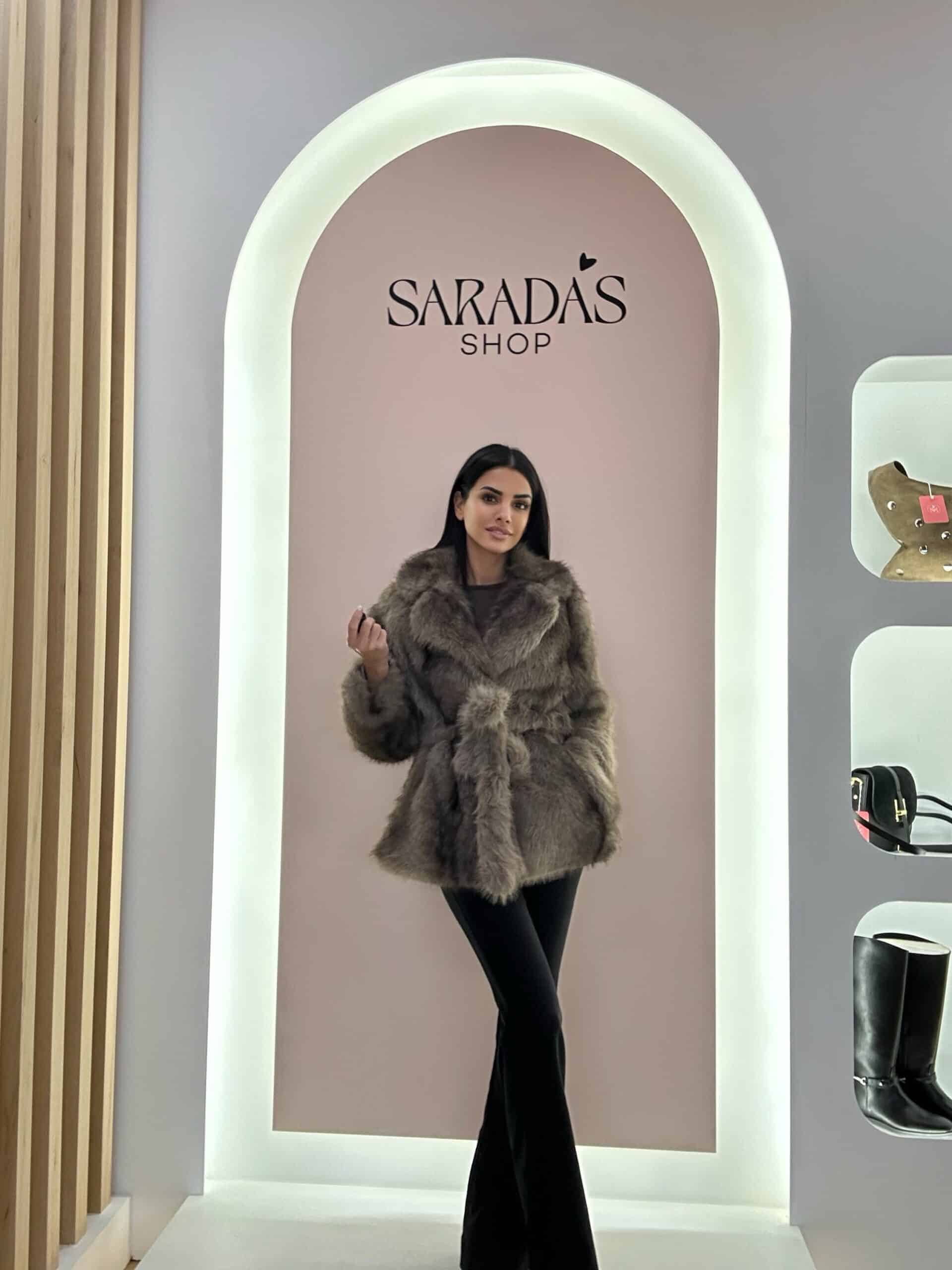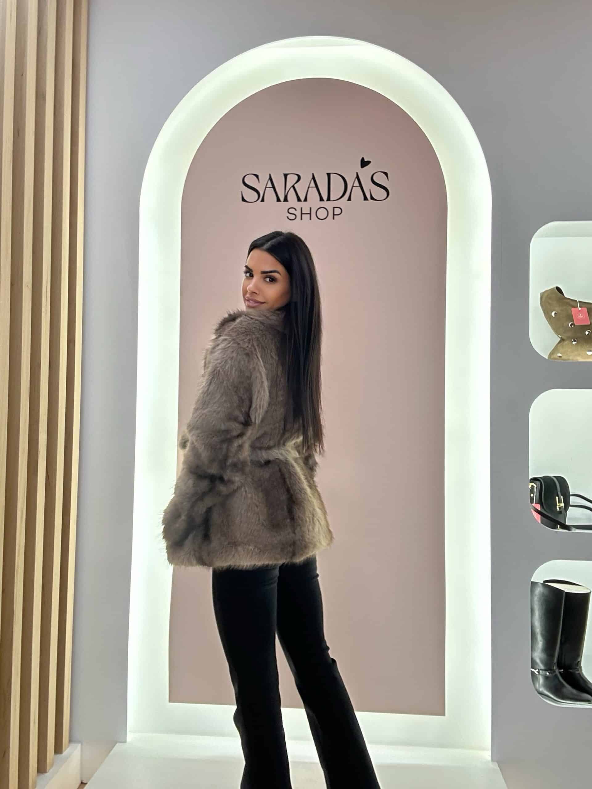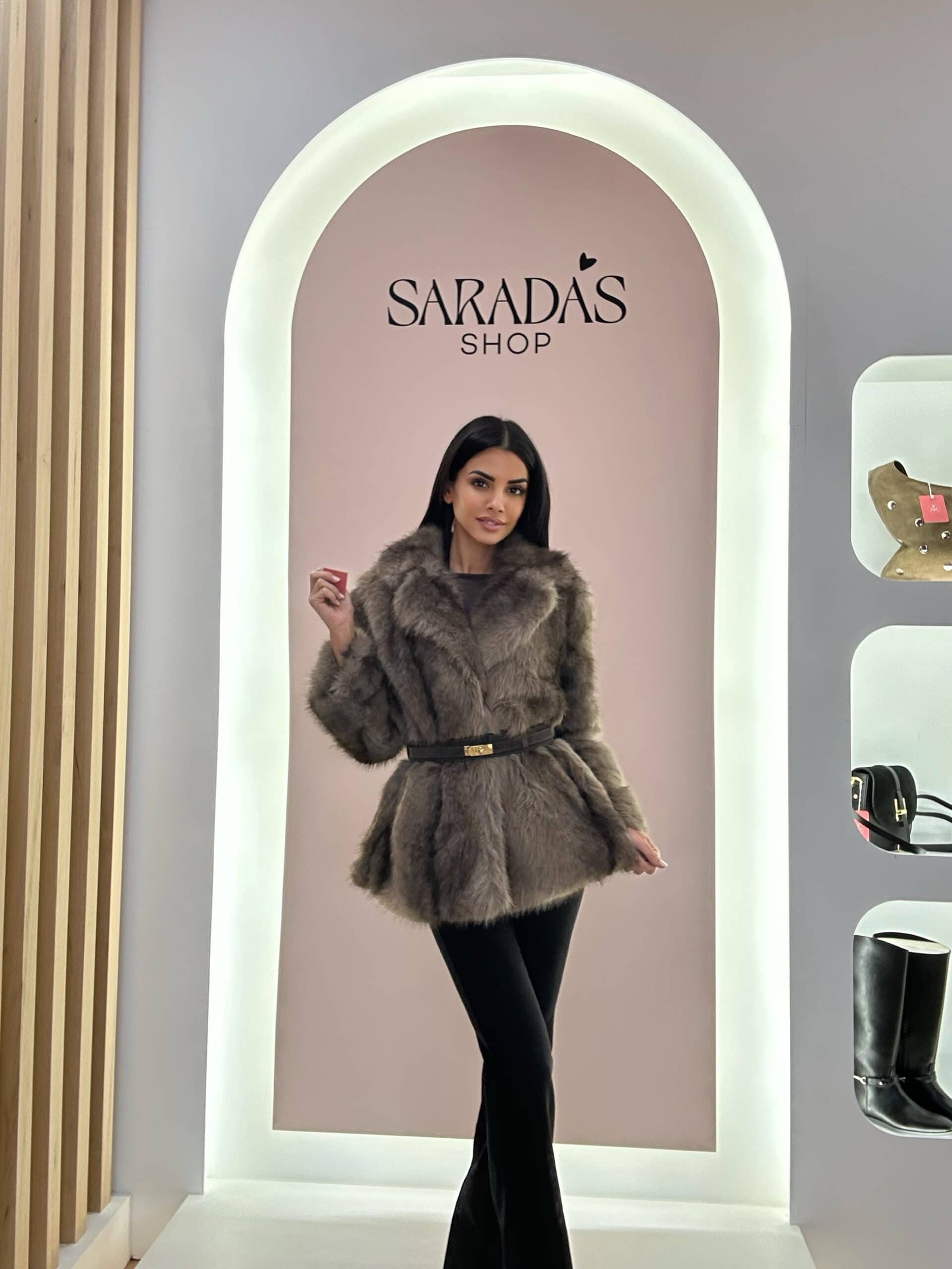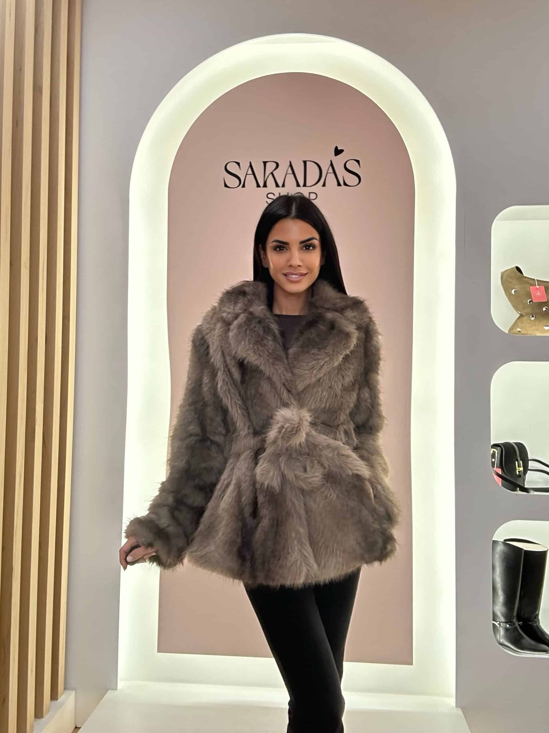 Abrigo de pelo en color taupe, cuello en solapa, cierre con dos botones de clic, bolsillos laterales, cintura con trabillas, con cinturón de nudo en mismo color y textura. Totalmente forrada.