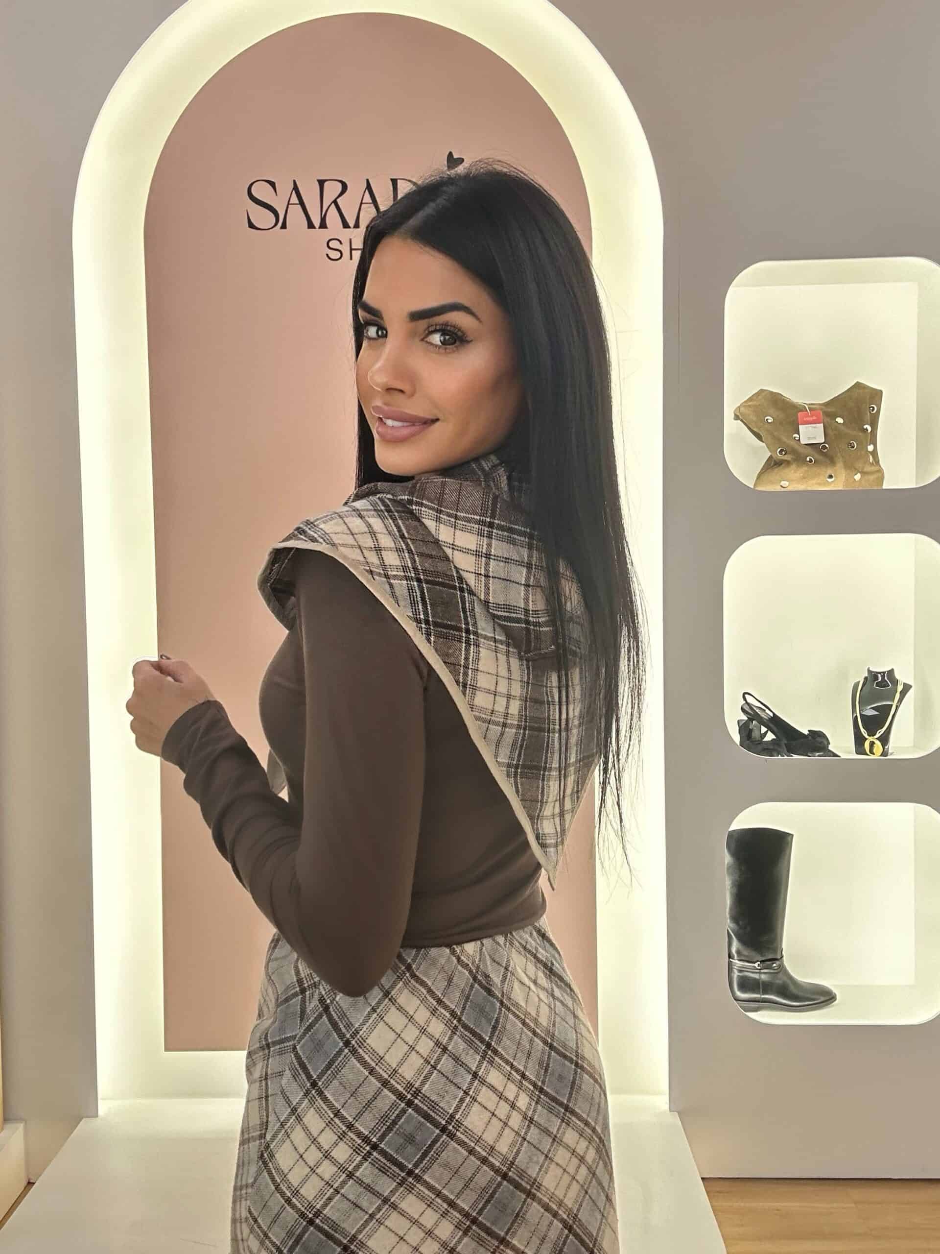 Balaclava estampada de cuadros en tonos crema, chocolate y azul grisáceo, detalle anudado delantero. Diseño Italiano. 70%Algodón. 25%Poliéster. 5%Elastan.