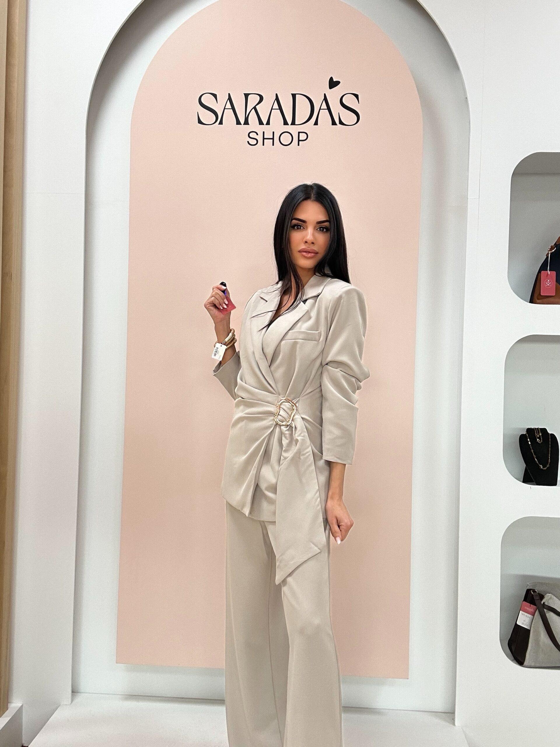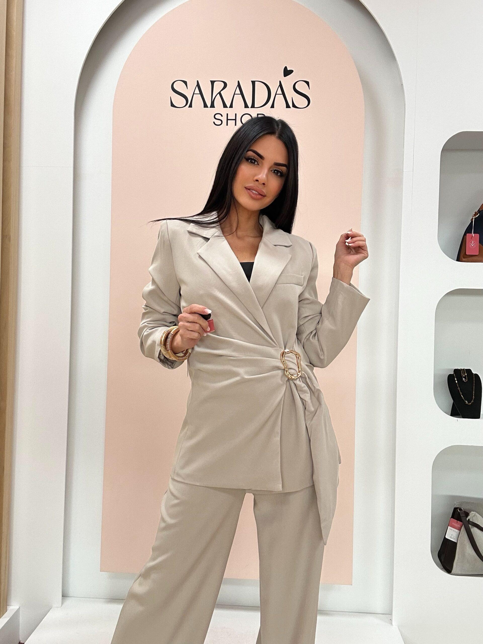 Blazer cruzada en color topo, cuello en solapa, falsos bolsillo en pecho, corte recto, hombreras, detalle de hebilla dorada para cinturón integrado cruzado, totalmente forrada.