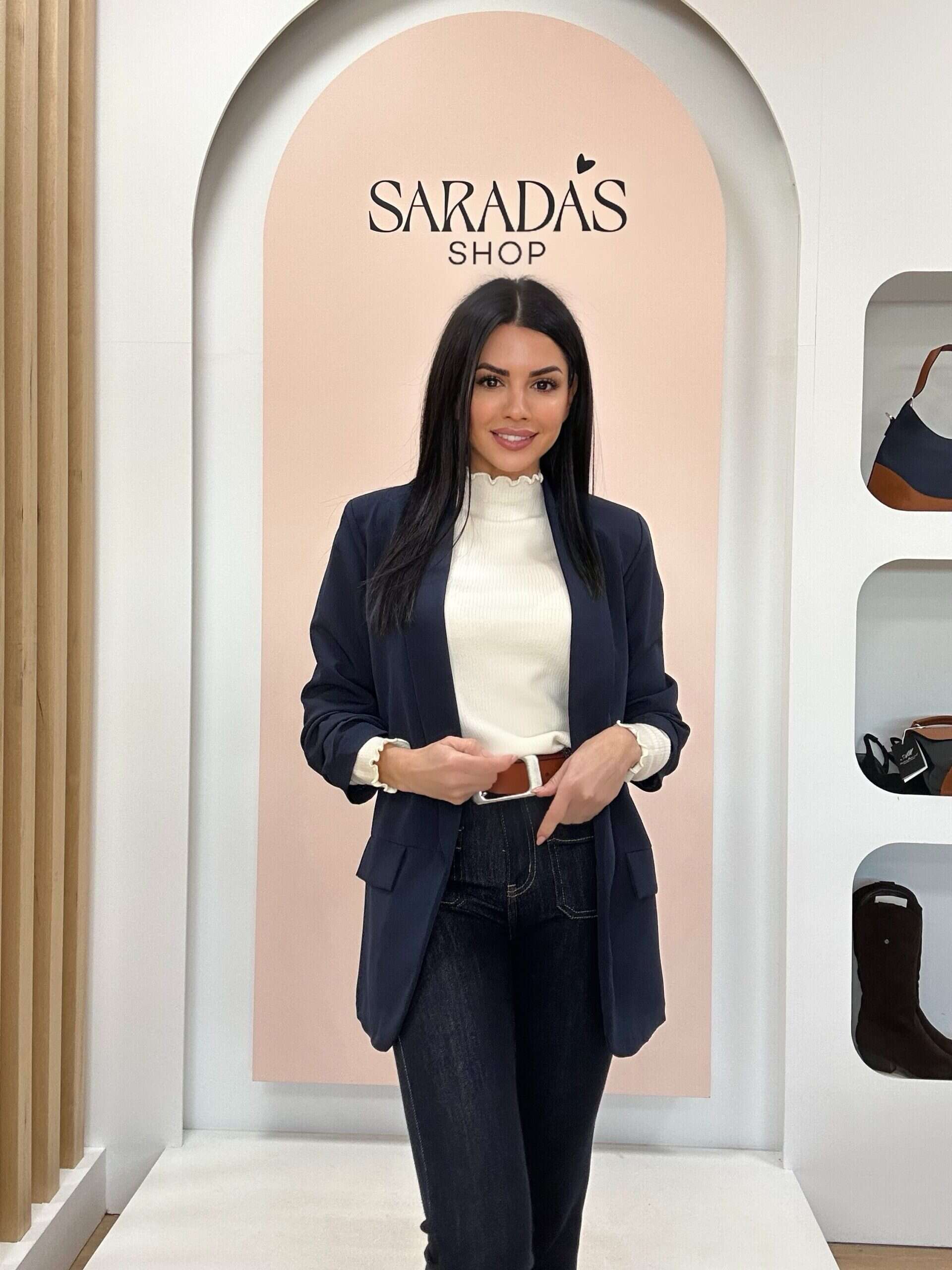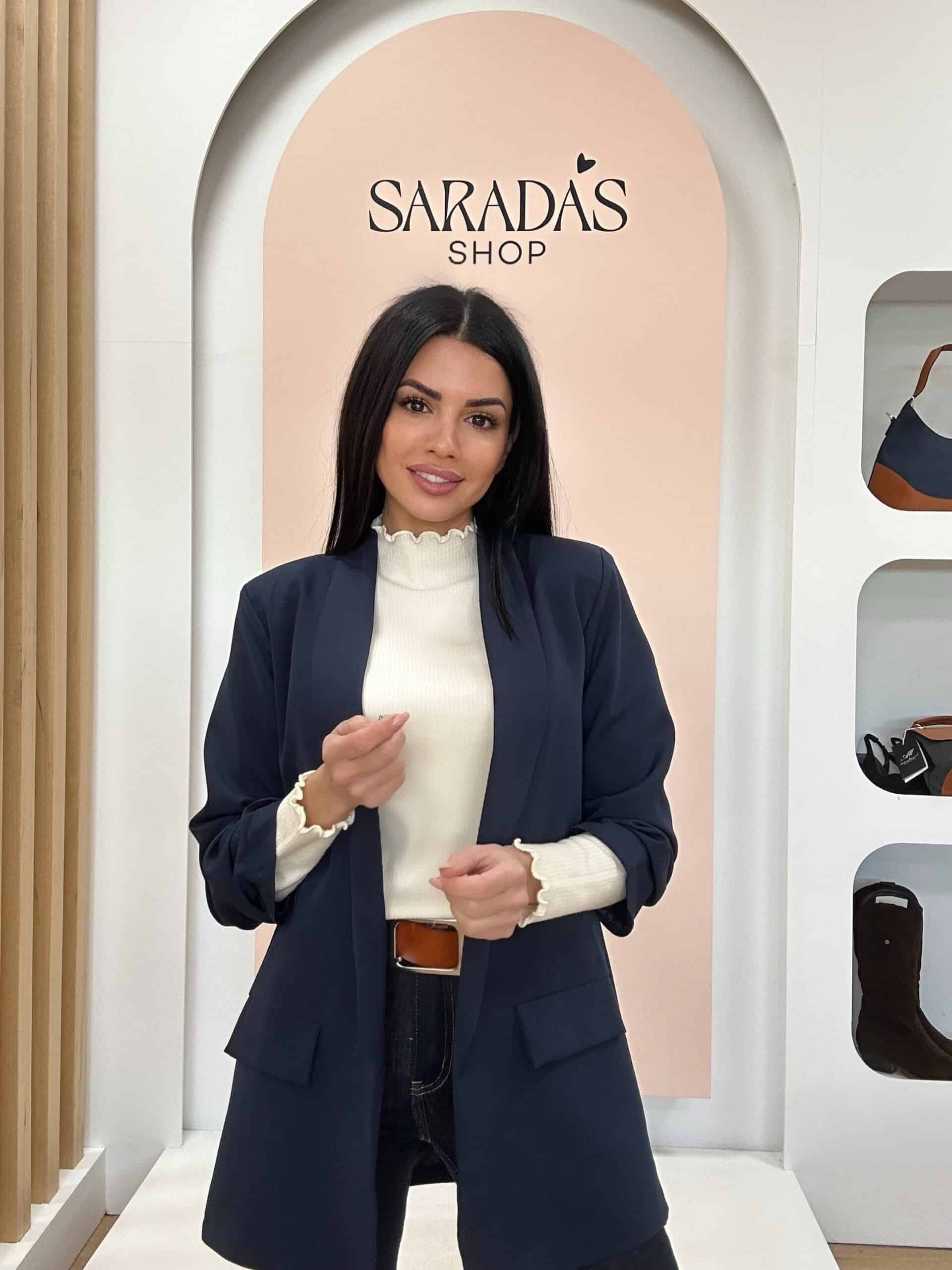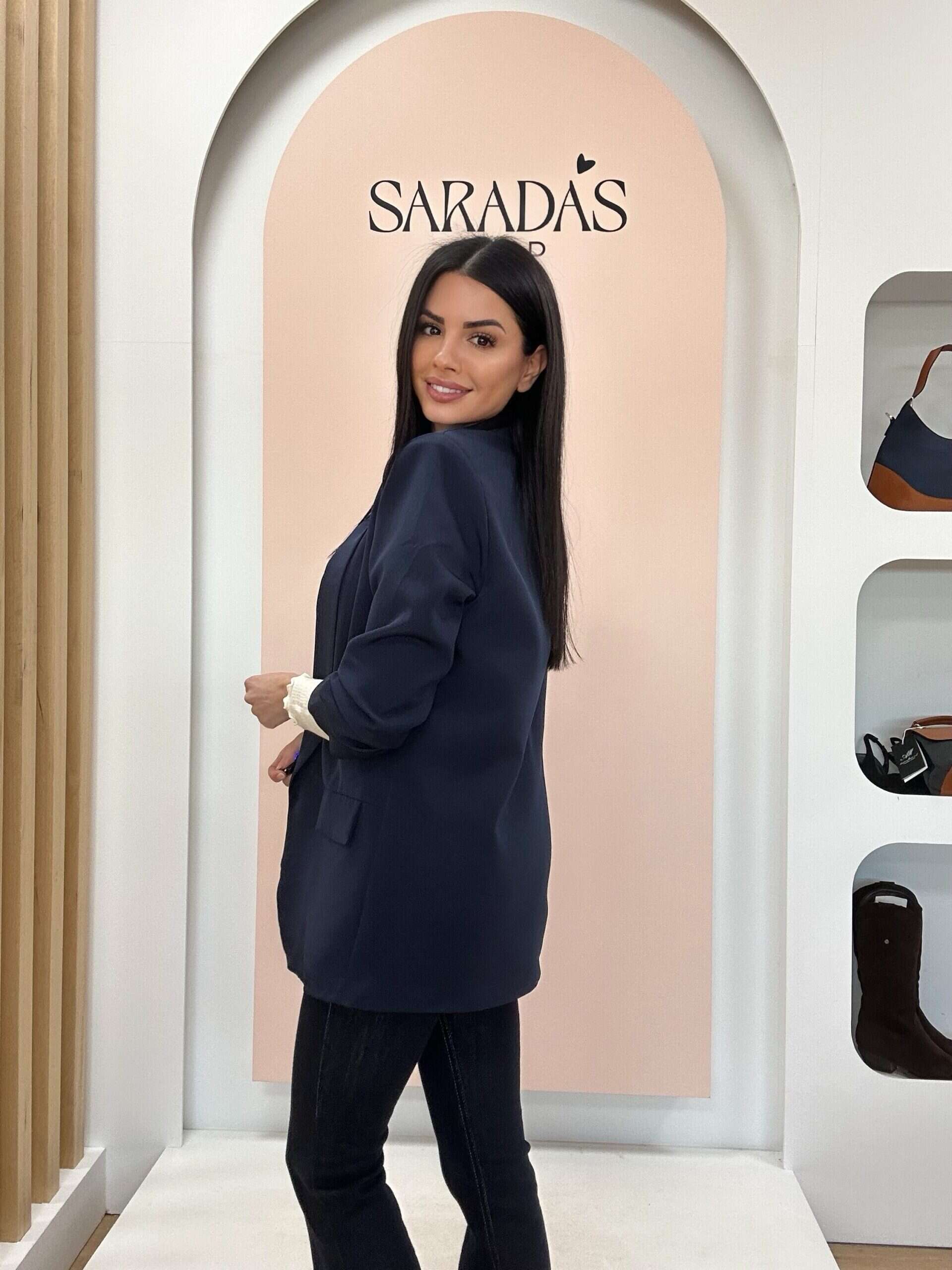 Blazer en color azul marino, cuello en solapa, falsos bolsillos con solapa laterales, corte recto, totalmente forrada, detalle de fruncido en la manga. Diseño Italiano.