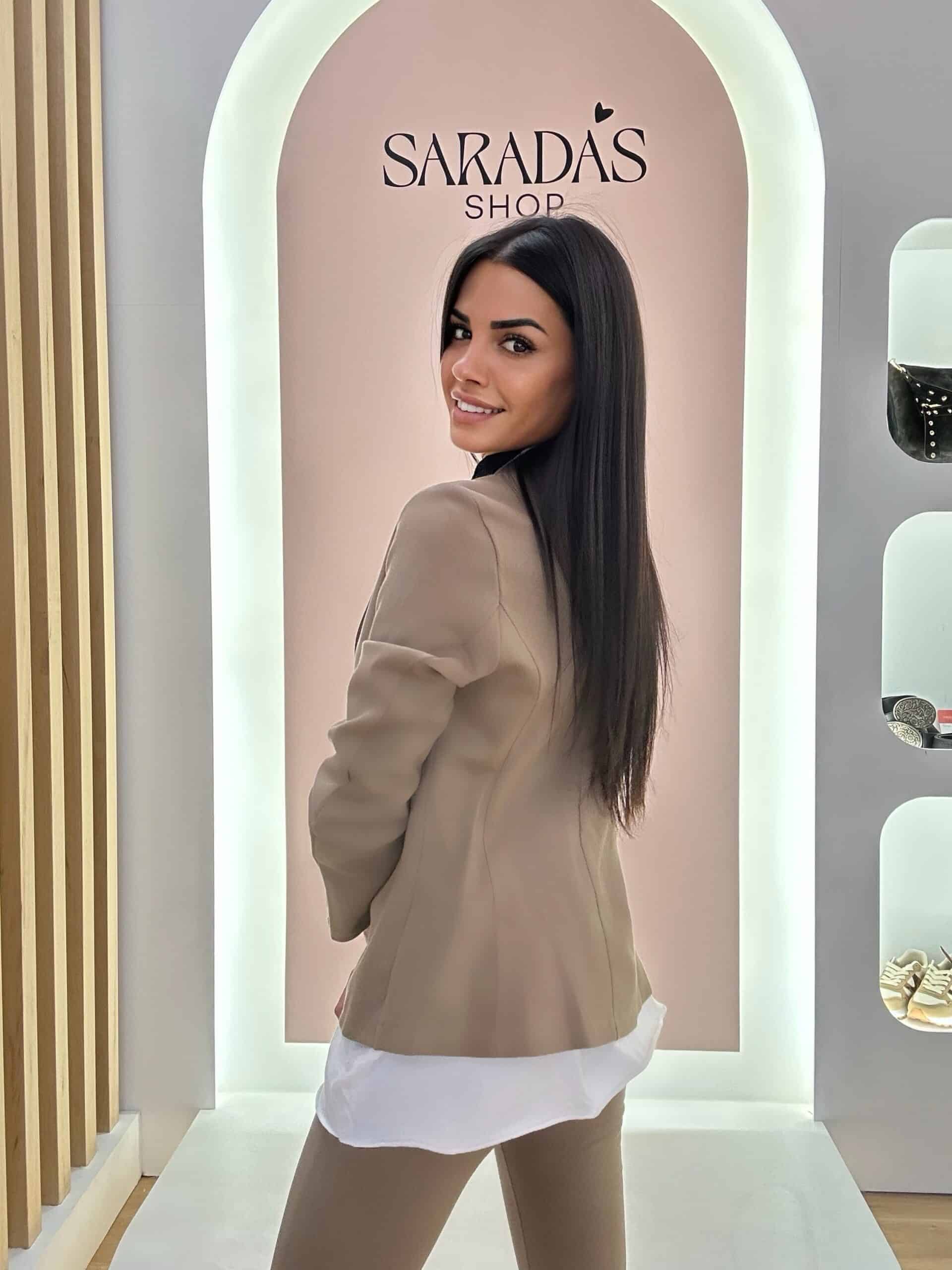 Blazer en mezcla de color taupe, cuello en solapa, falsos bolsillos laterales, botón central. Diseño Italiano. Elige tu talla: S/34-36, M/36-38, L/38-40. 65%Viscosa. 32%Nylon. 3%Elastano.