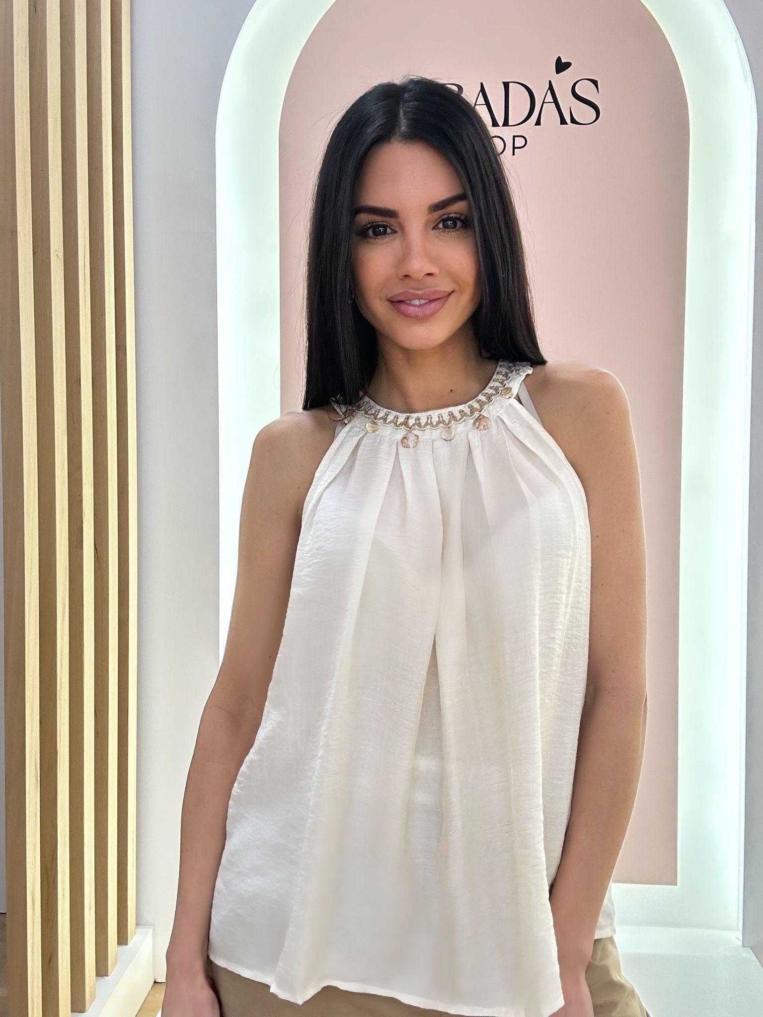 Blusa en color blanco roto, sin mangas, cuello redondo y botonadura de ojal elástico en el mismo, detalle de bordado en cuello con conchas colgando. Elige tu talla: S/34-36, M/38, L/40 82%Rayón. 15%Nylon. 3%Lino.