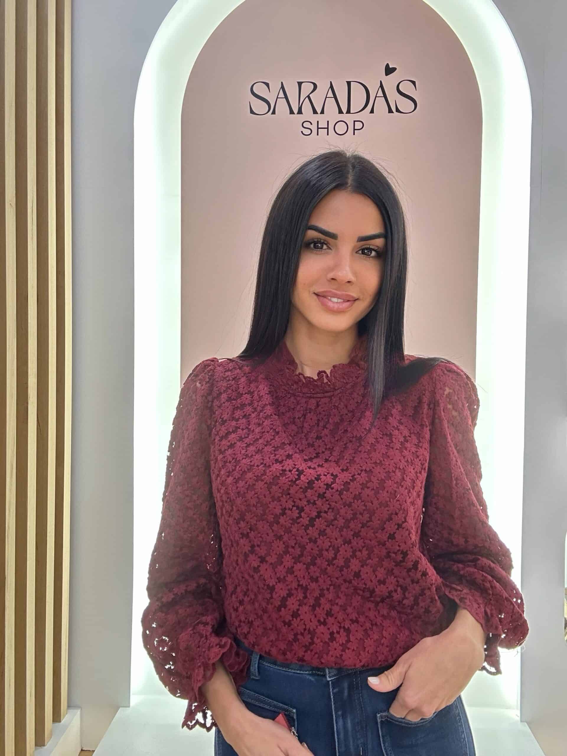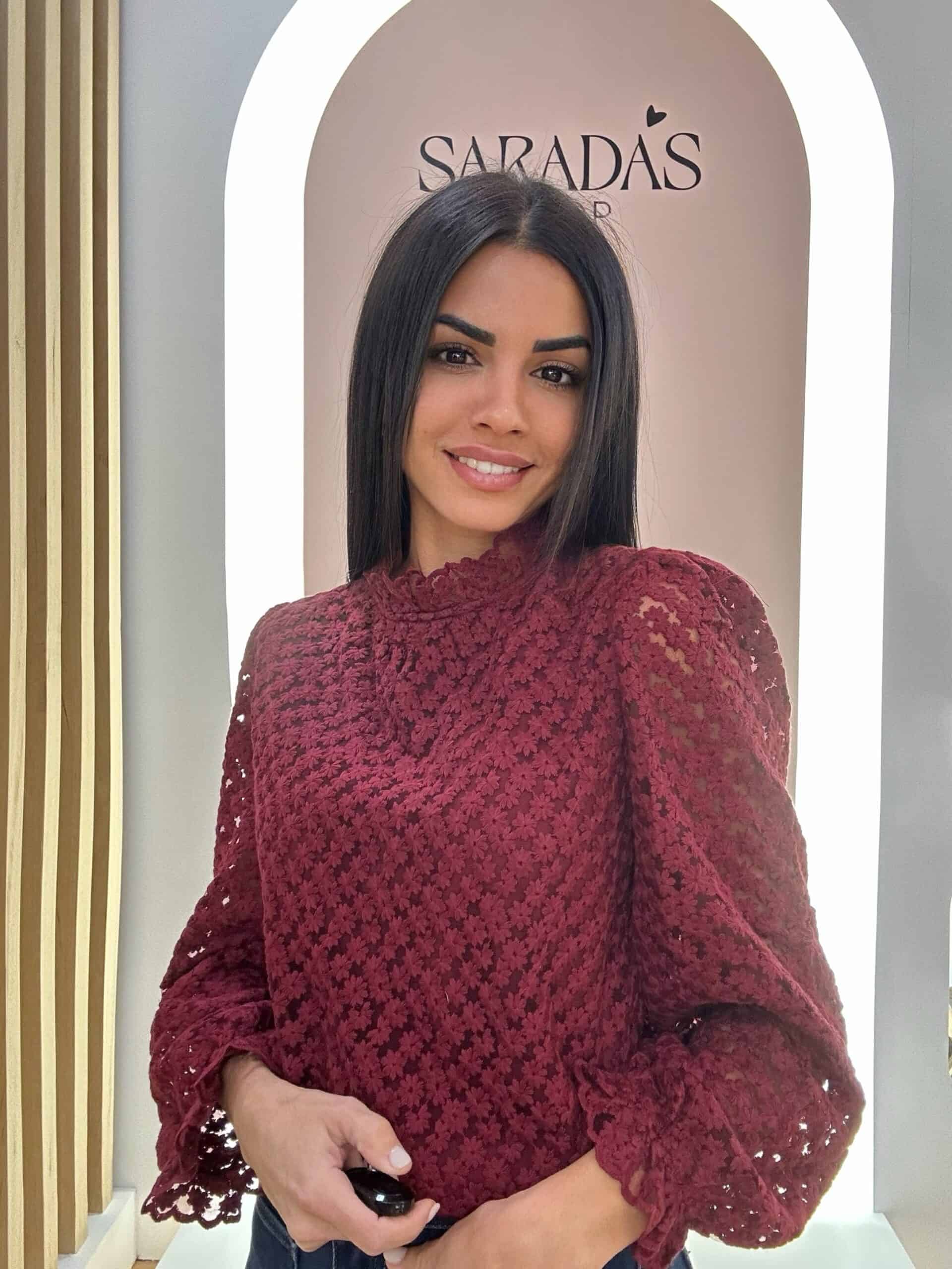 Blusa de encaje floral en color burdeos, manga larga con volante en la muñeca, cuello redondo con detalle de pequeño volante en el mismo, corte recto, cierre trasero con botón en cuello con ojal elástico, forro interior en parte delantera.