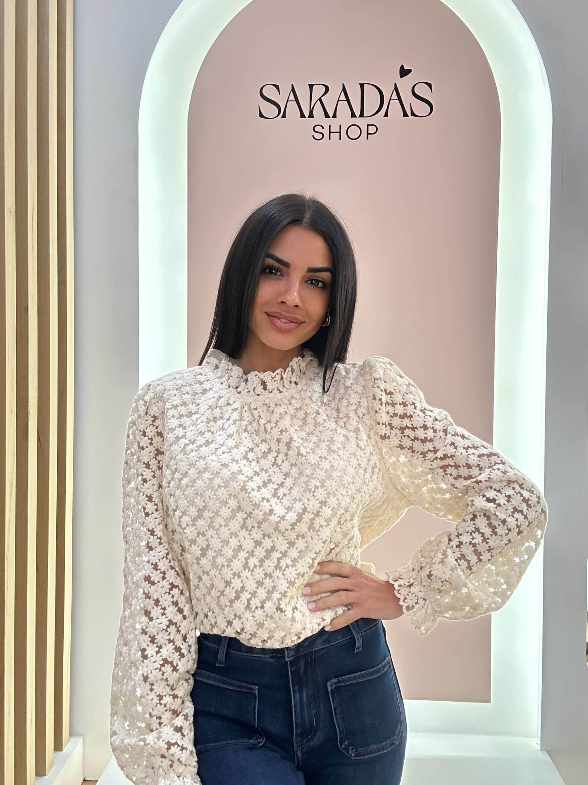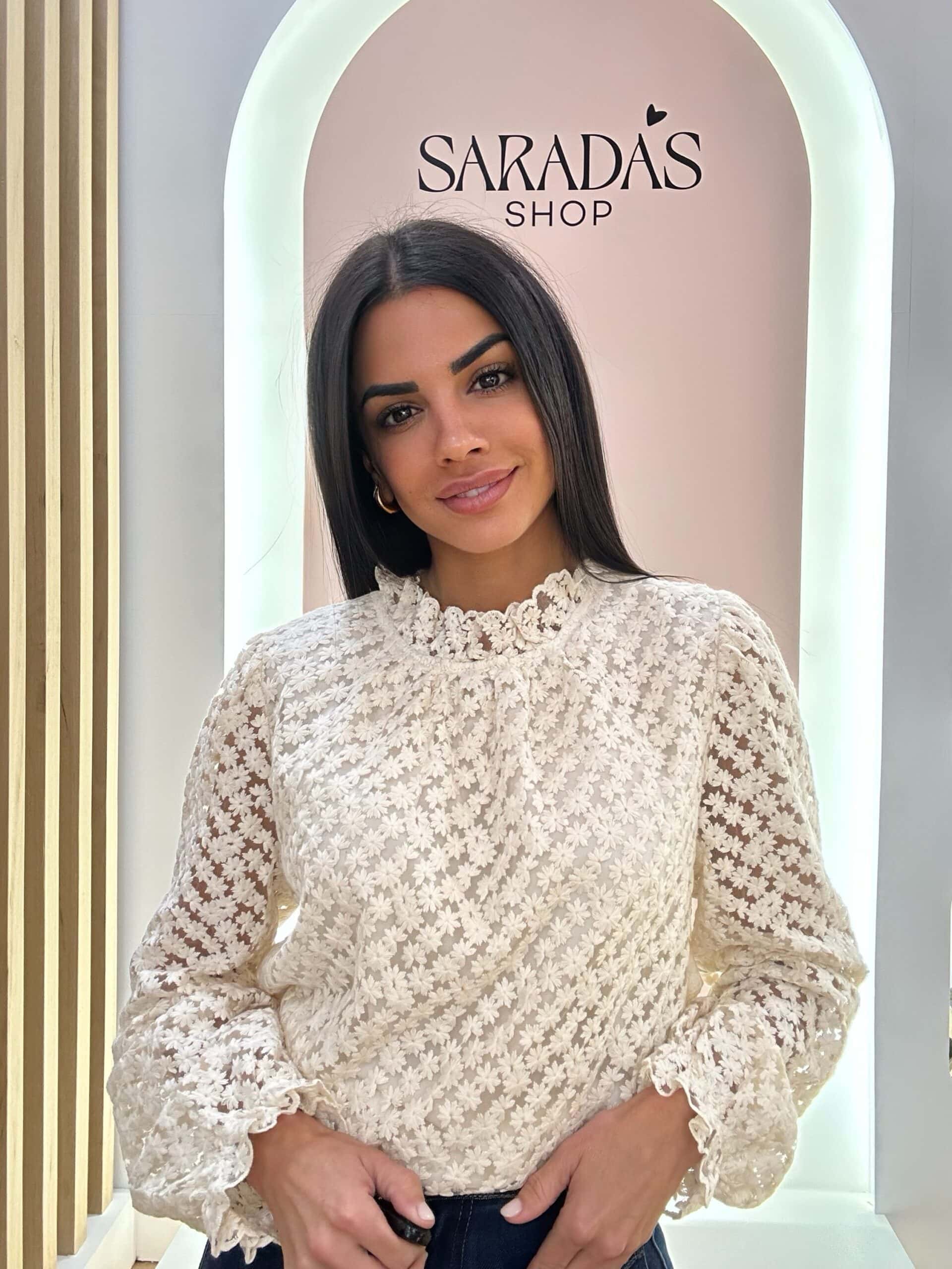 Blusa de encaje floral en color crema, manga larga con volante en la muñeca, cuello redondo con detalle de pequeño volante en el mismo, corte recto, cierre trasero con botón en cuello con ojal elástico, forro interior en parte delantera.