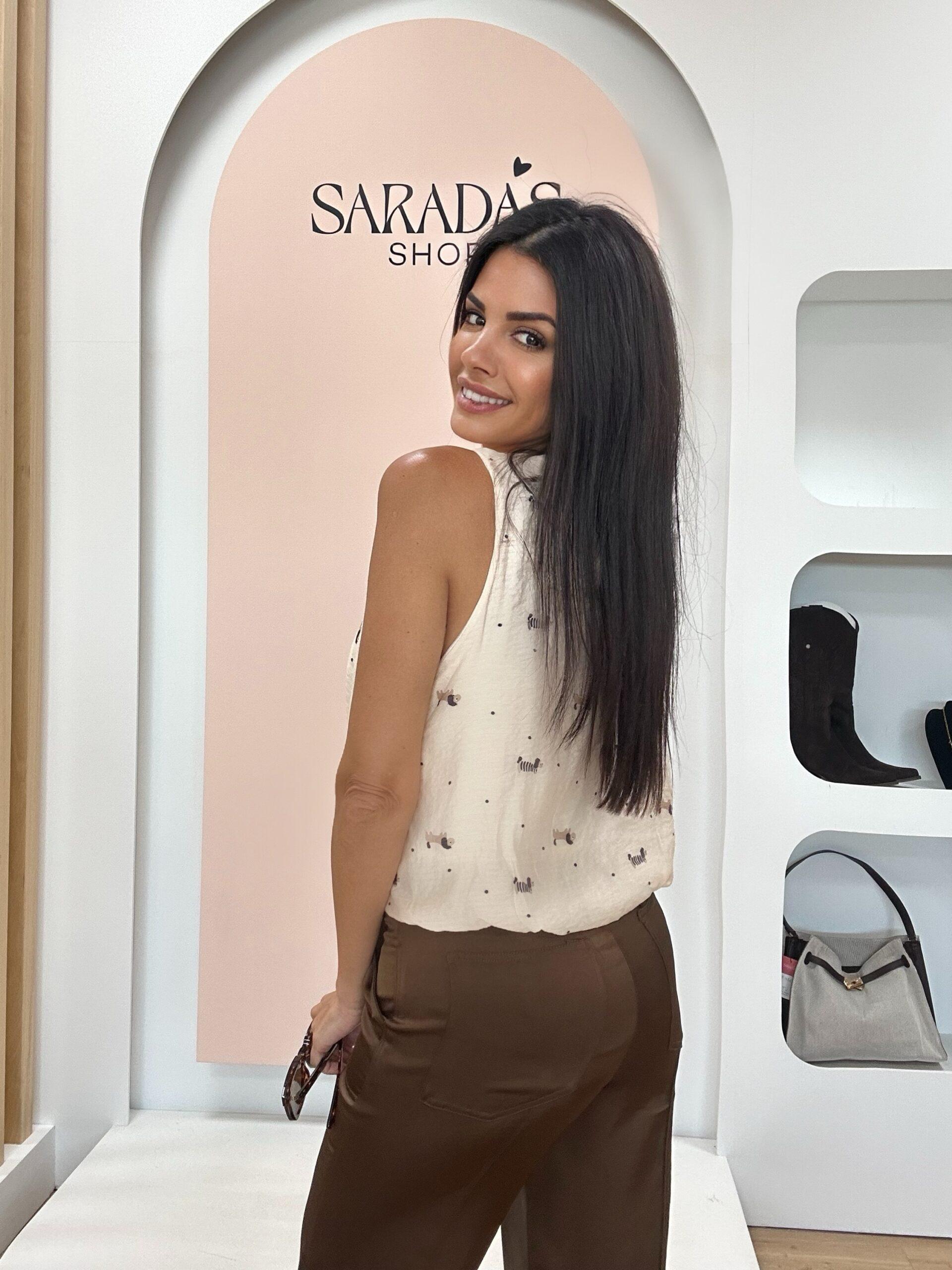 Blusa en color blanco roto con estampado de perritos, sin mangas, cuello redondo y botonadura de ojal elástico en el mismo, detalle de elástico en cintura y forro interior. Diseño Italiano.