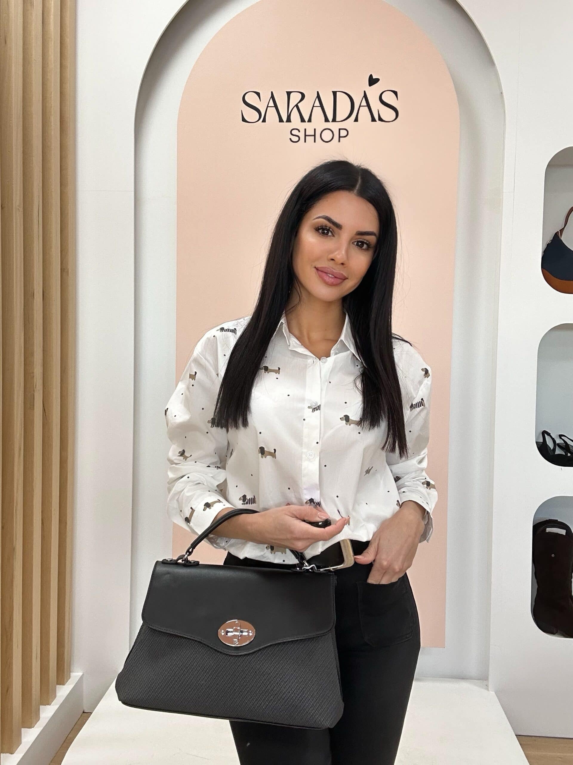 Bolso confeccionado en combinación de material de color negro, cierre con solapa y hebilla plateada, cremallera interior, forrado, doble compartimento con bolsillo con cremallera y distintos bolsillos interiores, bolsillo con cremallera trasero exterior, asa corta fija y asa larga extraible.