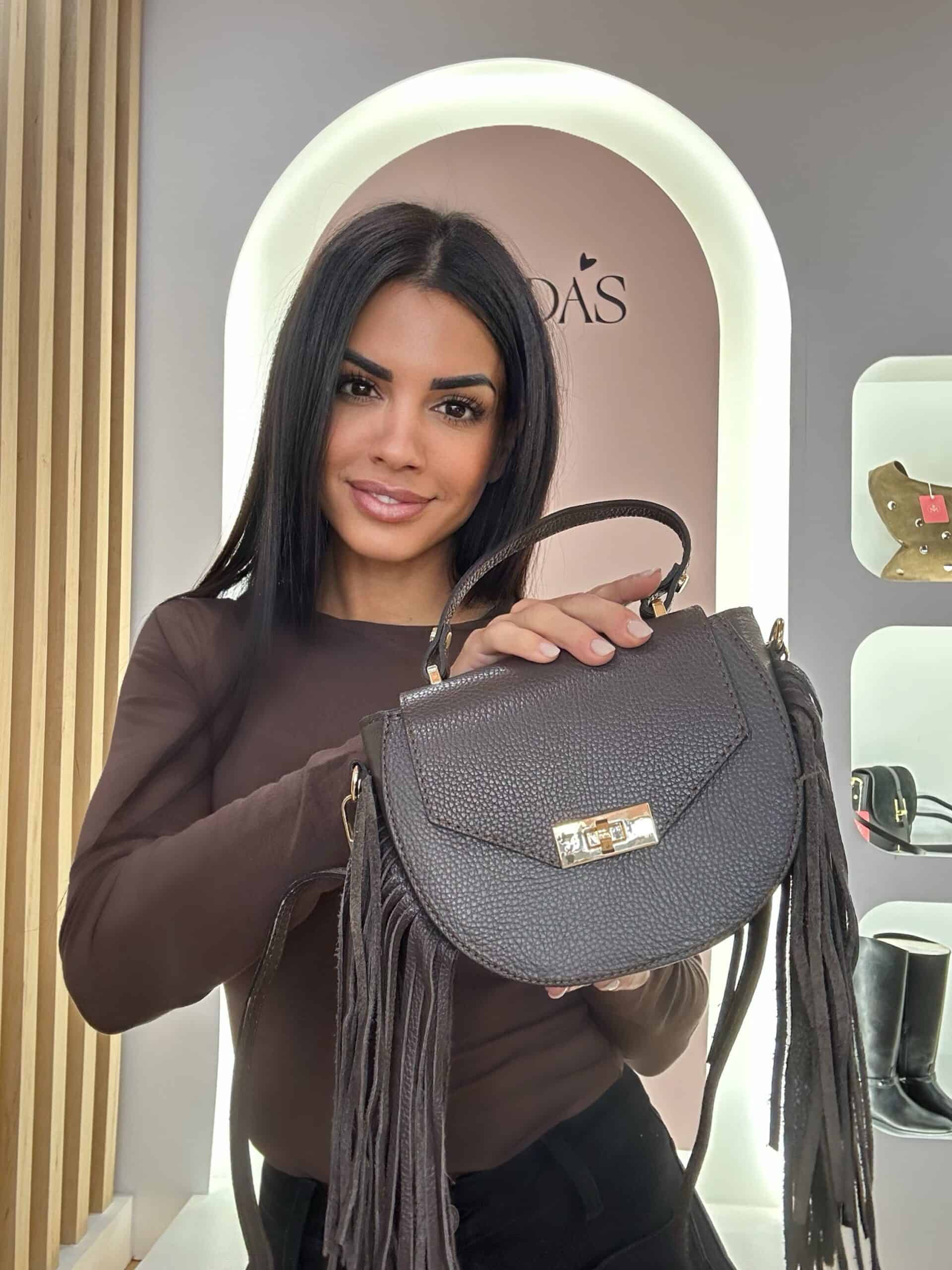 Bolso de piel, en color marrón chocolate, cierre con solapa y hebilla dorada mas cremallera, bolsillo interior, asa corta de mano y larga ajustable, con cierre de mosquetón. Detalle de flecos laterales. Genuine leather