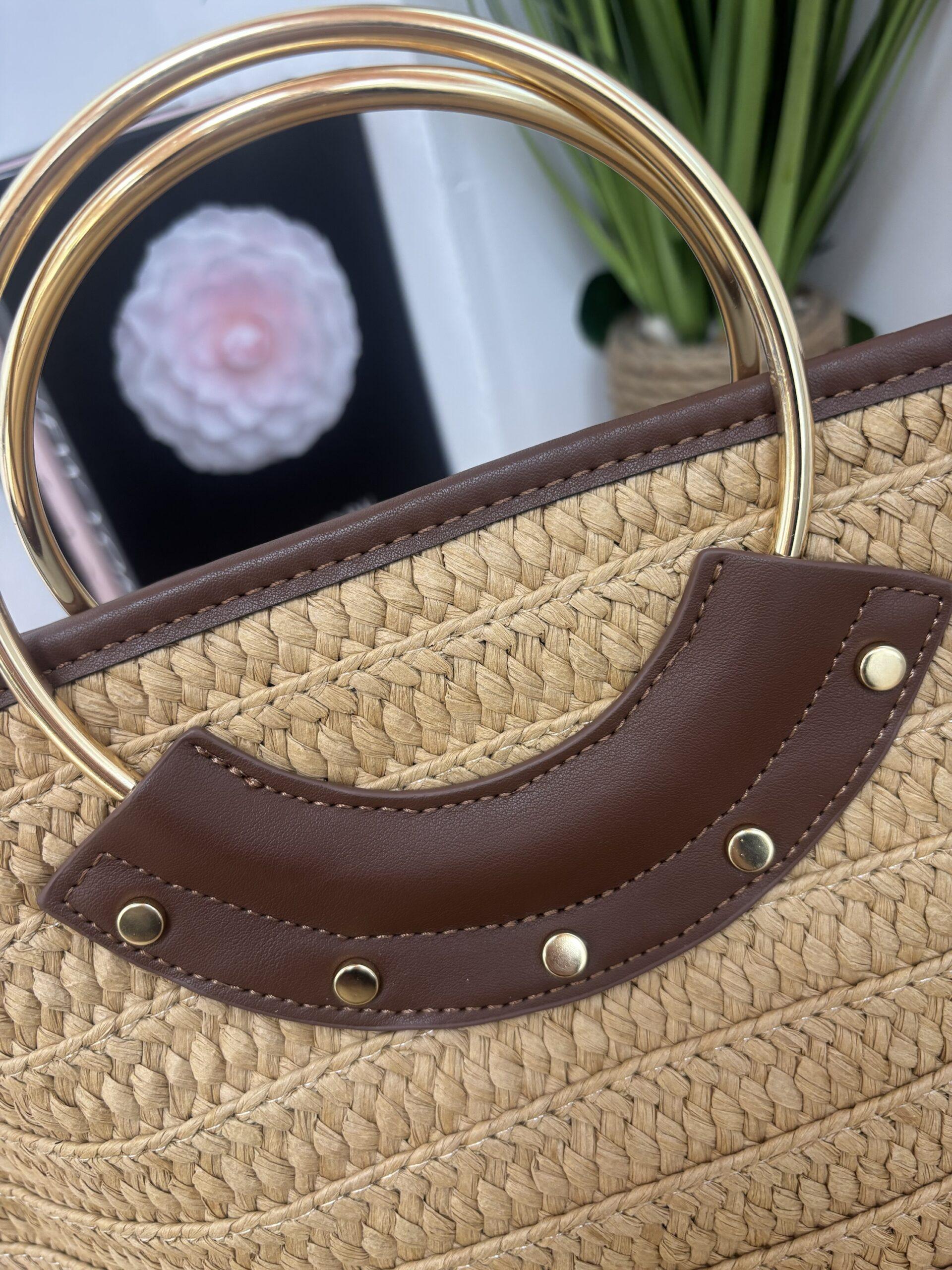 Bolso en rafia, cierre con cremallera, interior forrado con bolsillos interiores, detalle de asa corta fija de aro dorado y polipiel en marrón con tachuelas, incluye asa larga extraible ajustable.