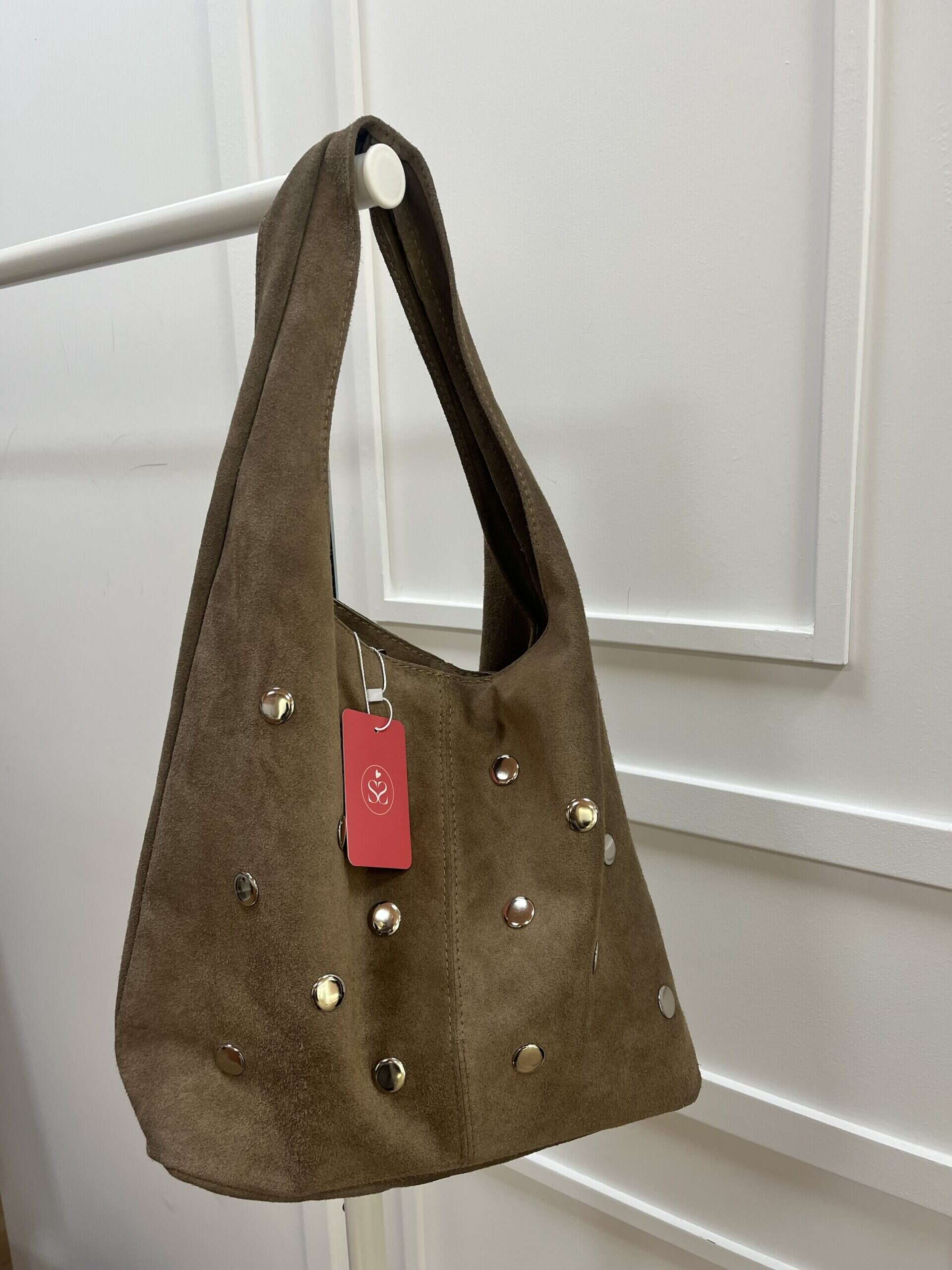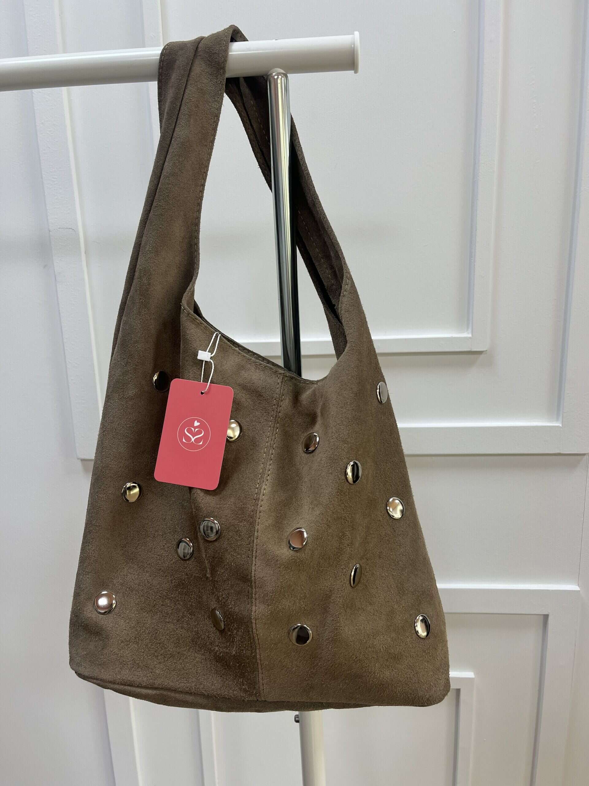 Bolso shopper de piel en ante, de color taupe, cierre con cremallera, detalle de tachuelas en color plateado. Genuine leather.