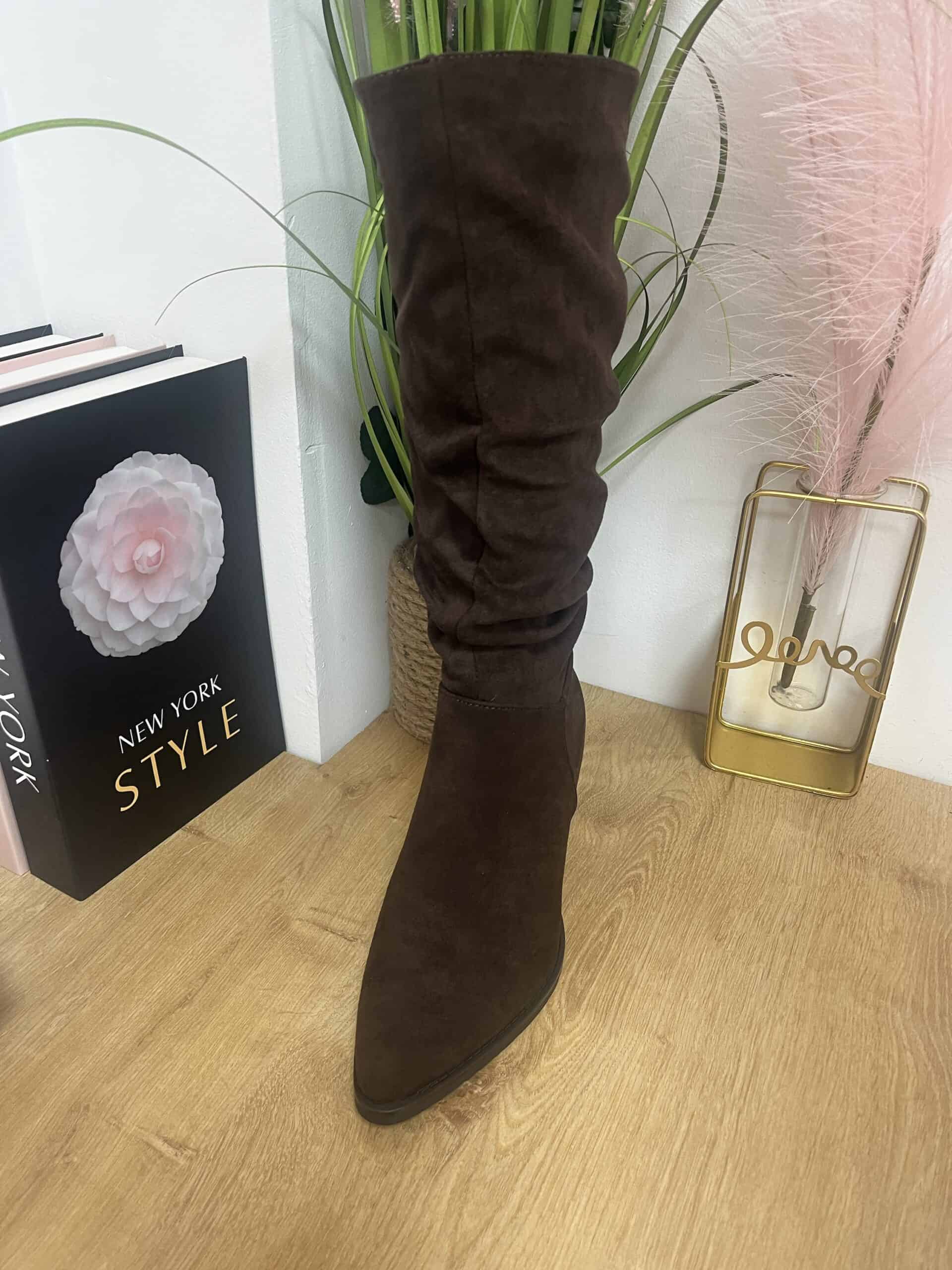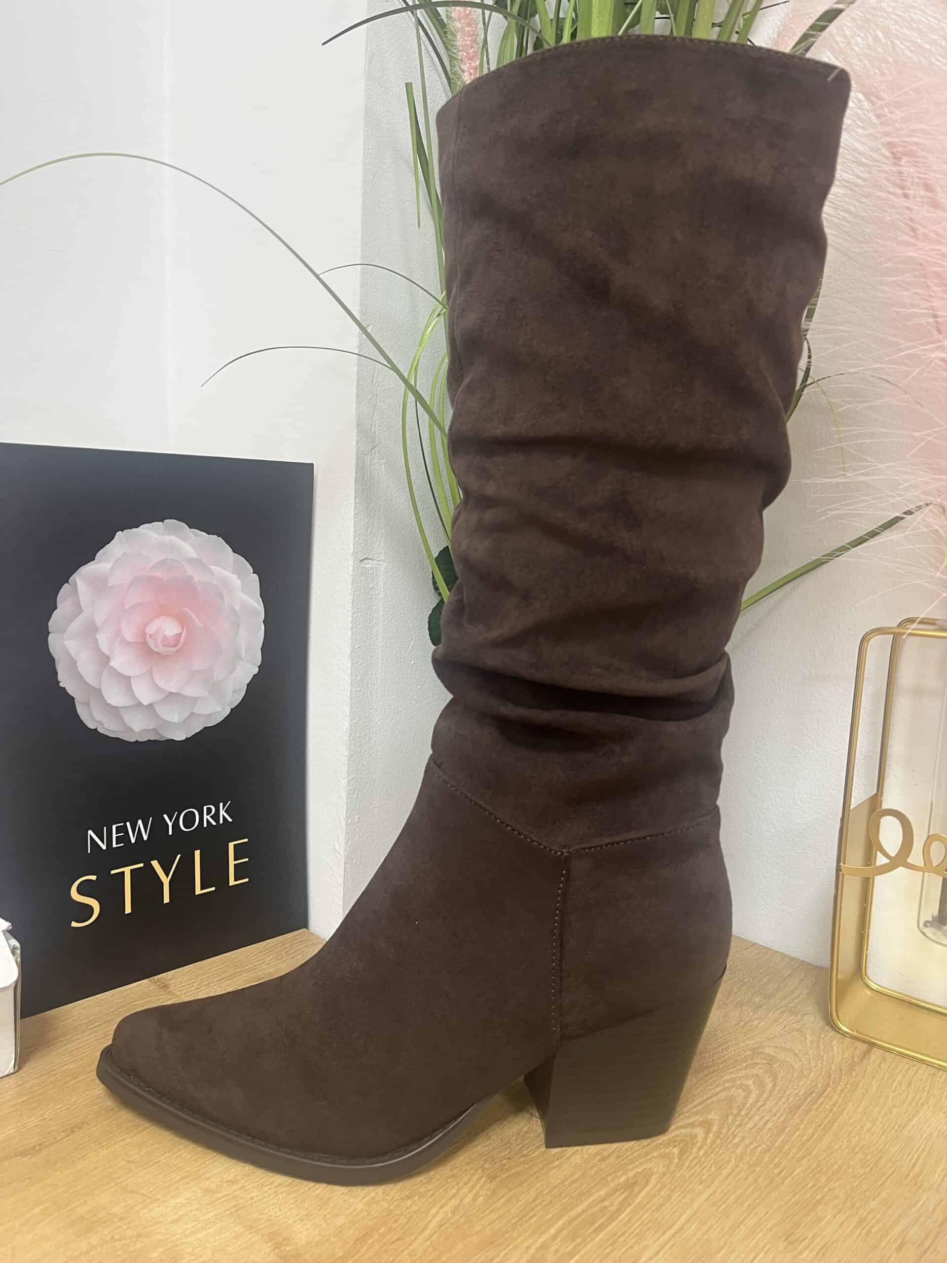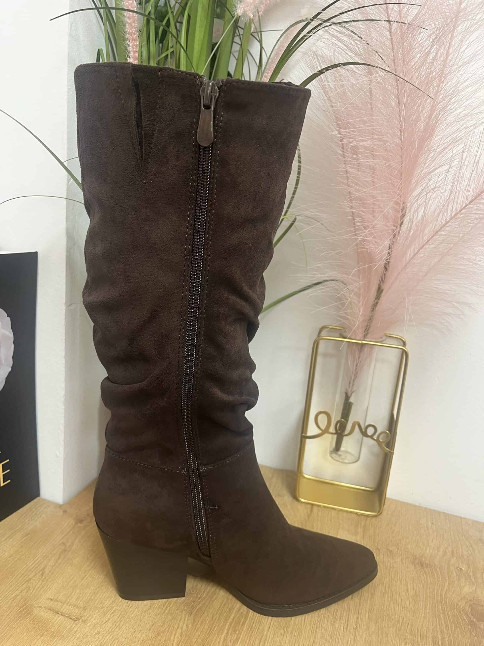 Botas tipo cowboy en serraje de color marrón chocolate, caña alta, cierre con cremallera lateral interior, detalle de elástico en caña, acabado en punta, tacón grueso.