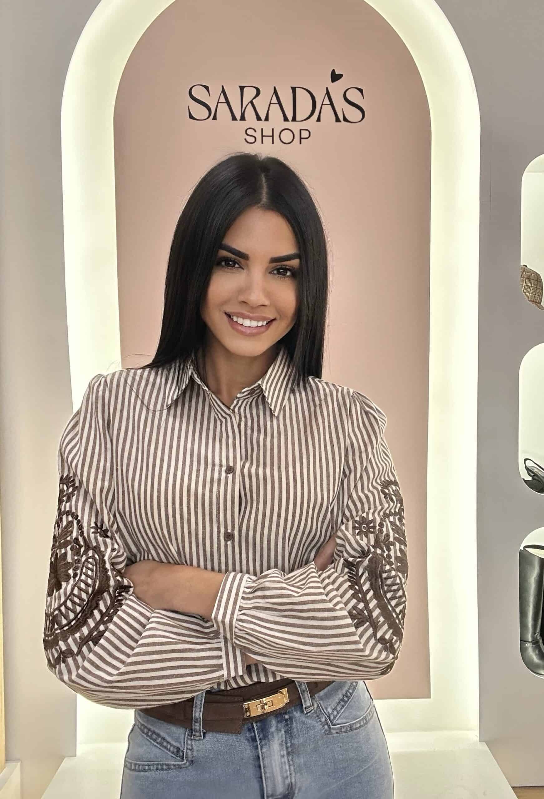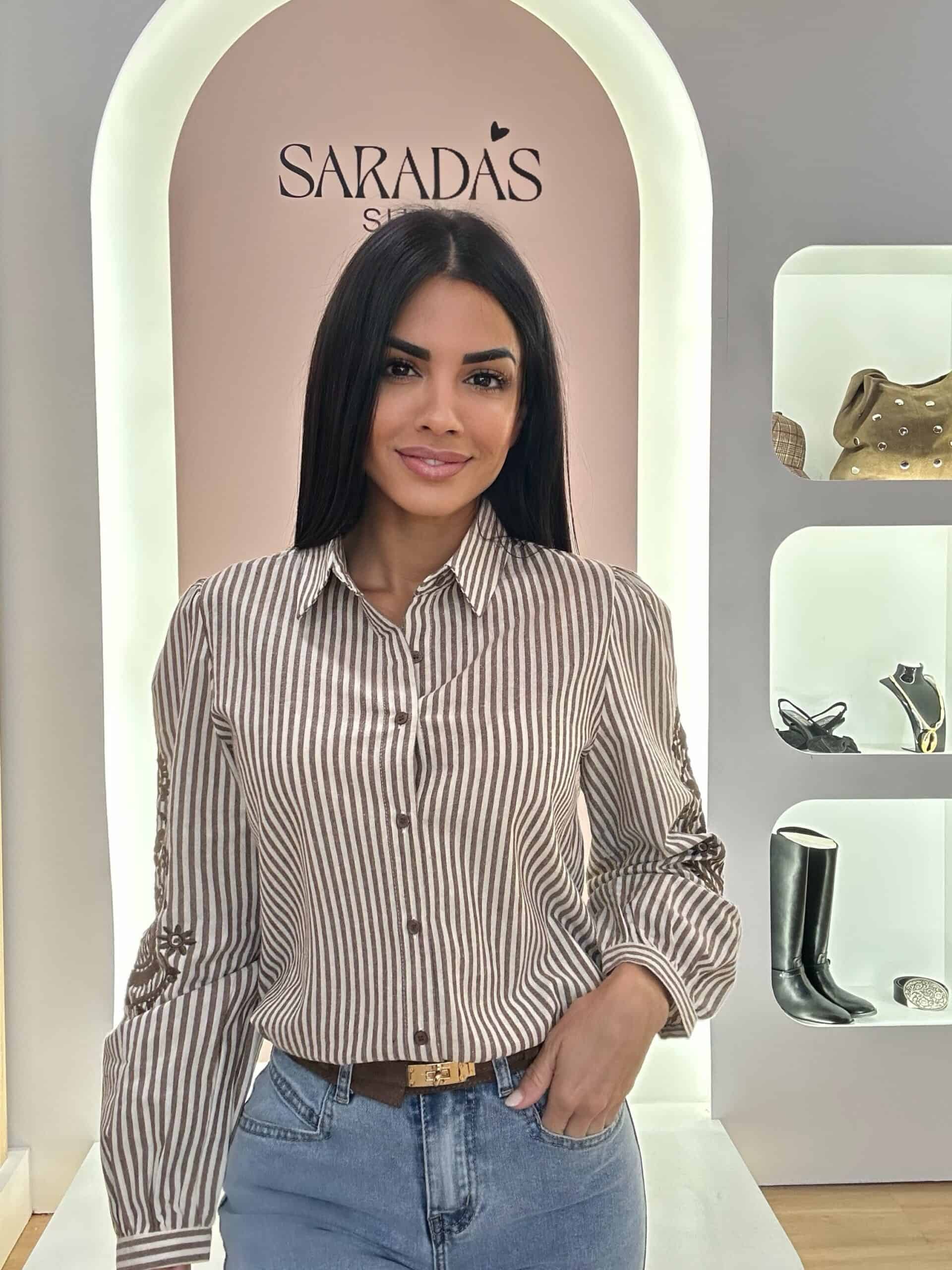 Camisa en algodón, con estampado de rayas marrones, cuello en solapa, botonadura central de cierre con ojal con botones y detalle de bordado en mangas en color marrón. Elige tu talla: S/34-36, M/36-38, L/38-40, XL/40-42 100%Algodón.