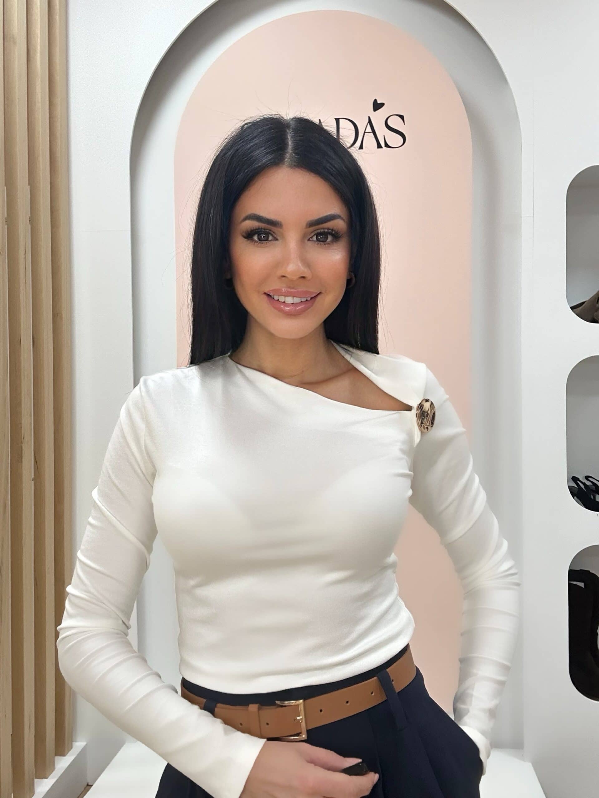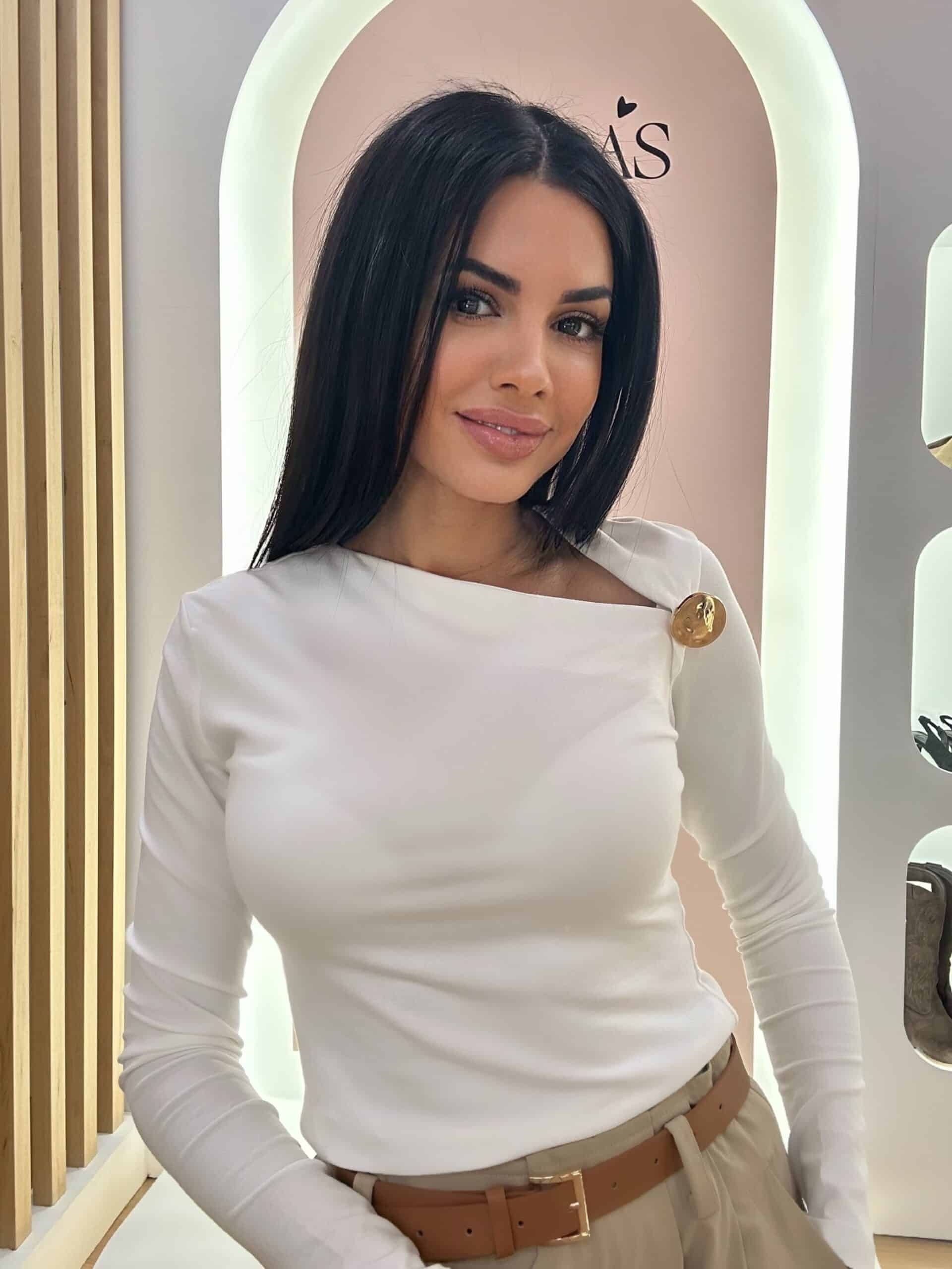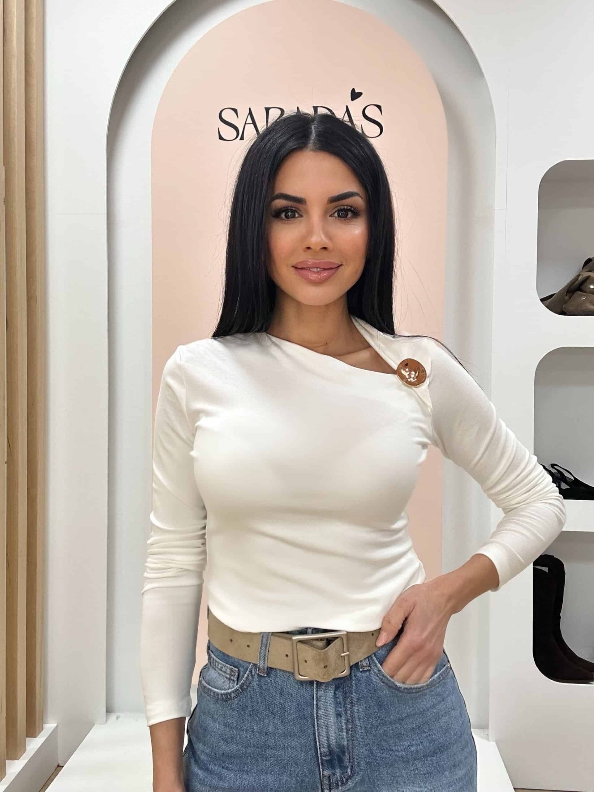 Camiseta en mezcla de algodón, de color blanco, cuello con escote asimétrico, manga larga, detalle de broche redondo en color dorado.
