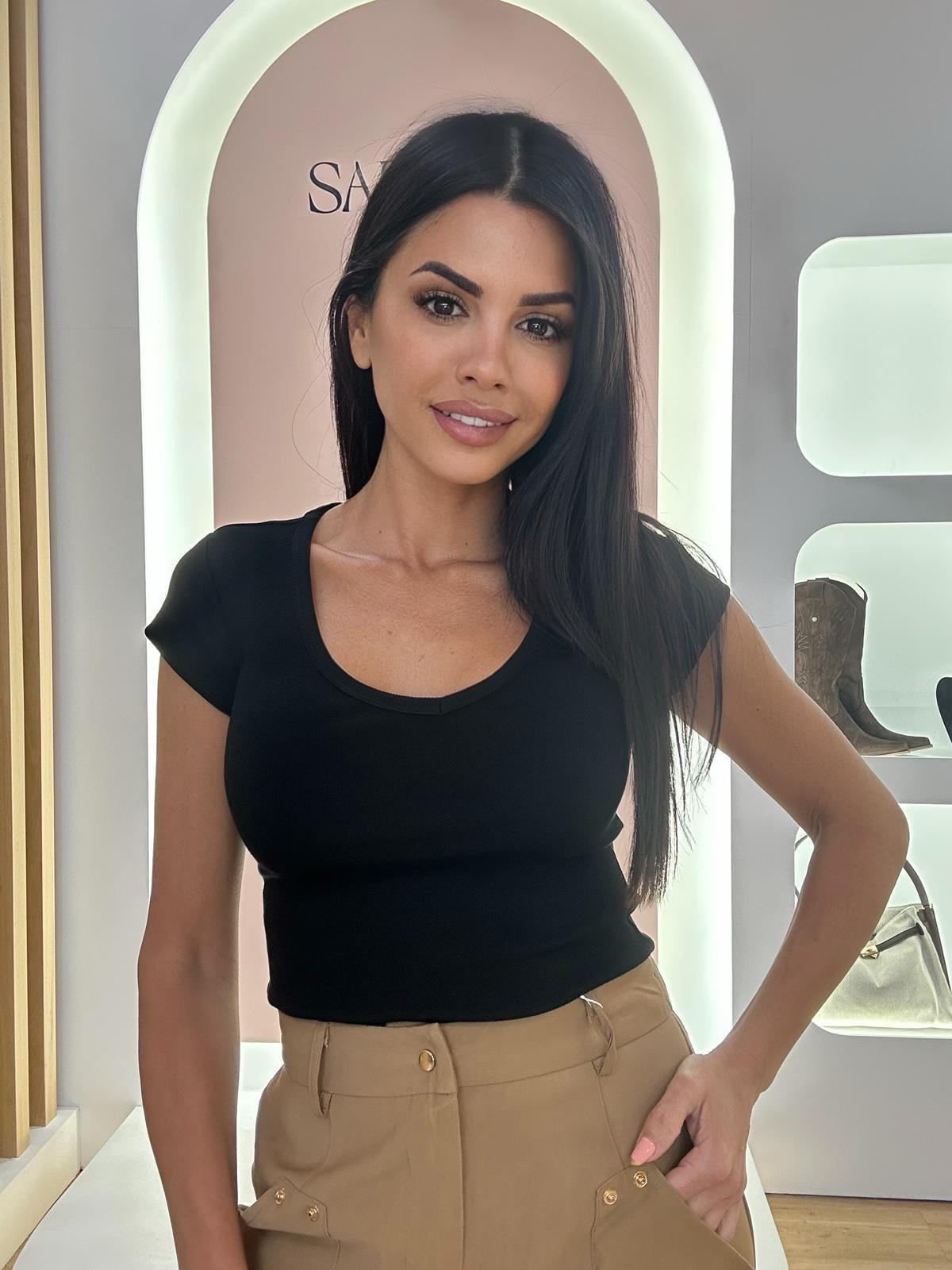 Camiseta en algodón de manga corta en color negro, acanalada, cuello en pico. Elige tu talla: S/M(34/36), M/L(36/38) 94%algodón. 6%Elastano.