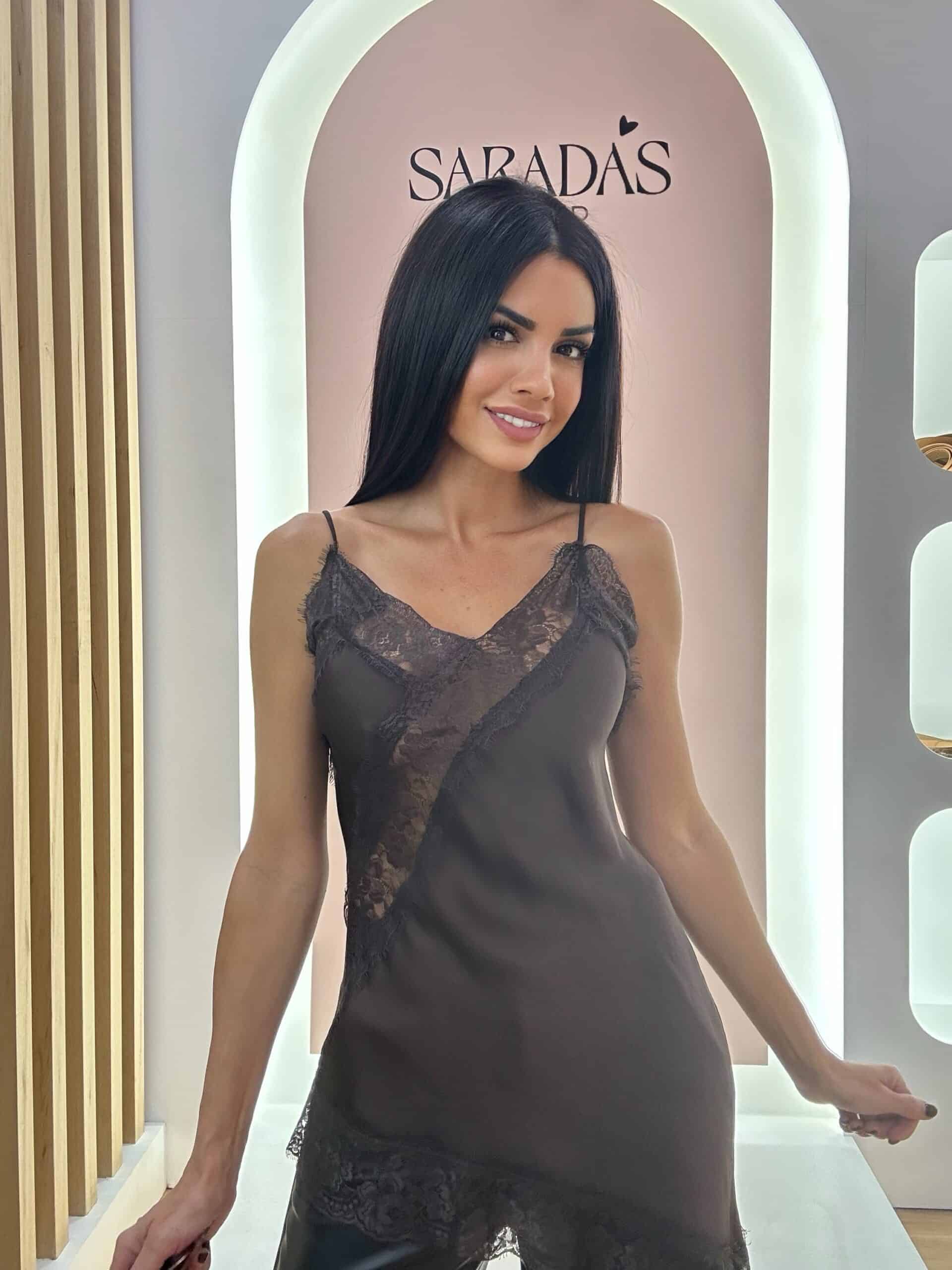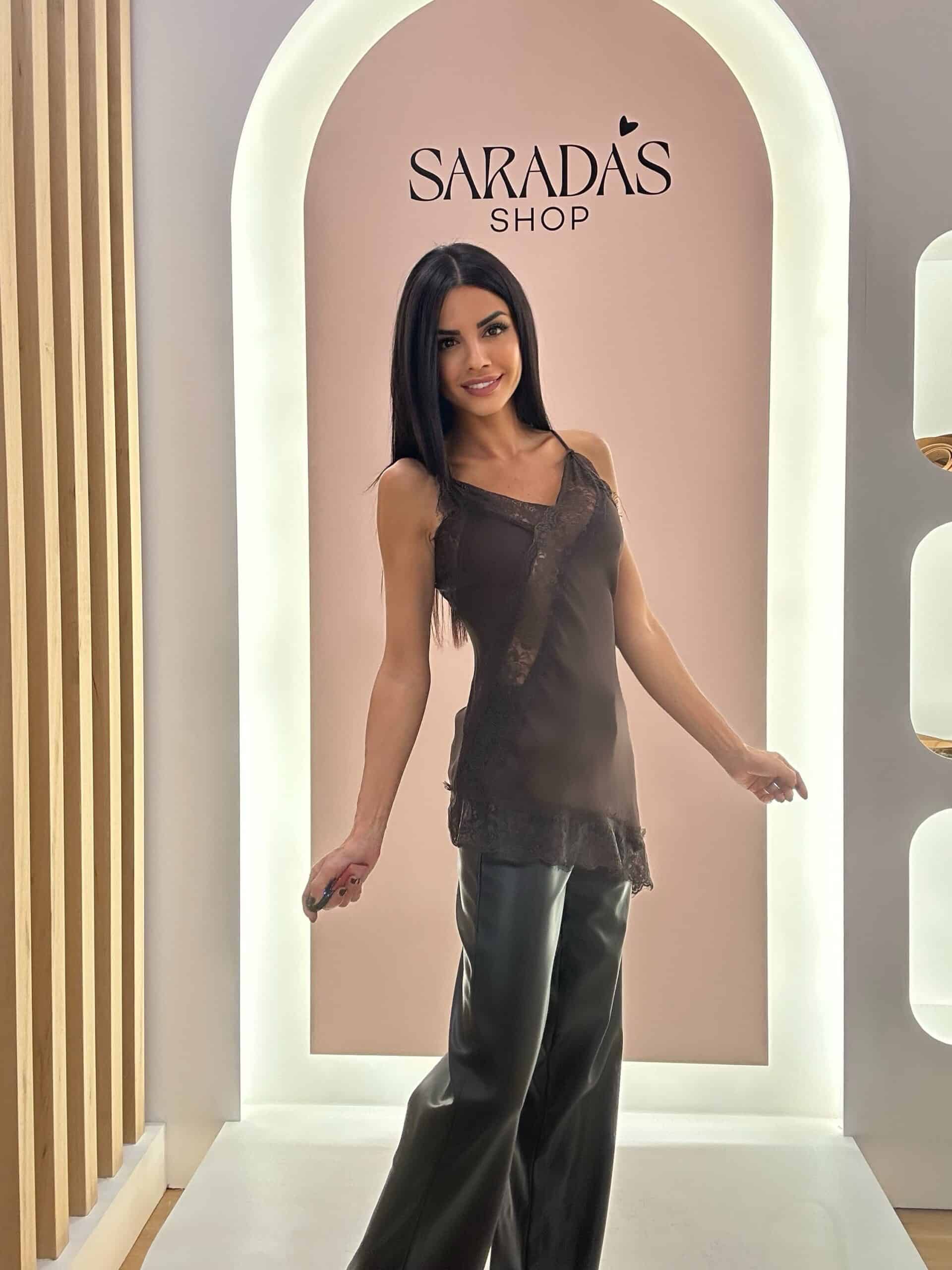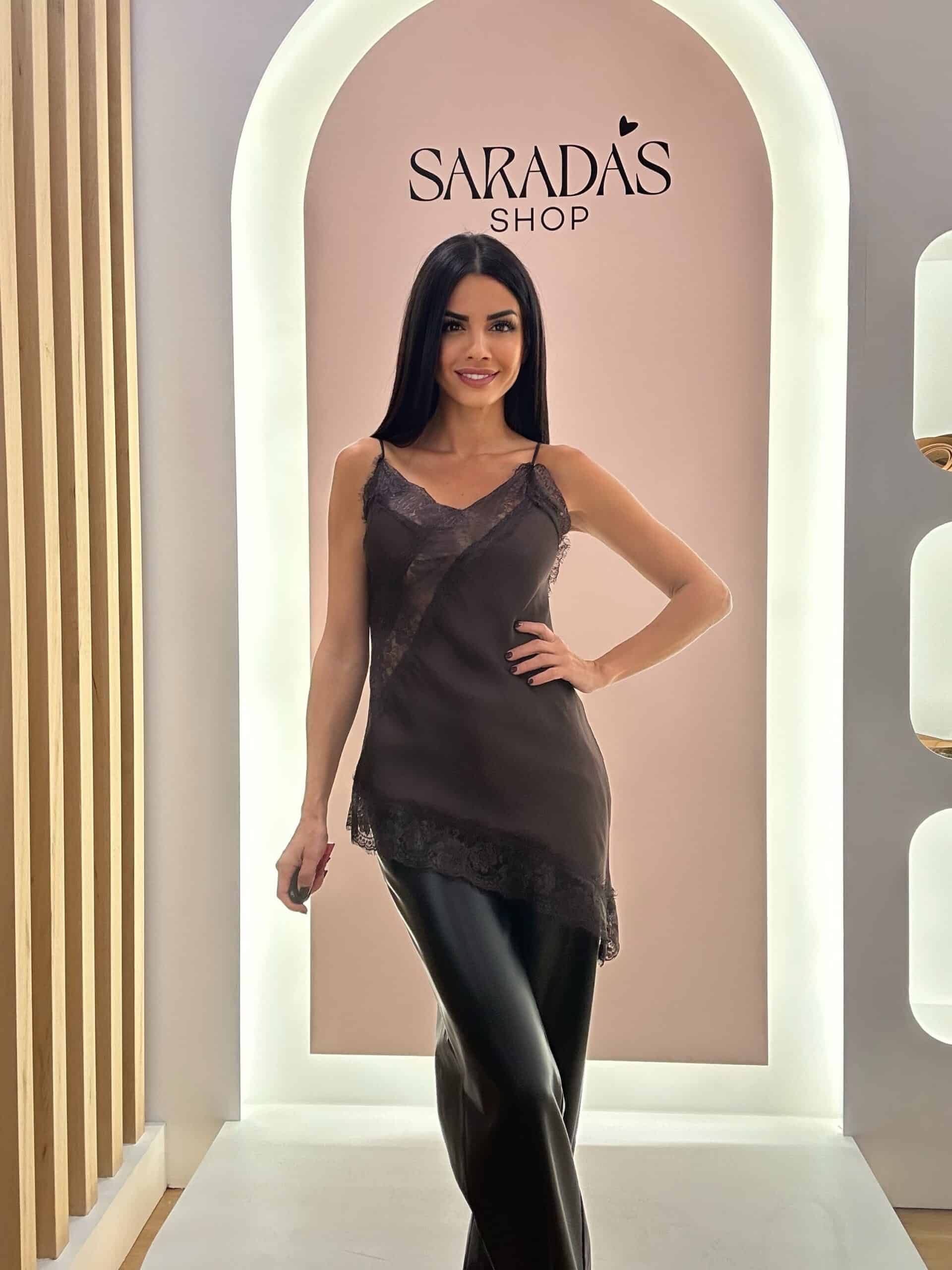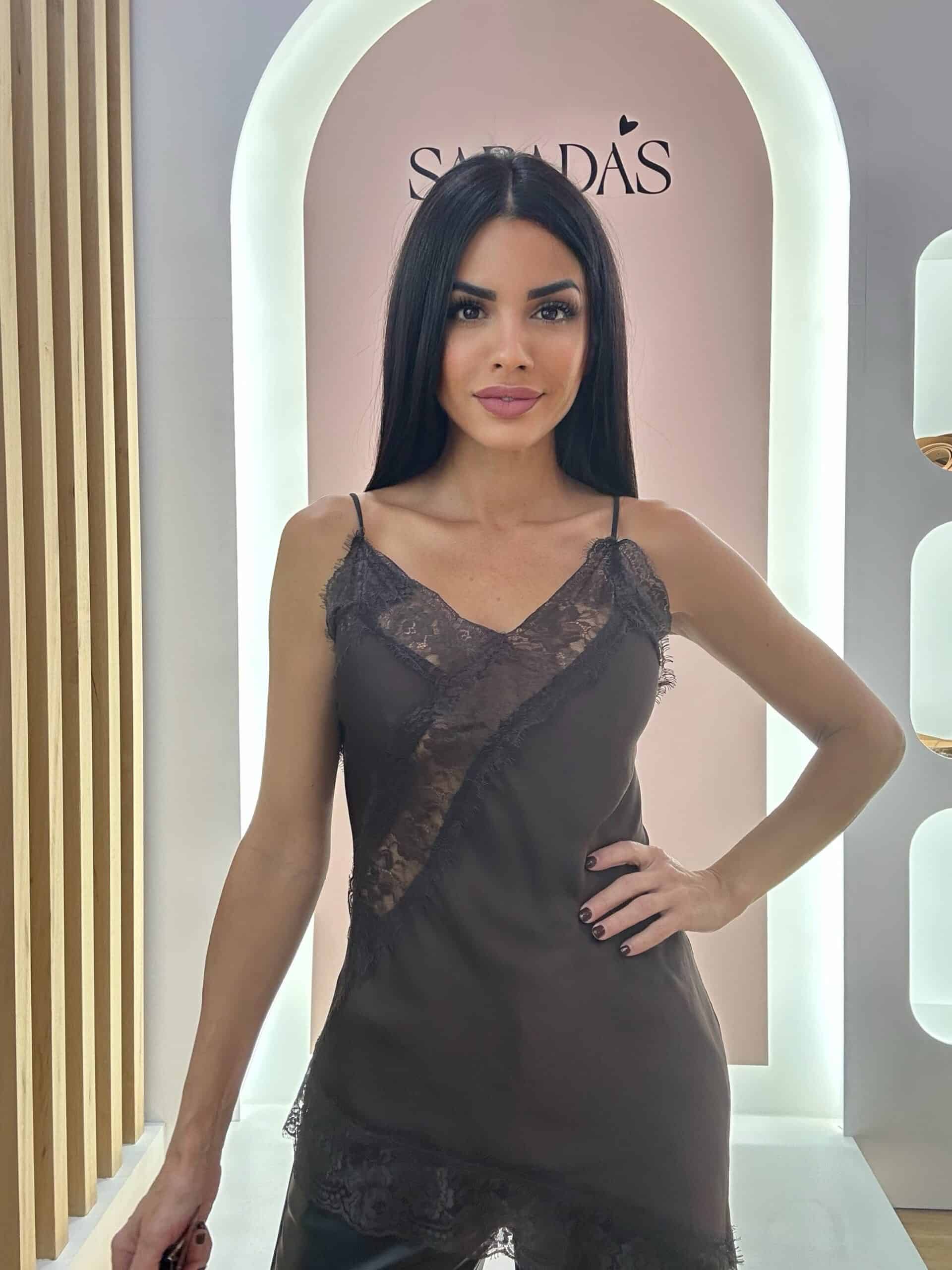 Camiseta de tirantes, en color chocolate, con detalle de encaje en escote, pecho y bajo, corte asimétrico, tirante ajustable, parte trasera con elástico. Talla única: S/M/L 70%Viscosa. 30%Seta.