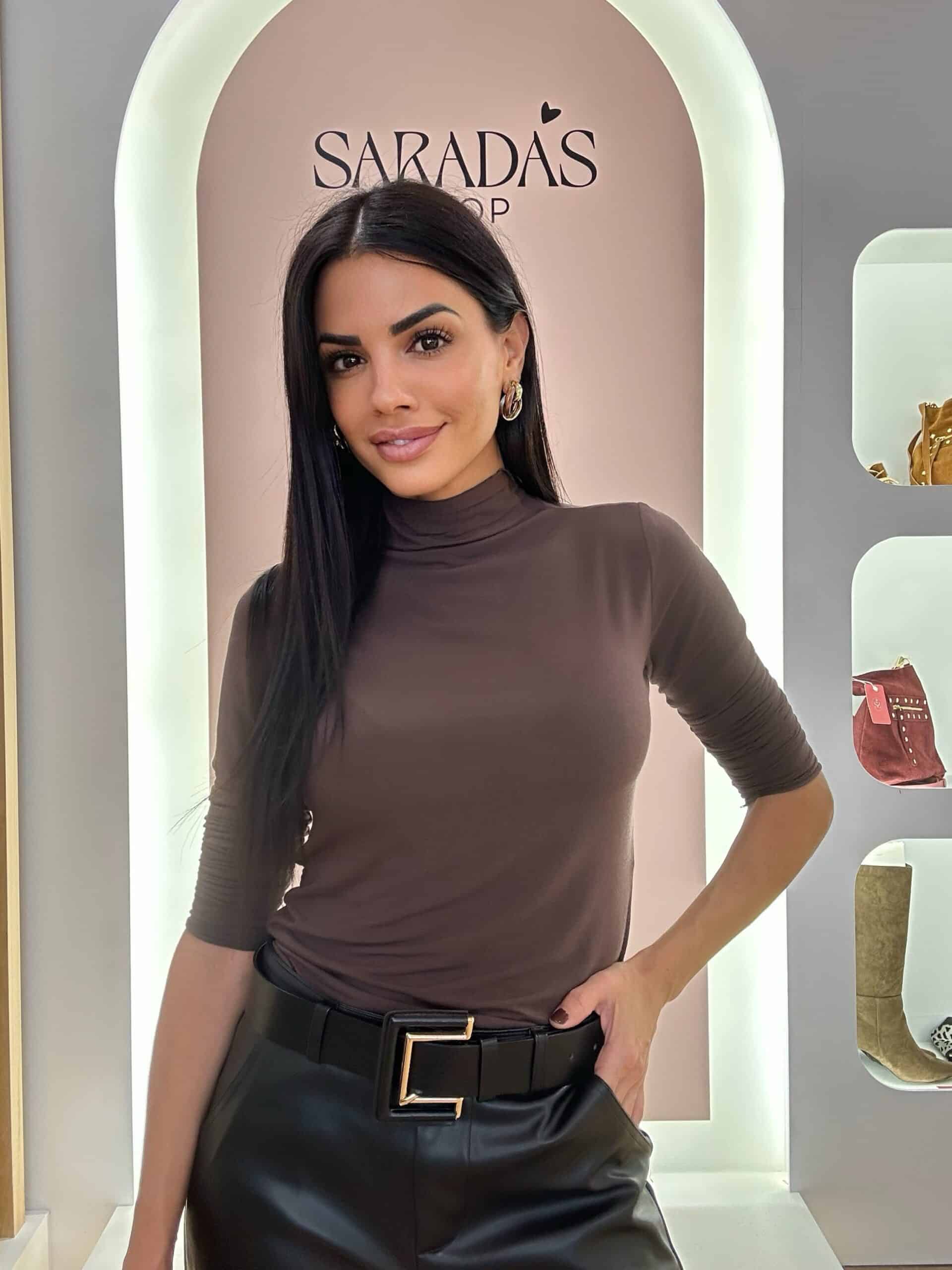 Camiseta en color marrón chocolate, pequeño cuello alto, manga larga Talla única: S/M/L 65%Viscosa. 30%Poliéster. 5%Elastano.