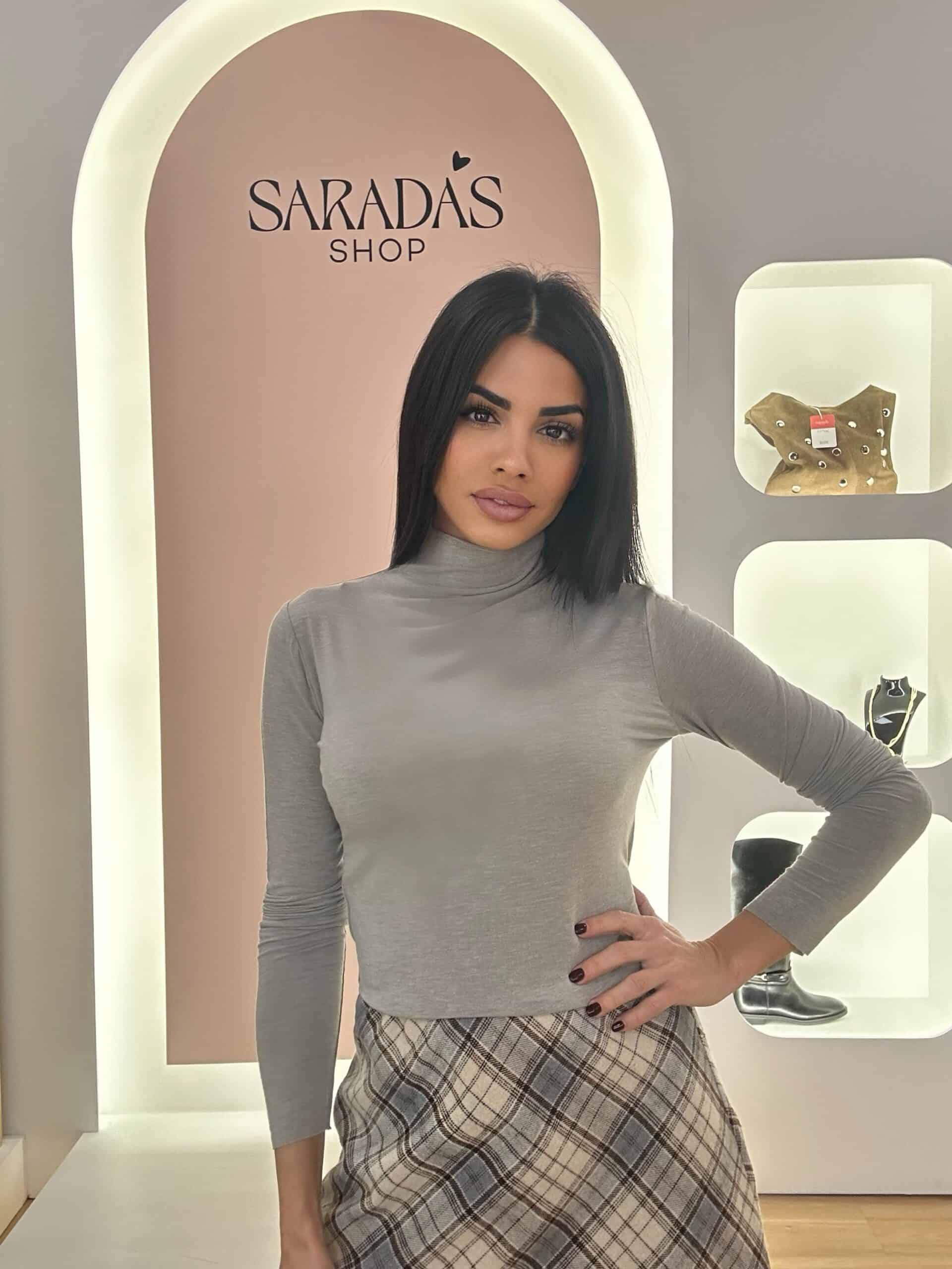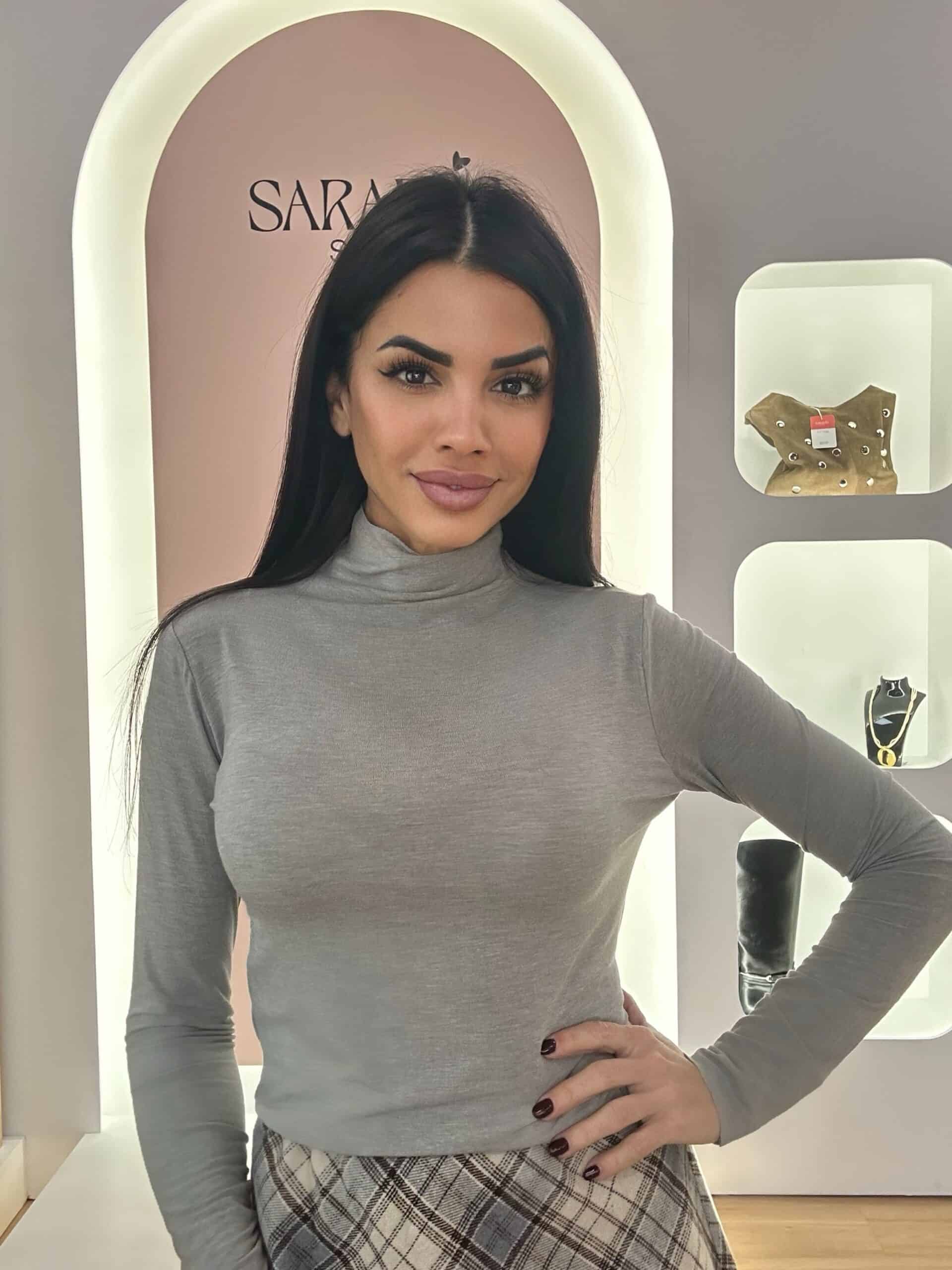 Camiseta en color gris claro, pequeño cuello alto, manga larga Talla única: S/M/L 65%Viscosa. 30%Poliéster. 5%Elastano.