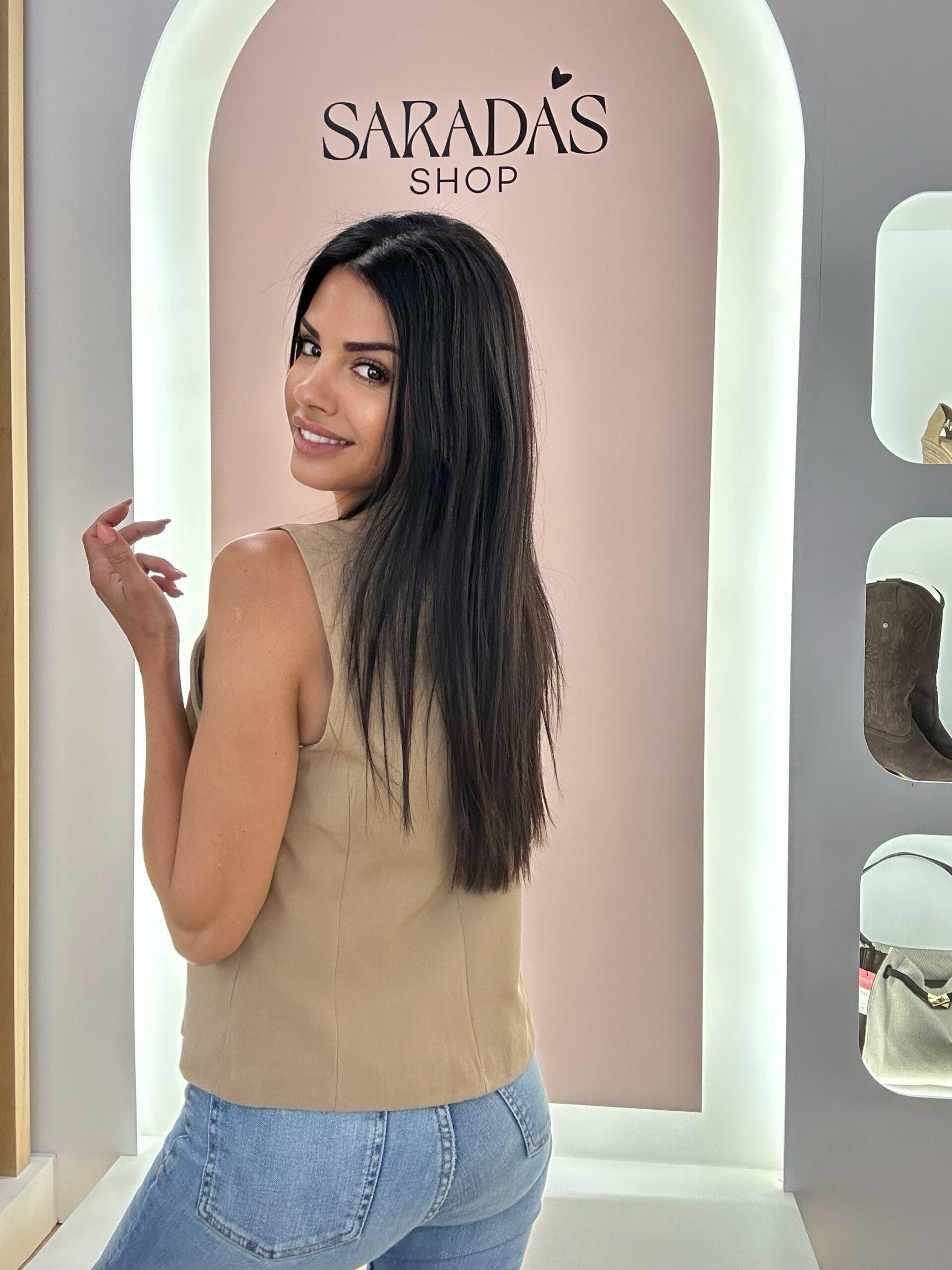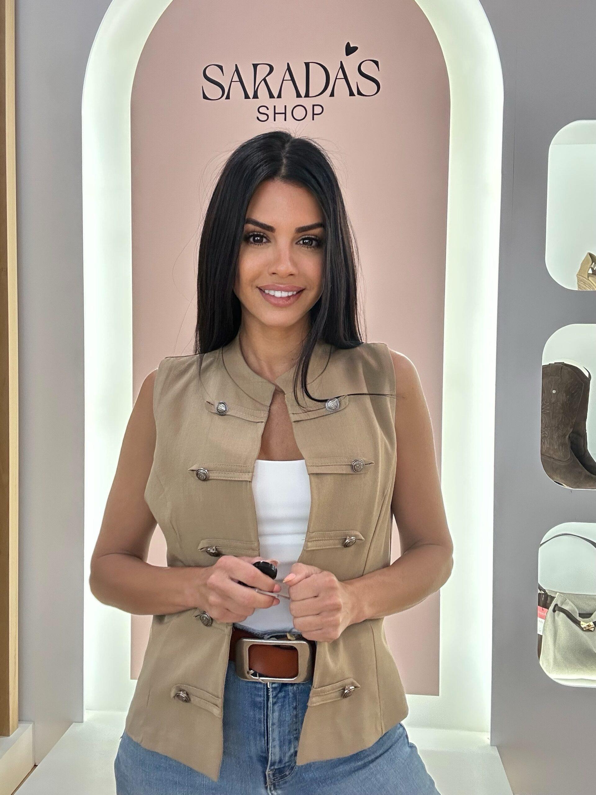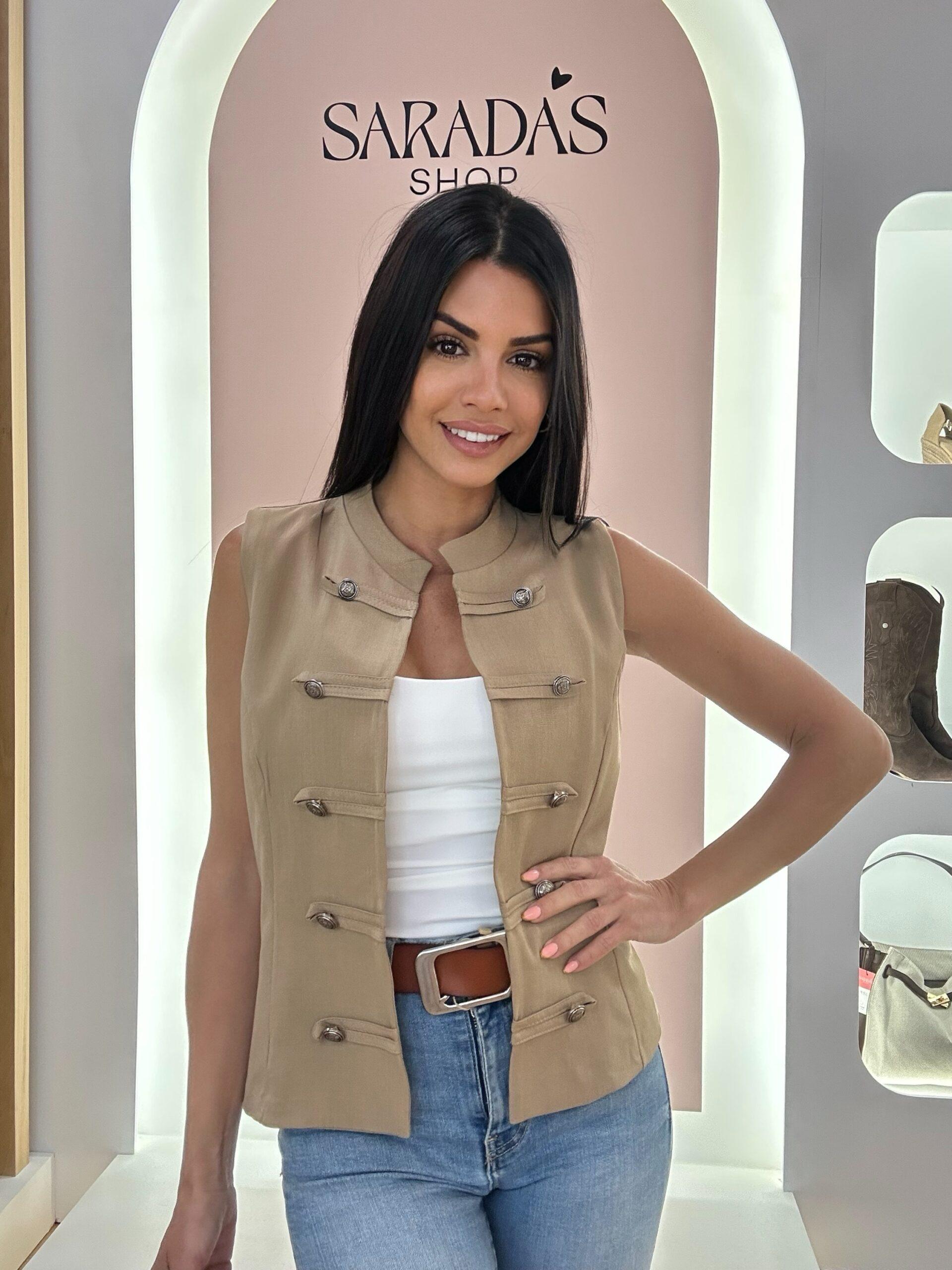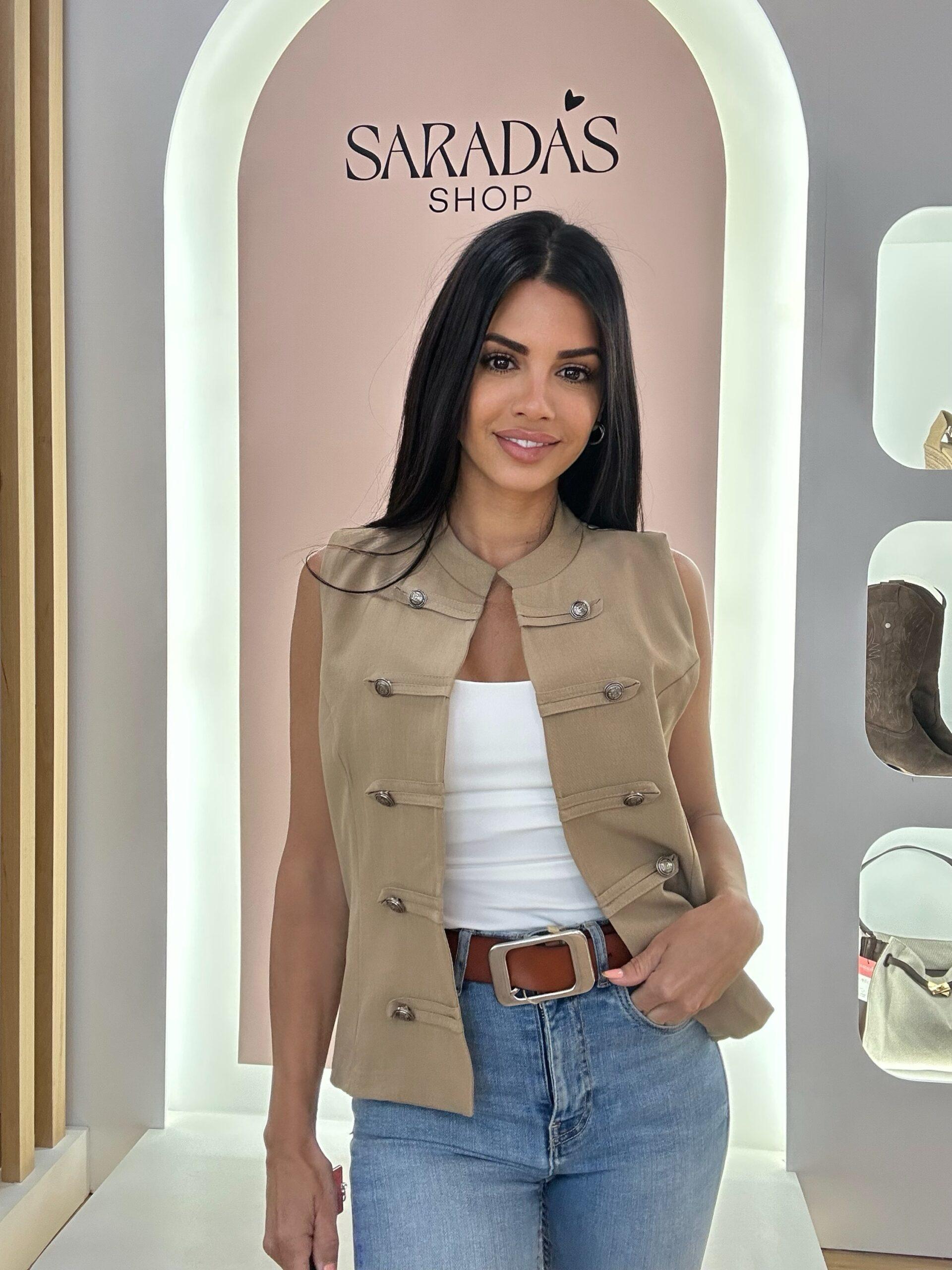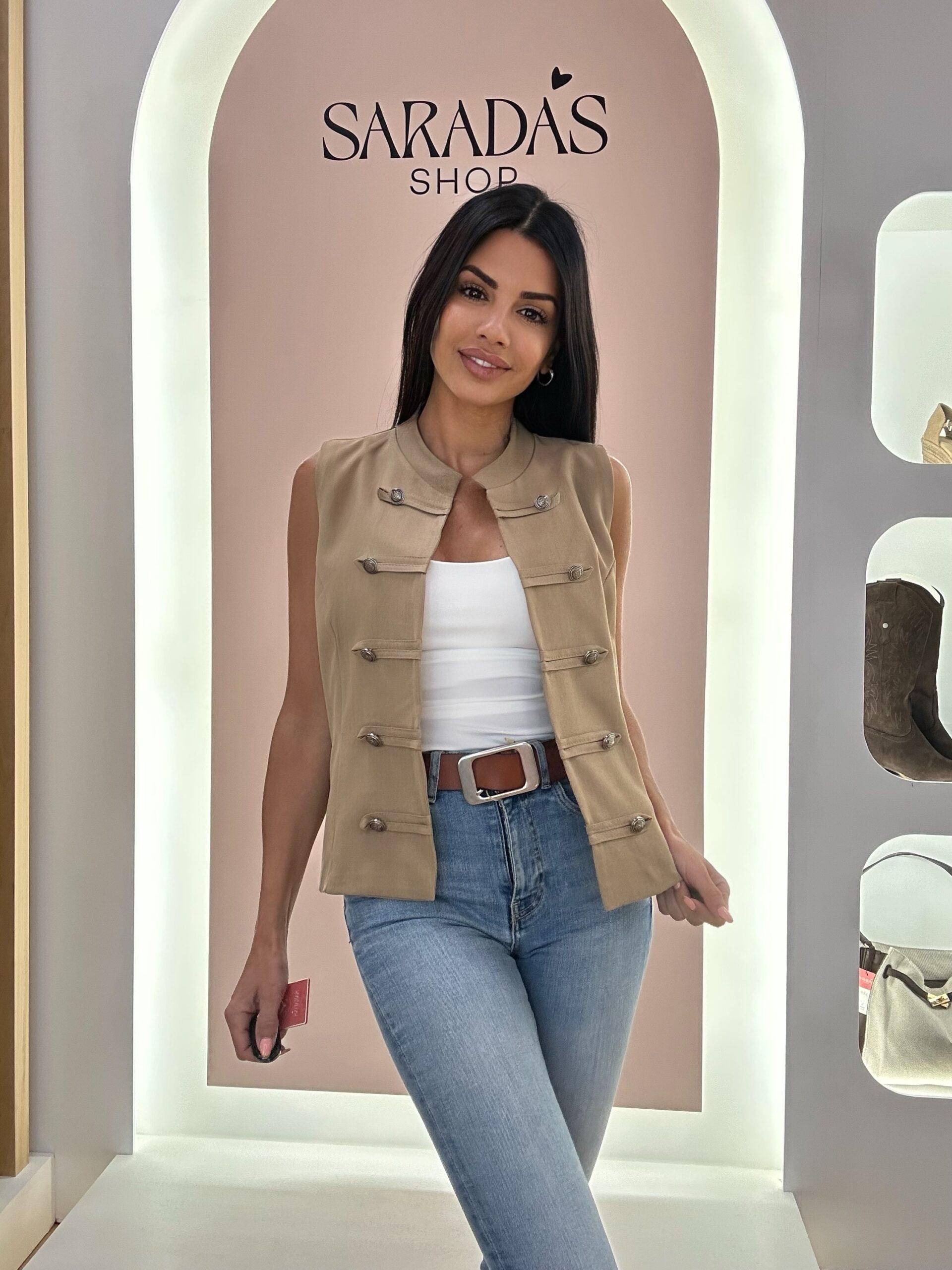 Chaleco en poliéster de color camel, cuello mao, detalle decorativa de trabillas con botones metálicos con relieve en color plateado, totalmente forrado.