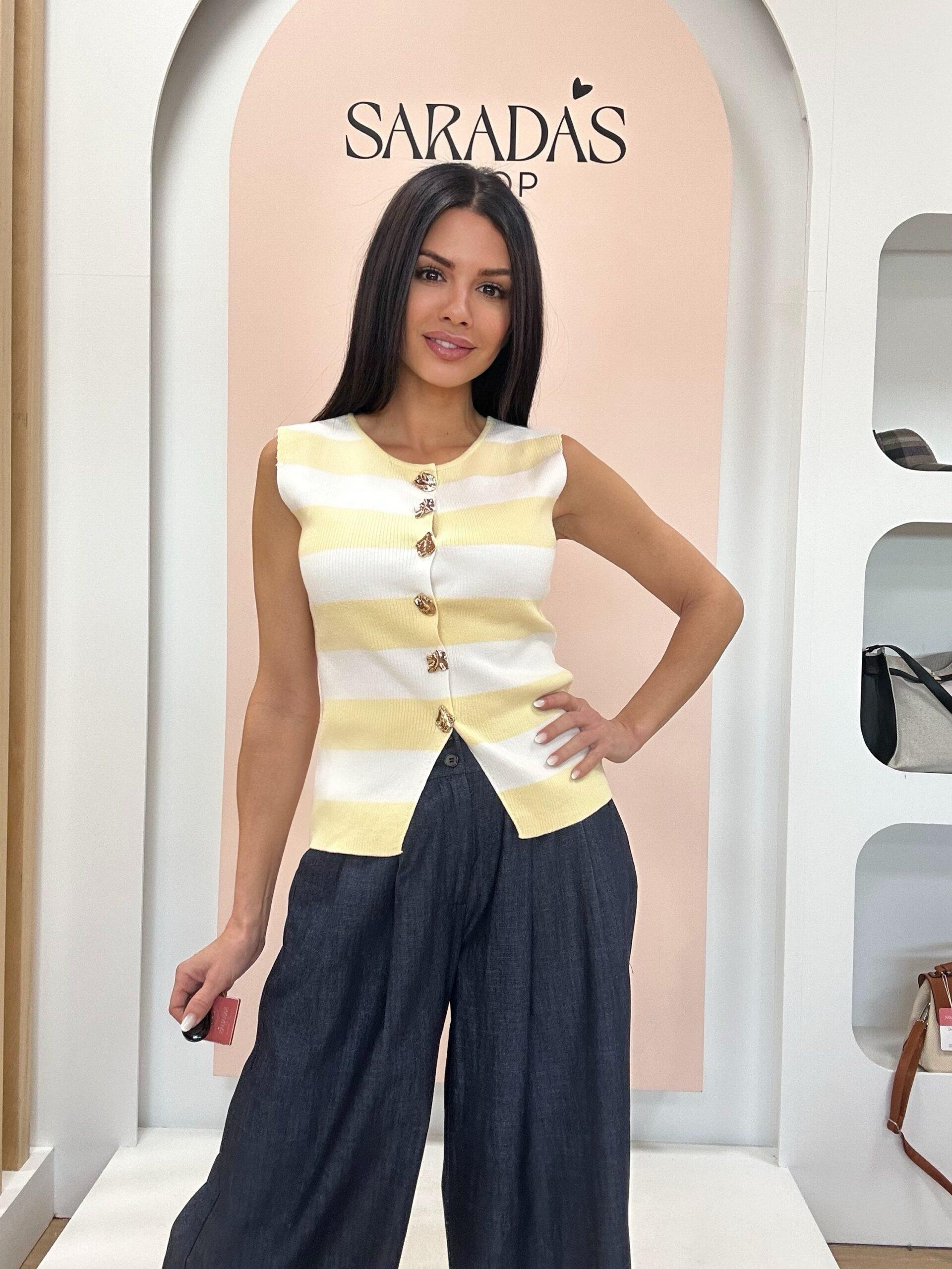Chaleco en punto fino, estampado de rayas en amarillo y blanco, cuello redondo, botonadura central de cierre con ojal con botones con distintas formas en dorado y detalle de abertura final. Talla única: S/M/L 90%Viscosa. 10%Elastano.
