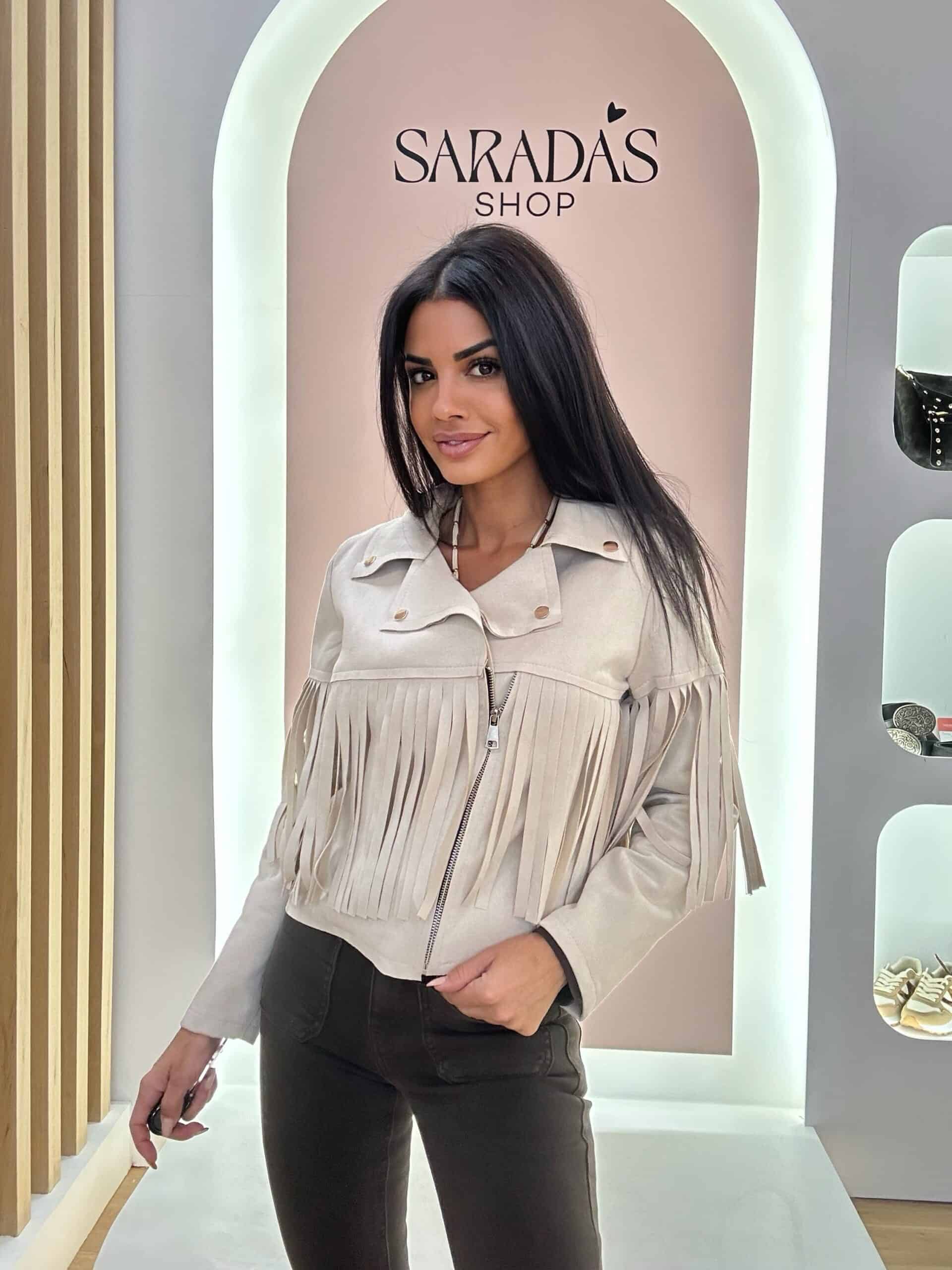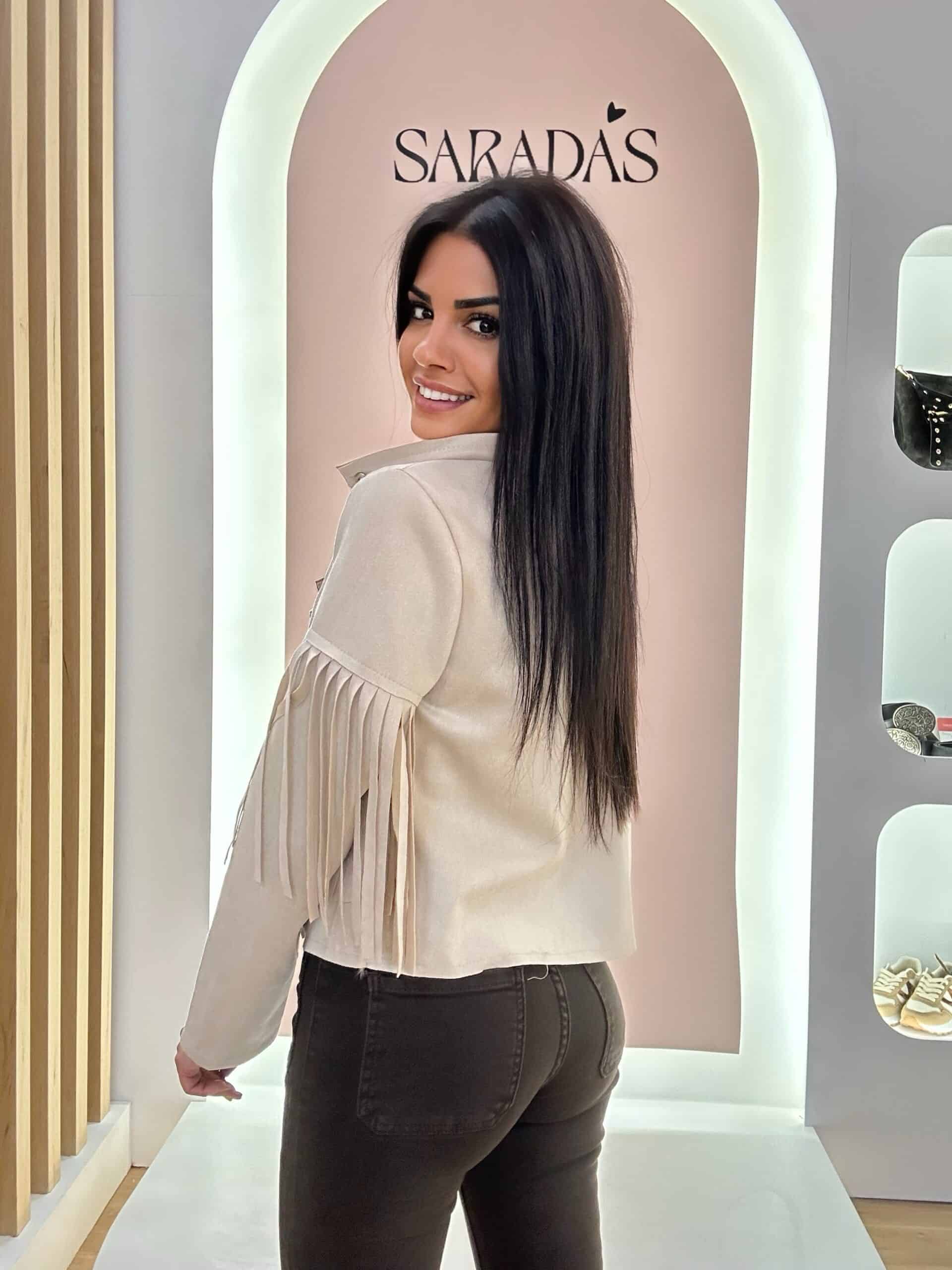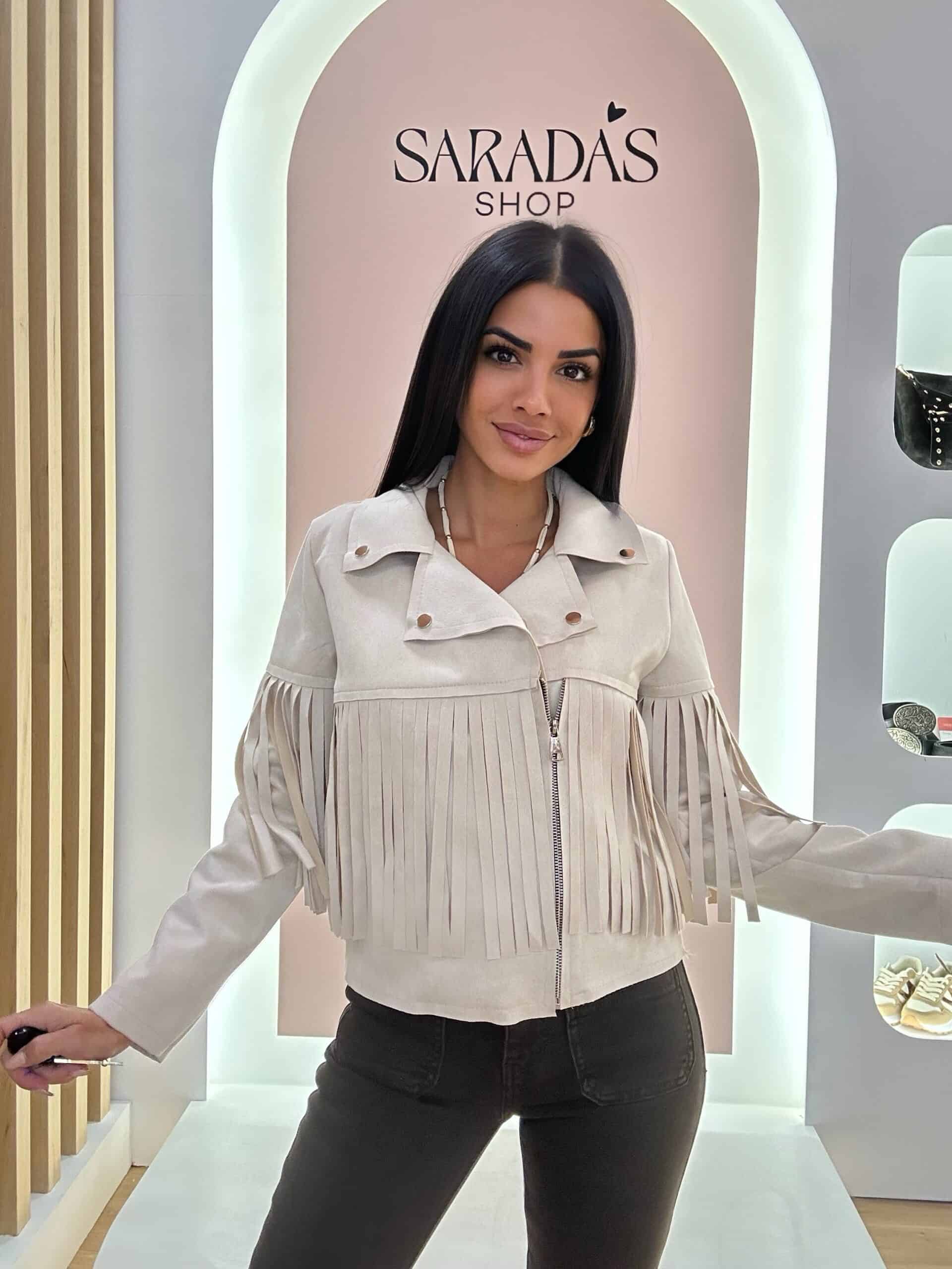 Chaqueta en antelina de color crema, cuello en solapa y cierre con cremallera, pecho y bolsillos, detalle de flecos desde el pecho y mangas, Detalle de botones y cremallera en color plateado. Diseño Italiano. 92%Poliéster. 8%Elastano.