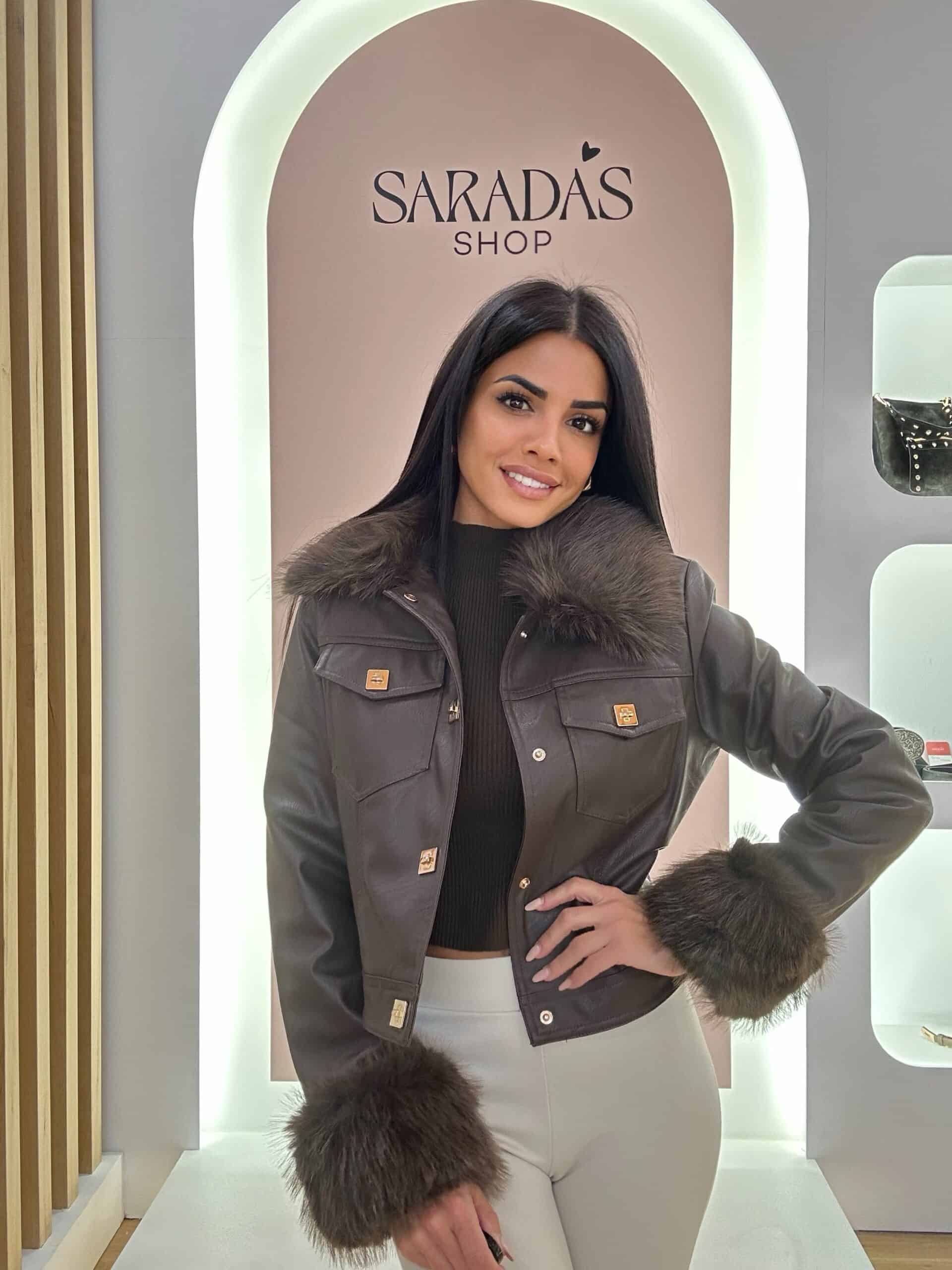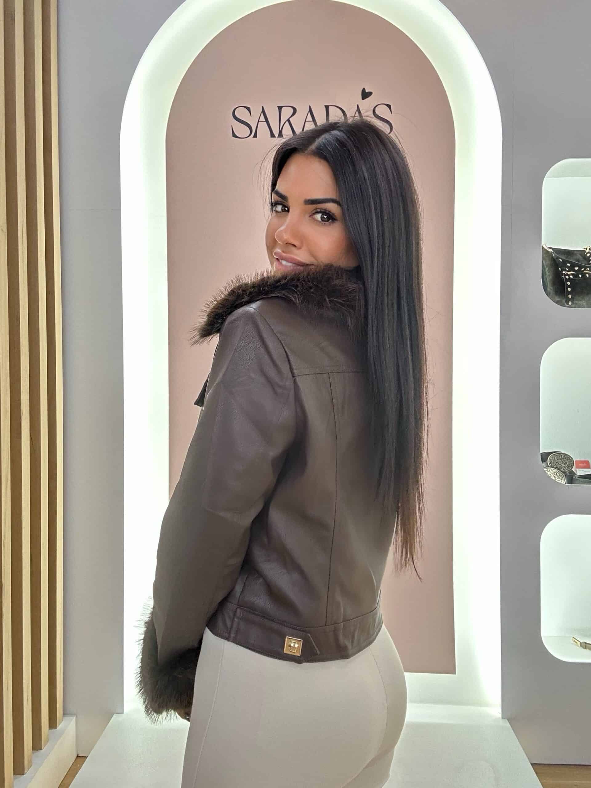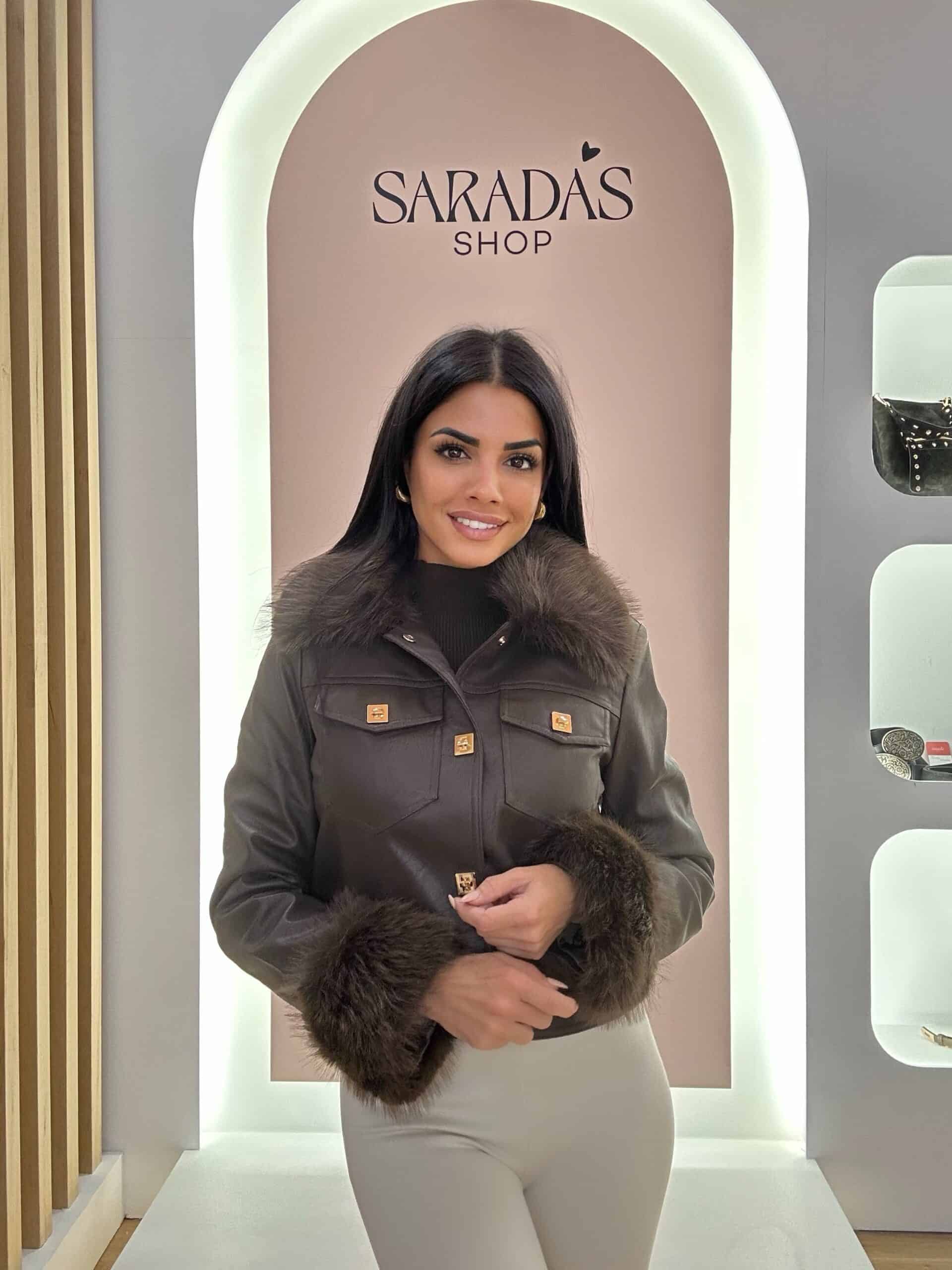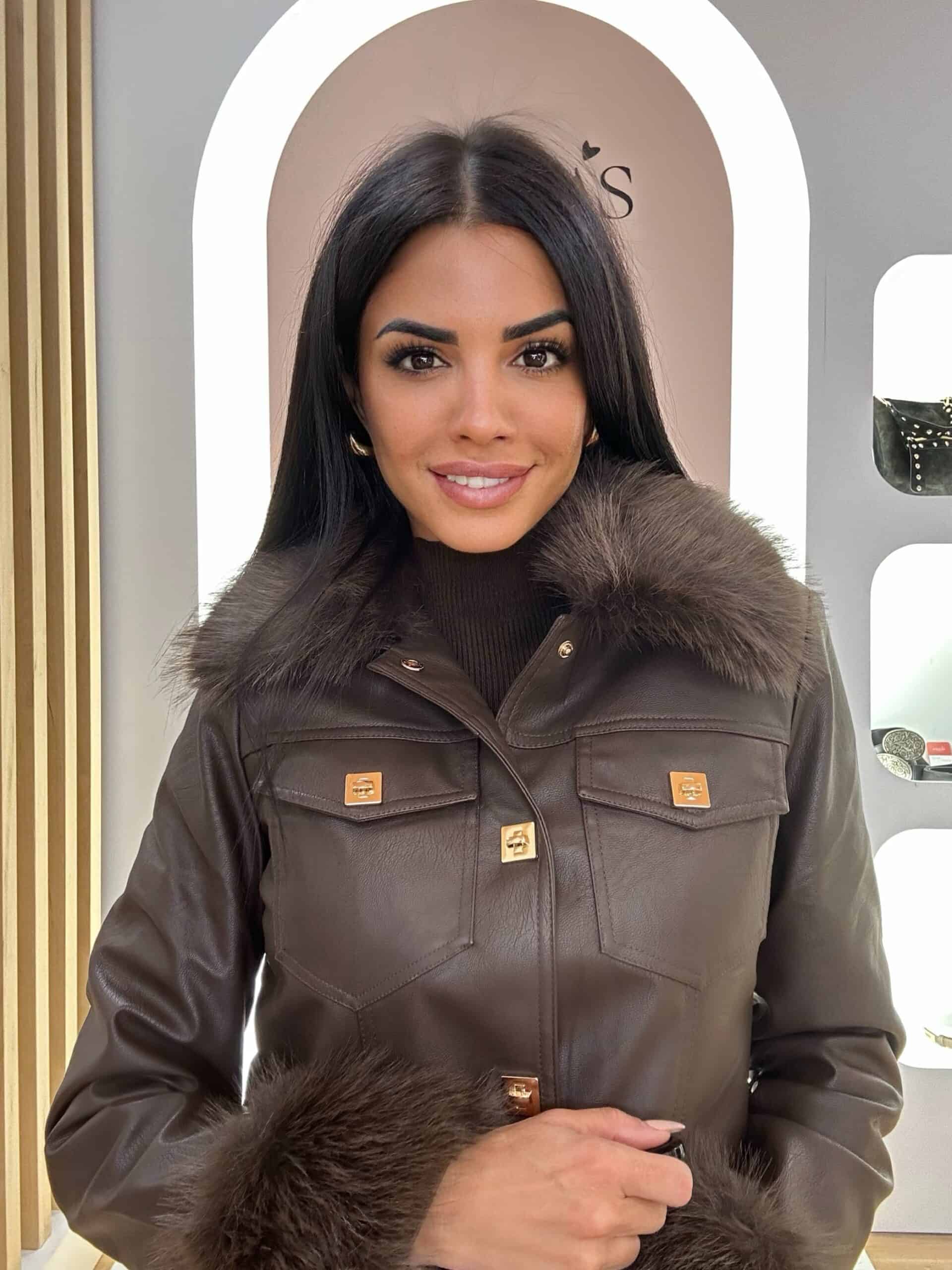 Chaqueta en polipiel de color marrón chocolate, cuelloen solapa con pelo en el mismo y en los puños, extraibles, cierre con botonadura de clic central, bolsillos en el pecho, con solapa y botón, , detalle de todos  botones cuadrados en dorado,  trabilla ajustable en cintura. Totalmente forrada, con el interior con pelo. Elige tu talla:  S/34-36, M/36-38, L/38-40, XL/40-42 EXT: 100% PU. INT: 100%Poliéster.