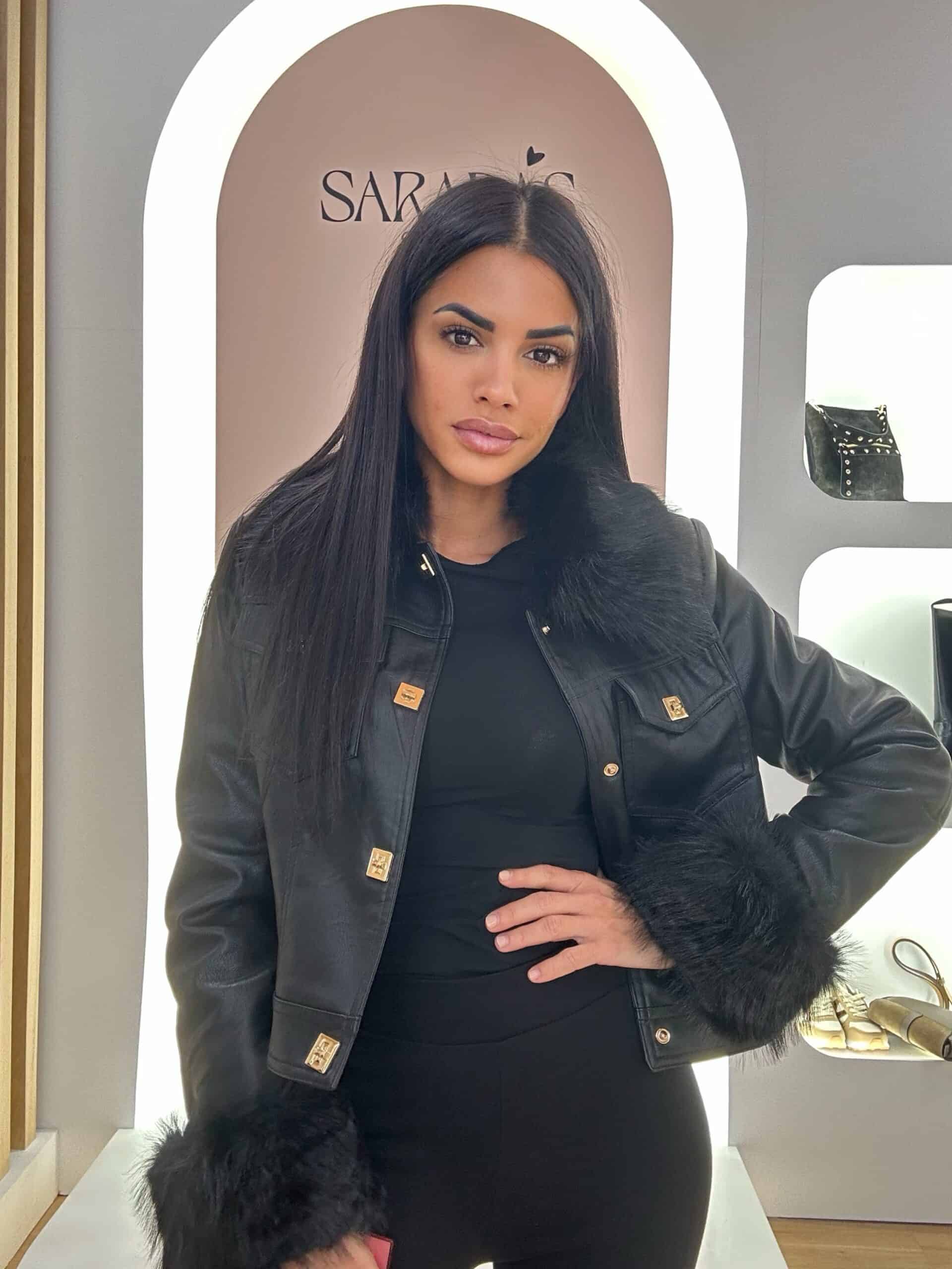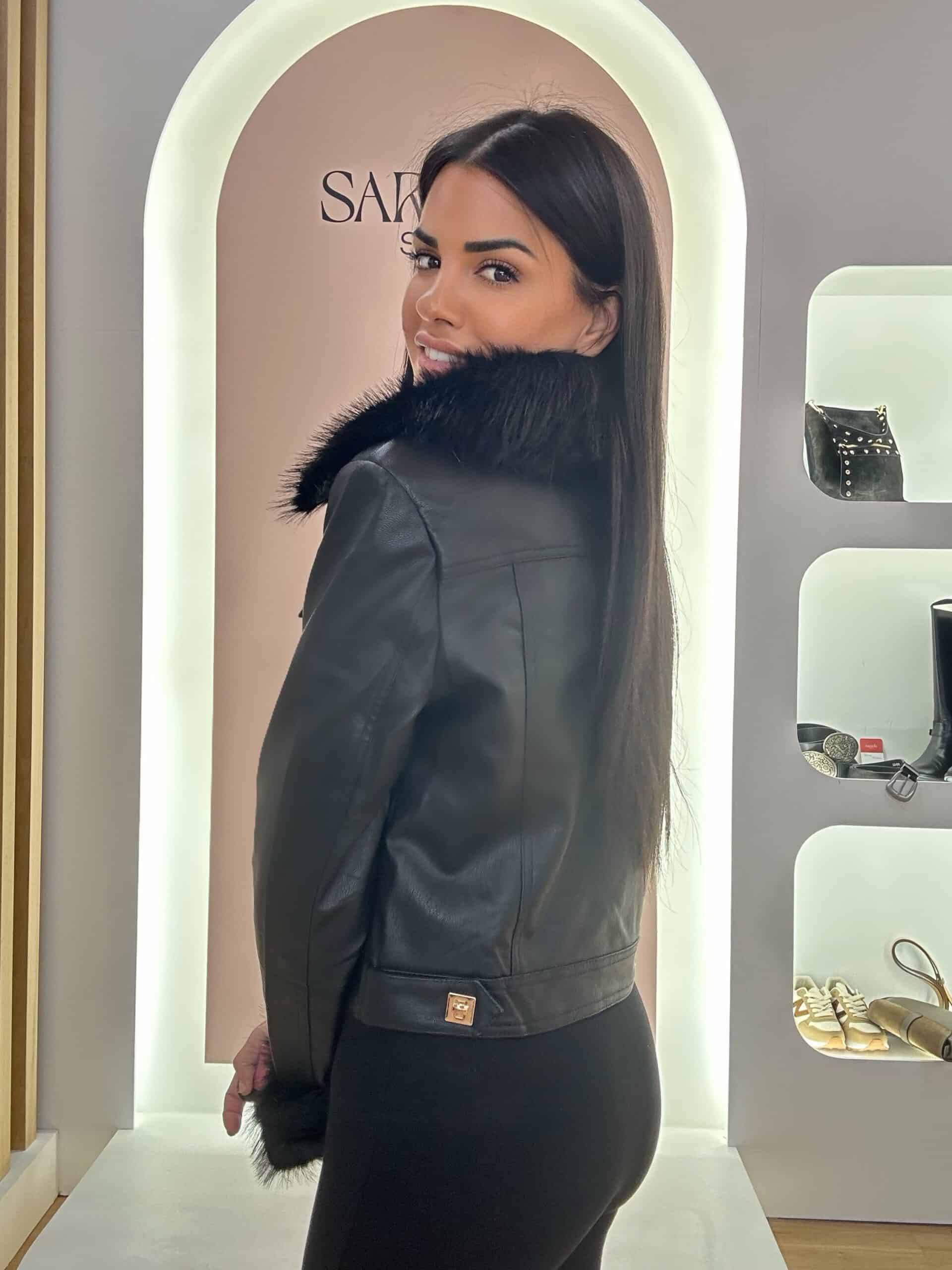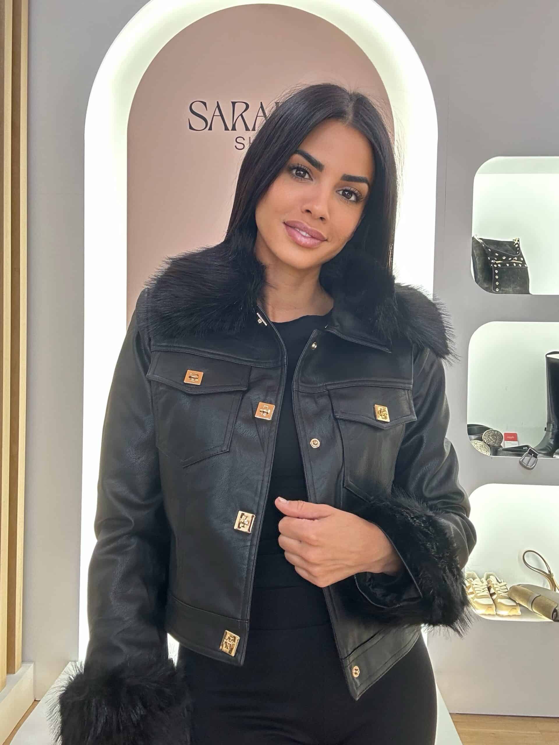 Chaqueta en polipiel de color negro, cuello en solapa con pelo en el mismo y en los puños, extraibles, cierre con botonadura de clic central, bolsillos en el pecho, con solapa y botón, , detalle de todos  botones cuadrados en dorado,  trabilla ajustable en cintura. Totalmente forrada, con el interior con pelo. Elige tu talla:  S/34-36, M/36-38, L/38-40, XL/40-42 EXT: 100% PU. INT: 100%Poliéster.