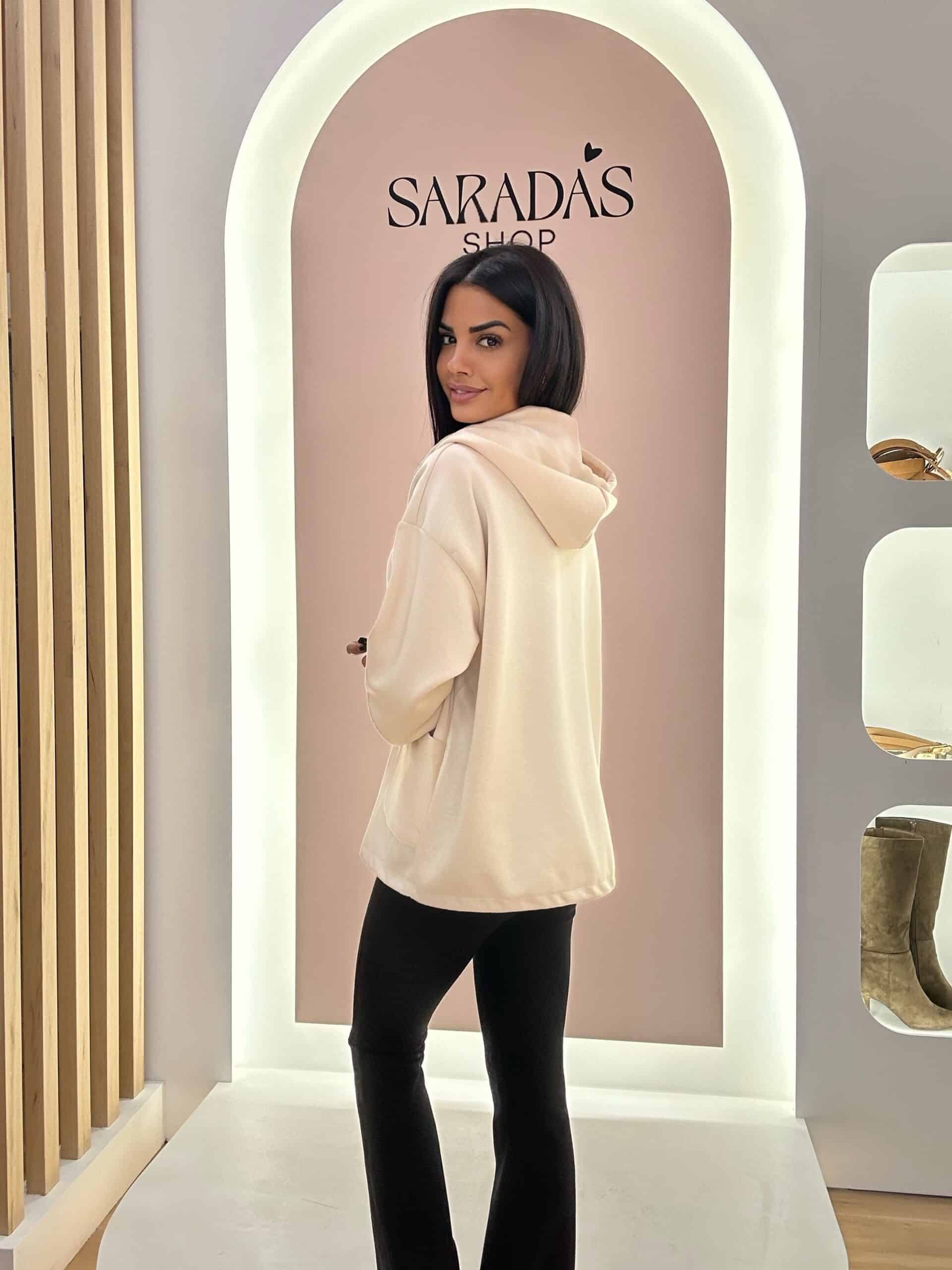 Chaqueta en mezcla de color crema, gorro con cuerda ajustable en color negro, cierre frontal con cremallera en color plateado, bolsillos cuadrados laterales, corte recto, detalle de curda ajustable en el bajo. Diseño Italiano.