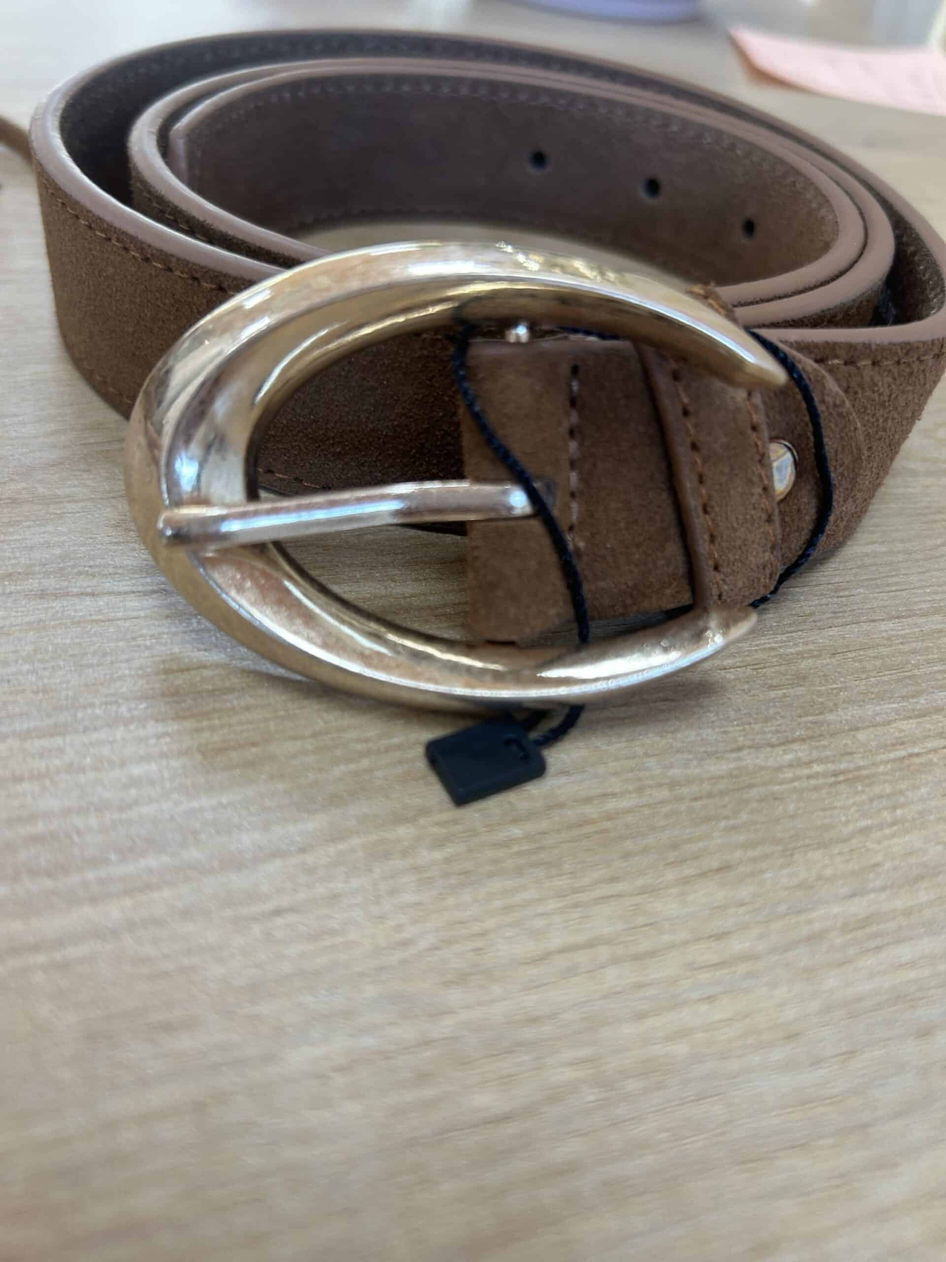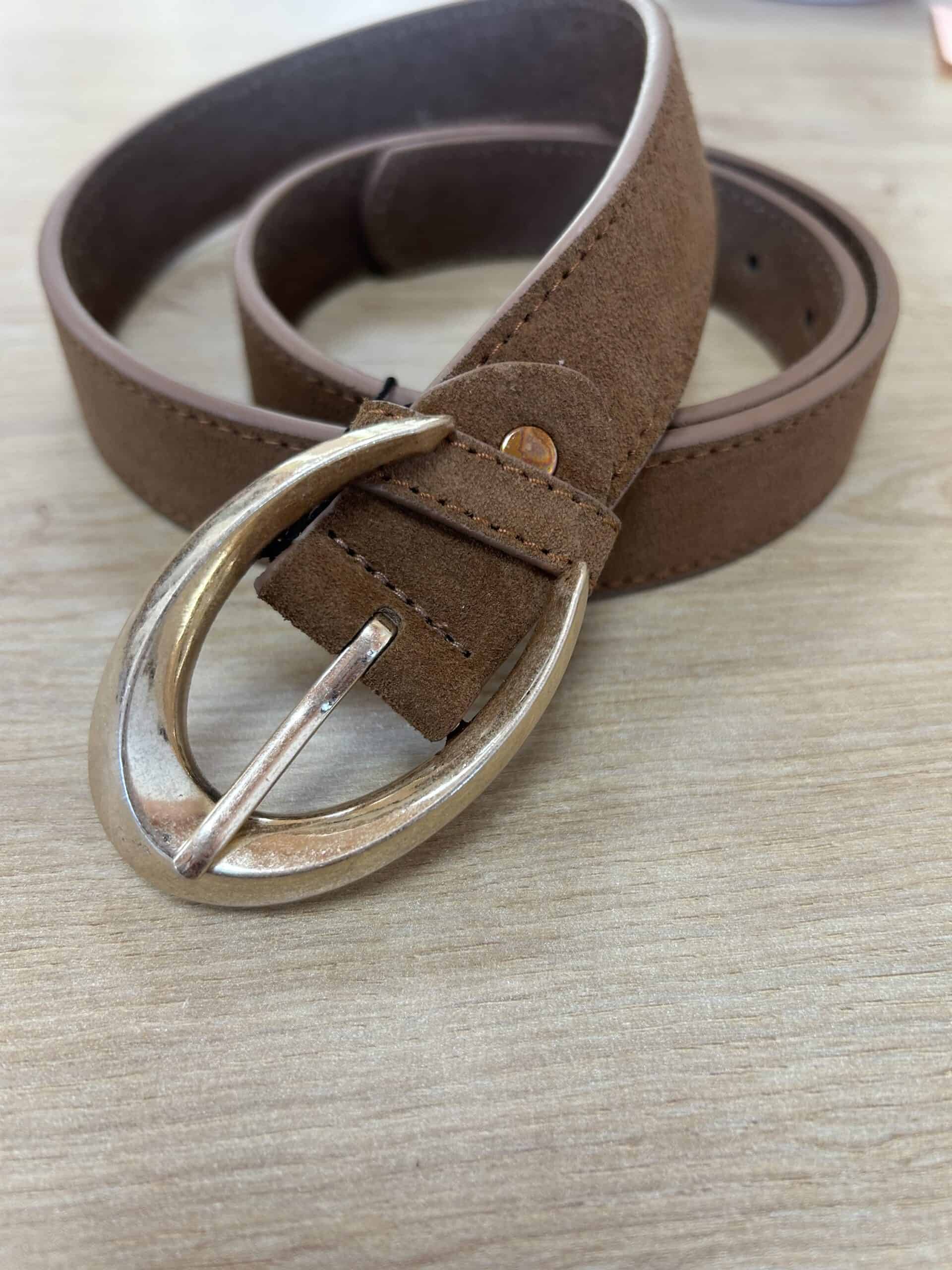 Cinturón de piel en ante de color camel, con detalle hebilla ovalada dorada en mate. Varias medidas. Medidas que te pueden interesar: Ancho 3cm. Largo: 85cm./90cm.