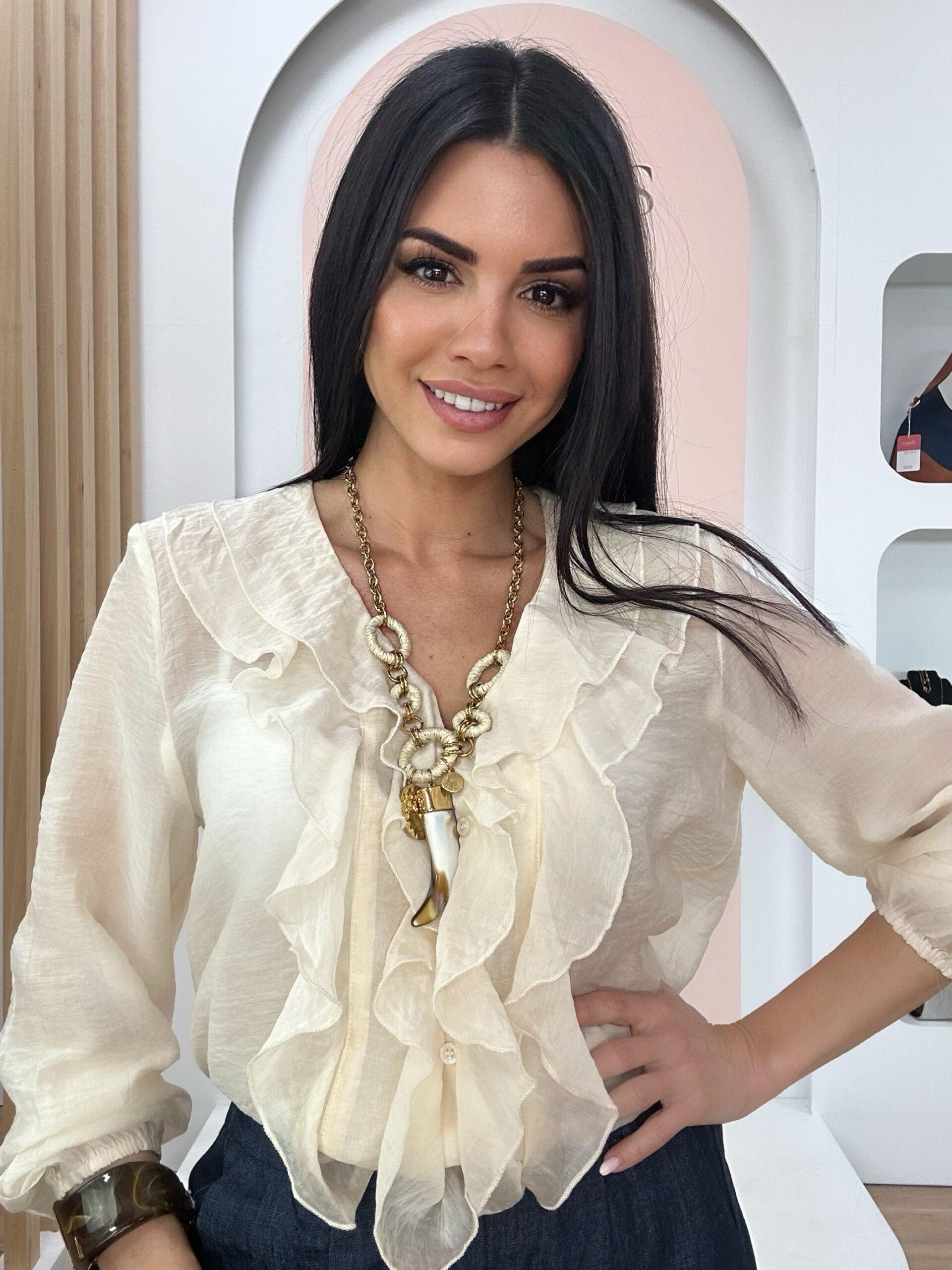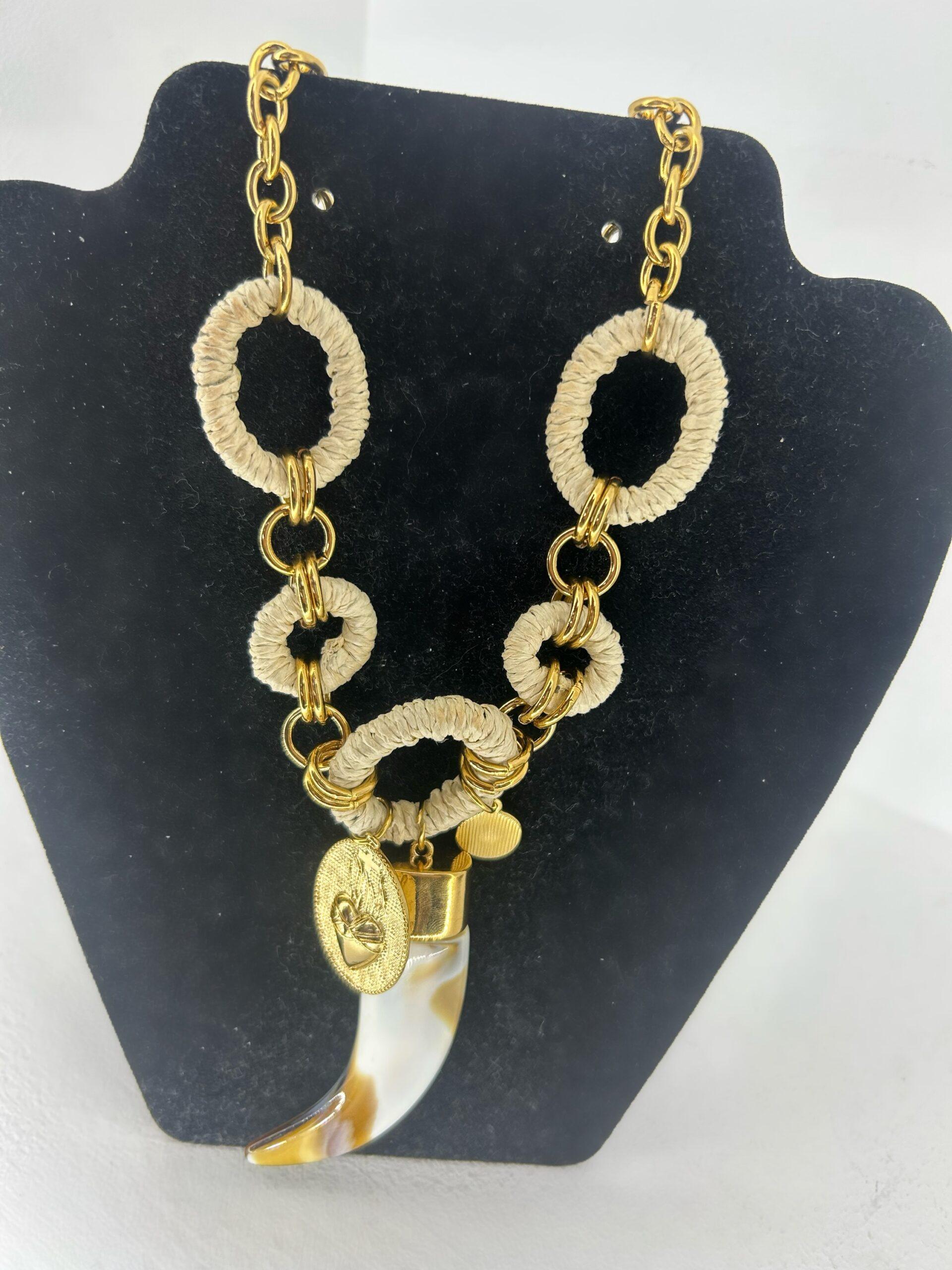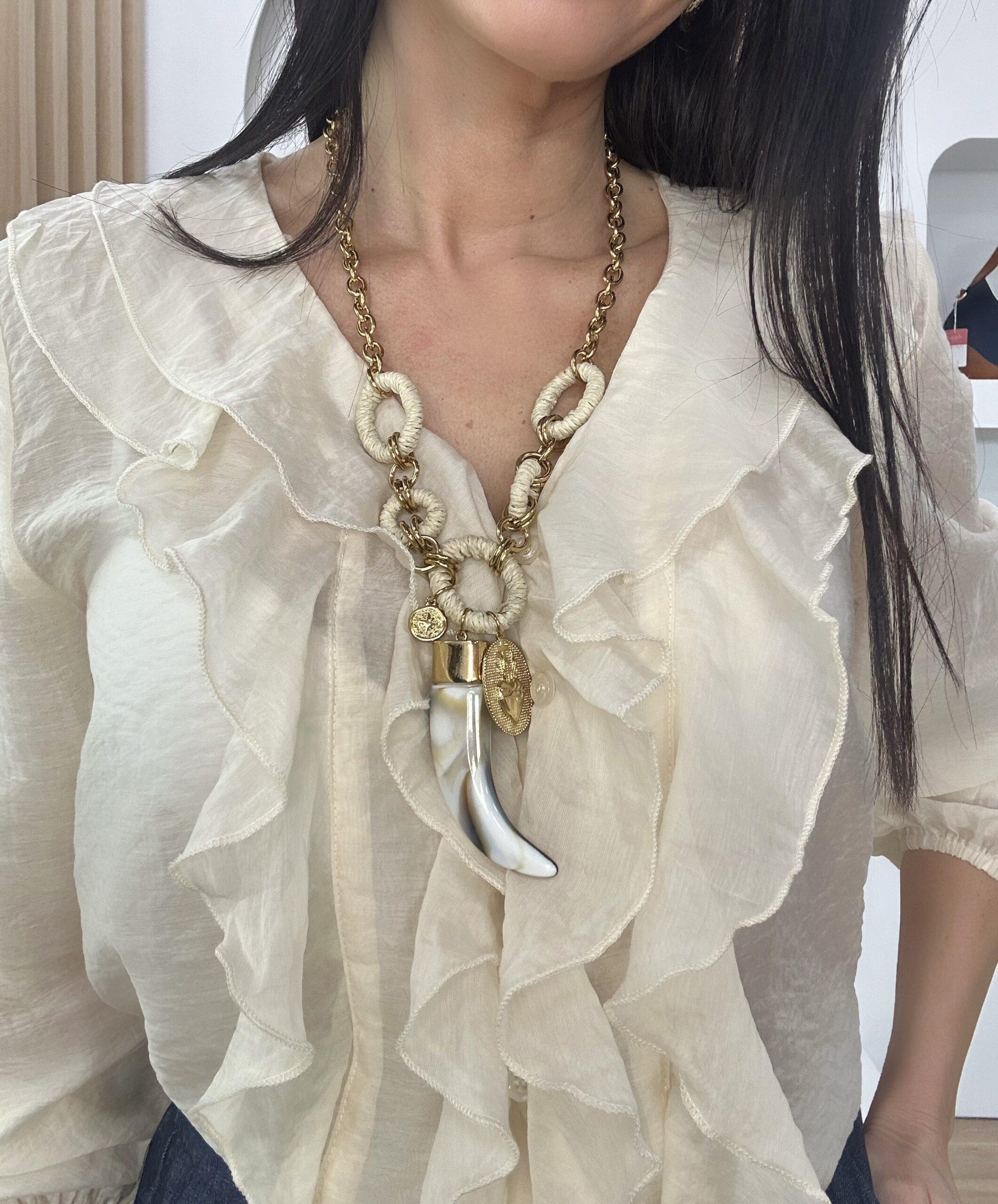 Collar largo de cierre de mosquetón, eslabones en acero color dorado y eslabones mas grandes en acrílico de color crema, colgante de cuerno marfil y dos chapas en acero dorado de distintos tamaños.