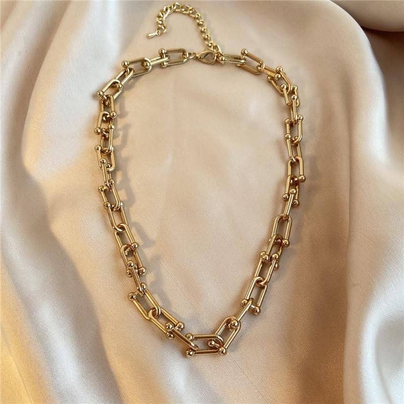 Collar de eslabones en color dorado, cierre de mosquetón. Acero.