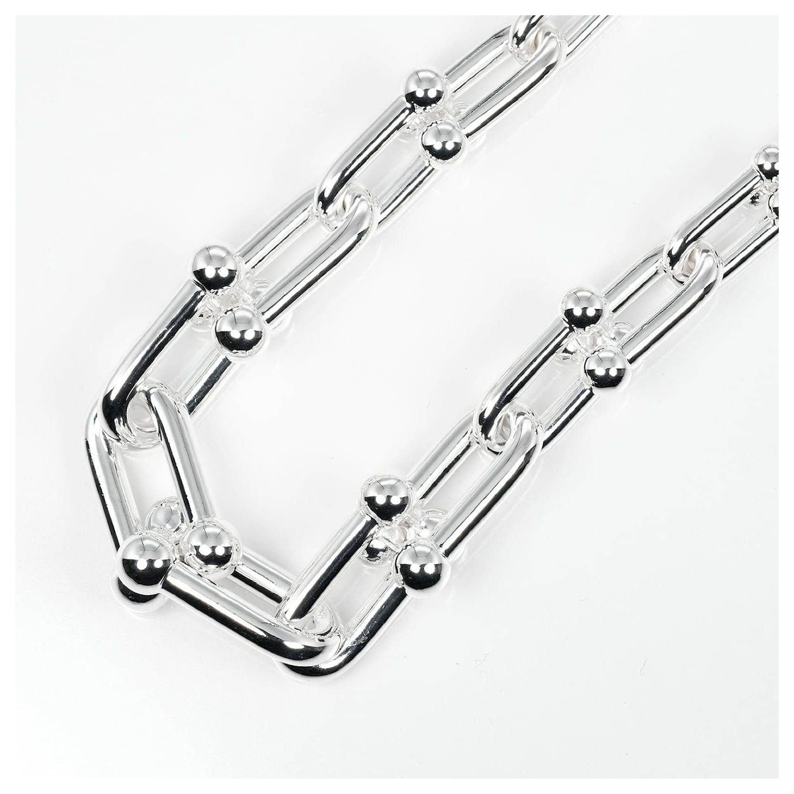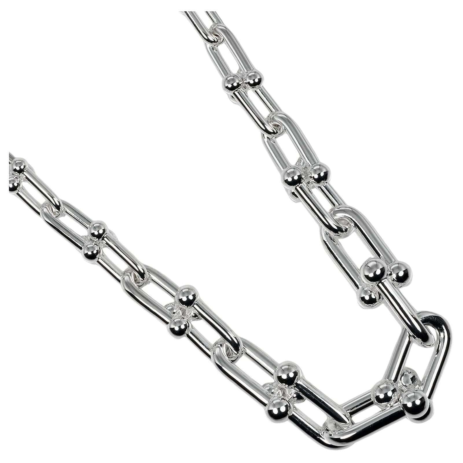 Collar de eslabones en color plateado, cierre de mosquetón. Acero.