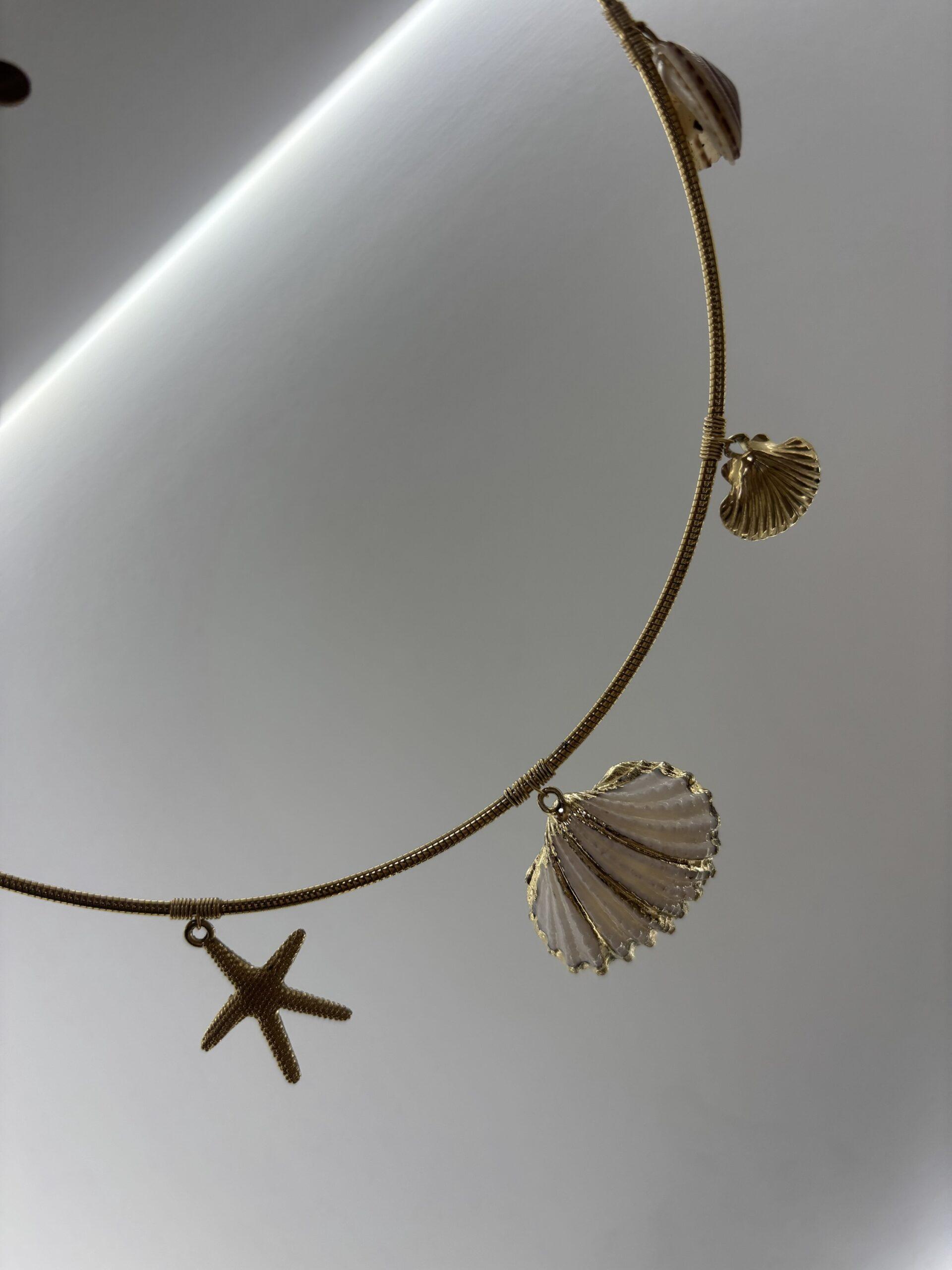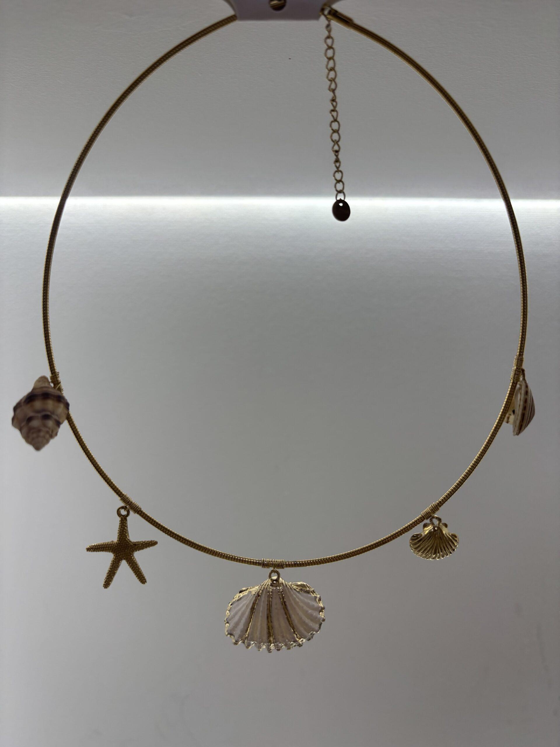 Collar en acero dorado, de cierre de mosquetón, tipo gargantilla, con detalle de charms de distintas formas de motivos marinos. Acero.