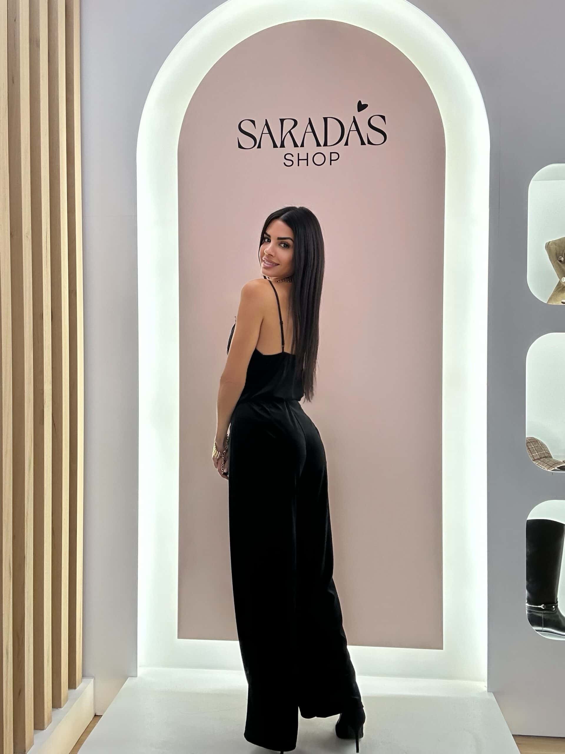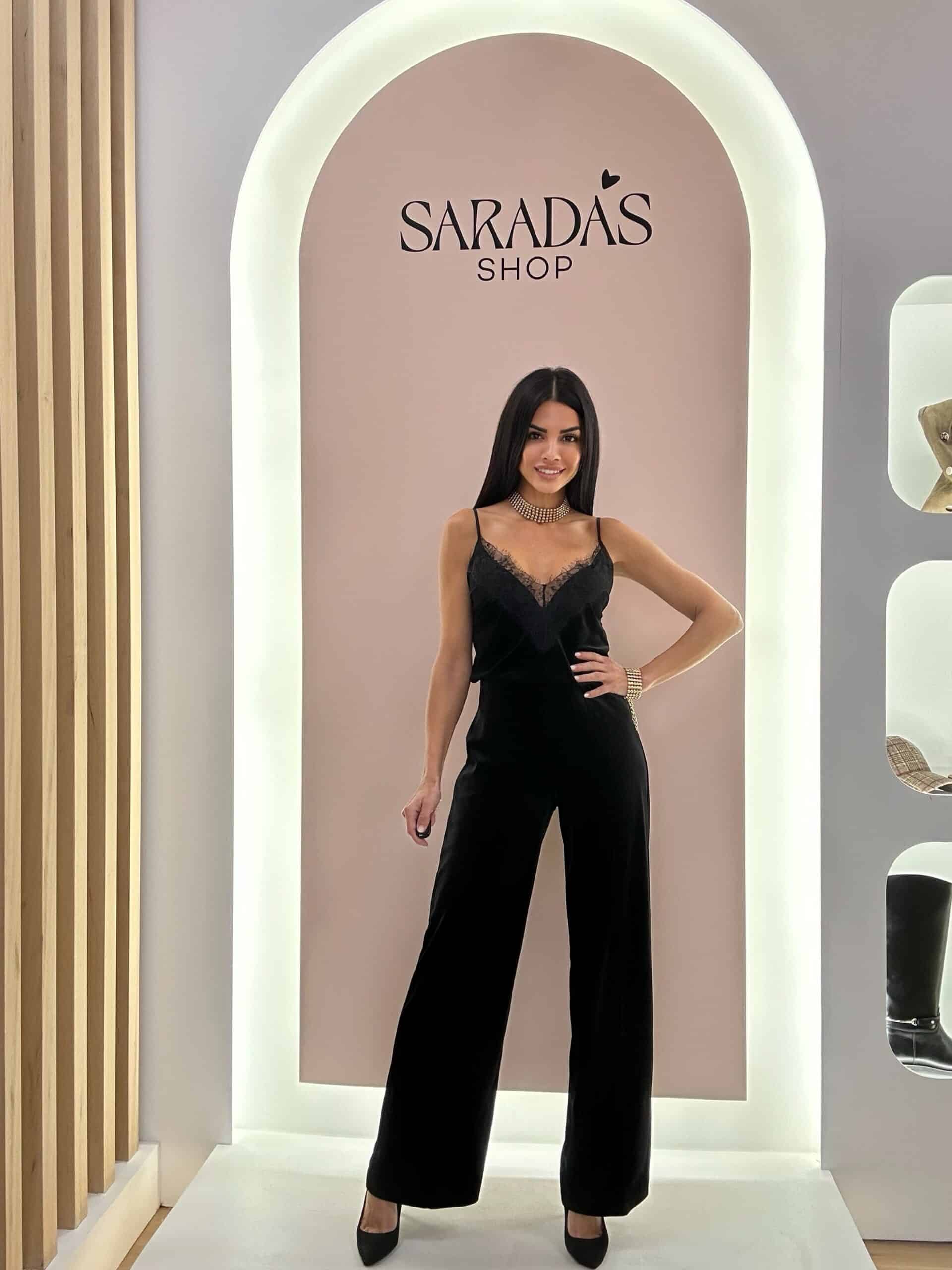 Conjunto aterciopelado en color negro, formado por top lencero, de tirante regulable, con cuello en pico y detalle de encaje en el mismo, parte trasera elástica y pantalón largo, en mismo color y material, corte recto, cintura elástica y detalle de costura central. Diseño Italiano.