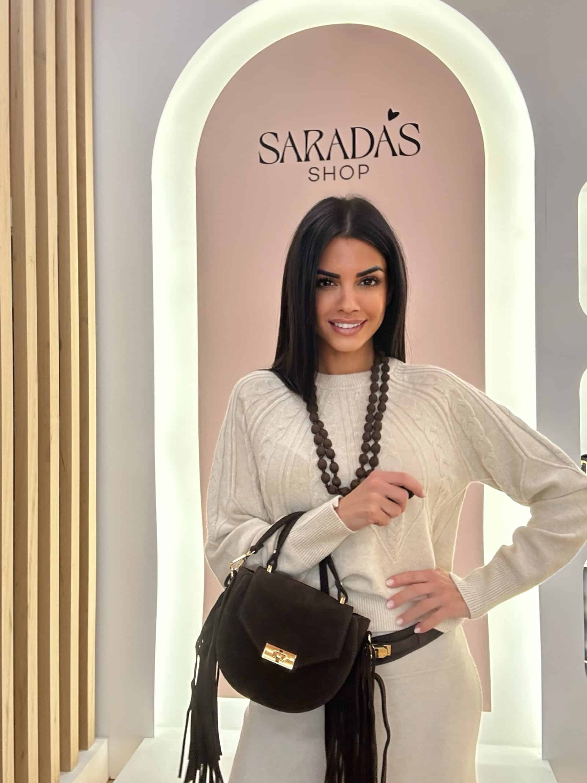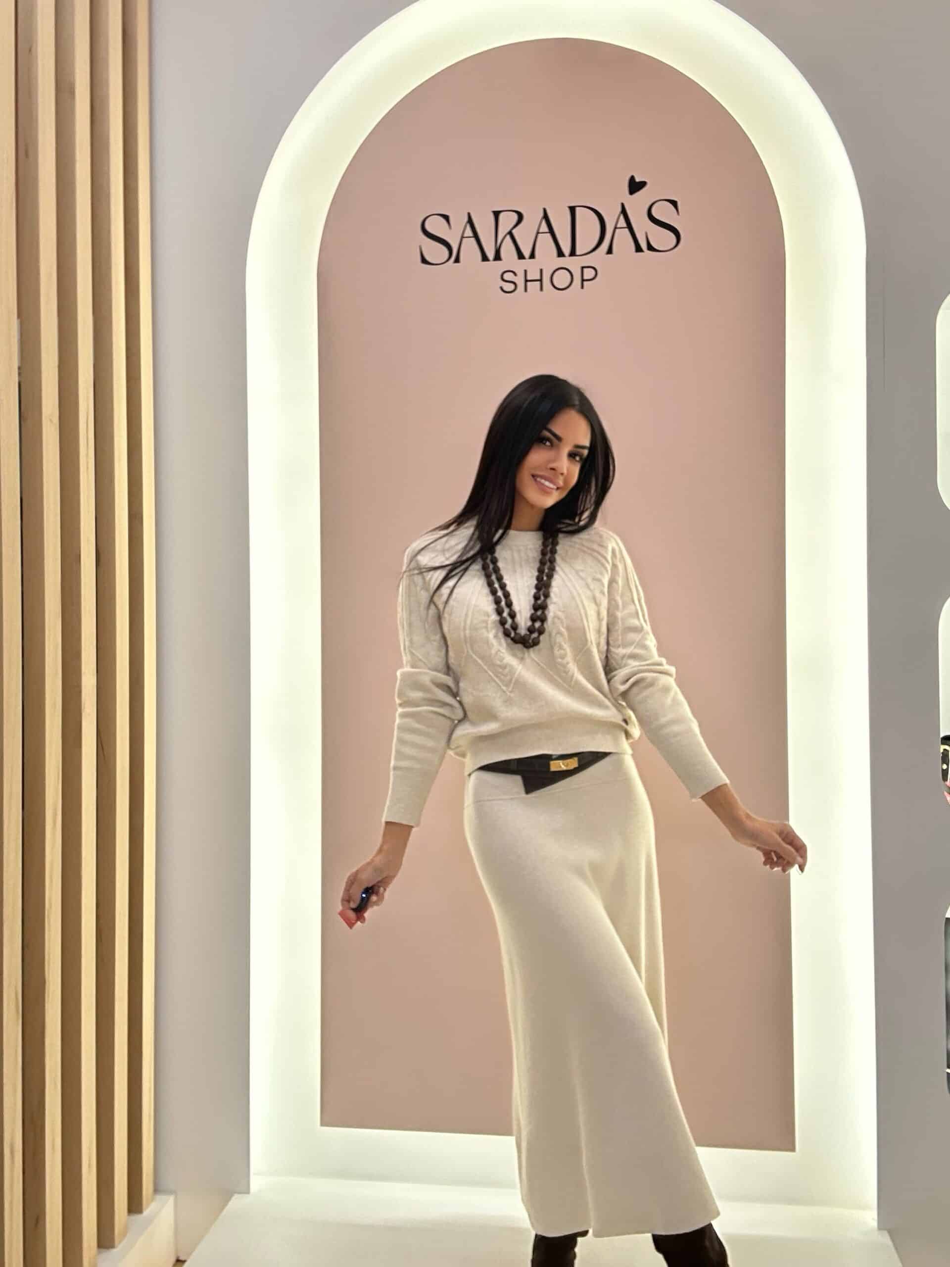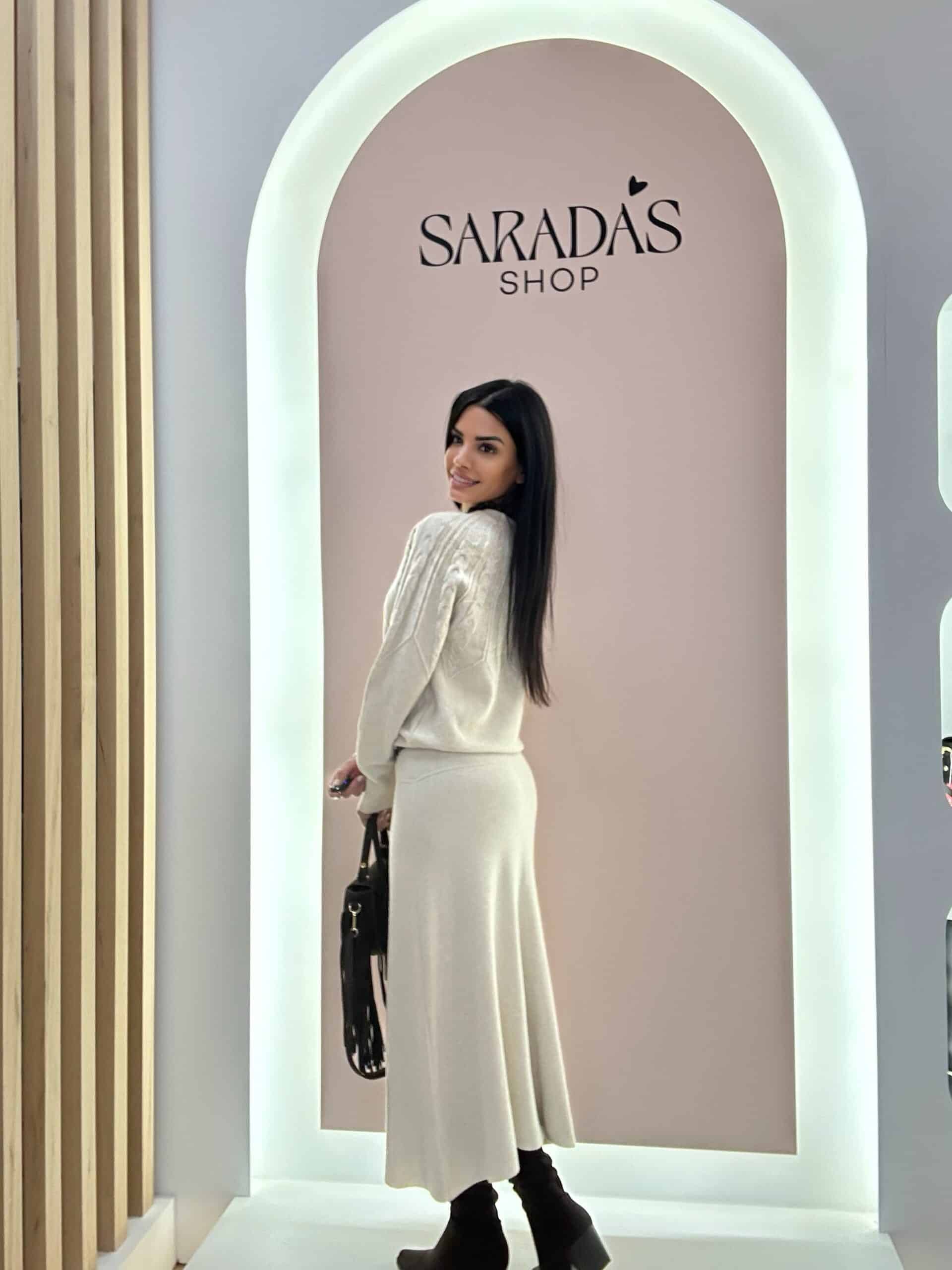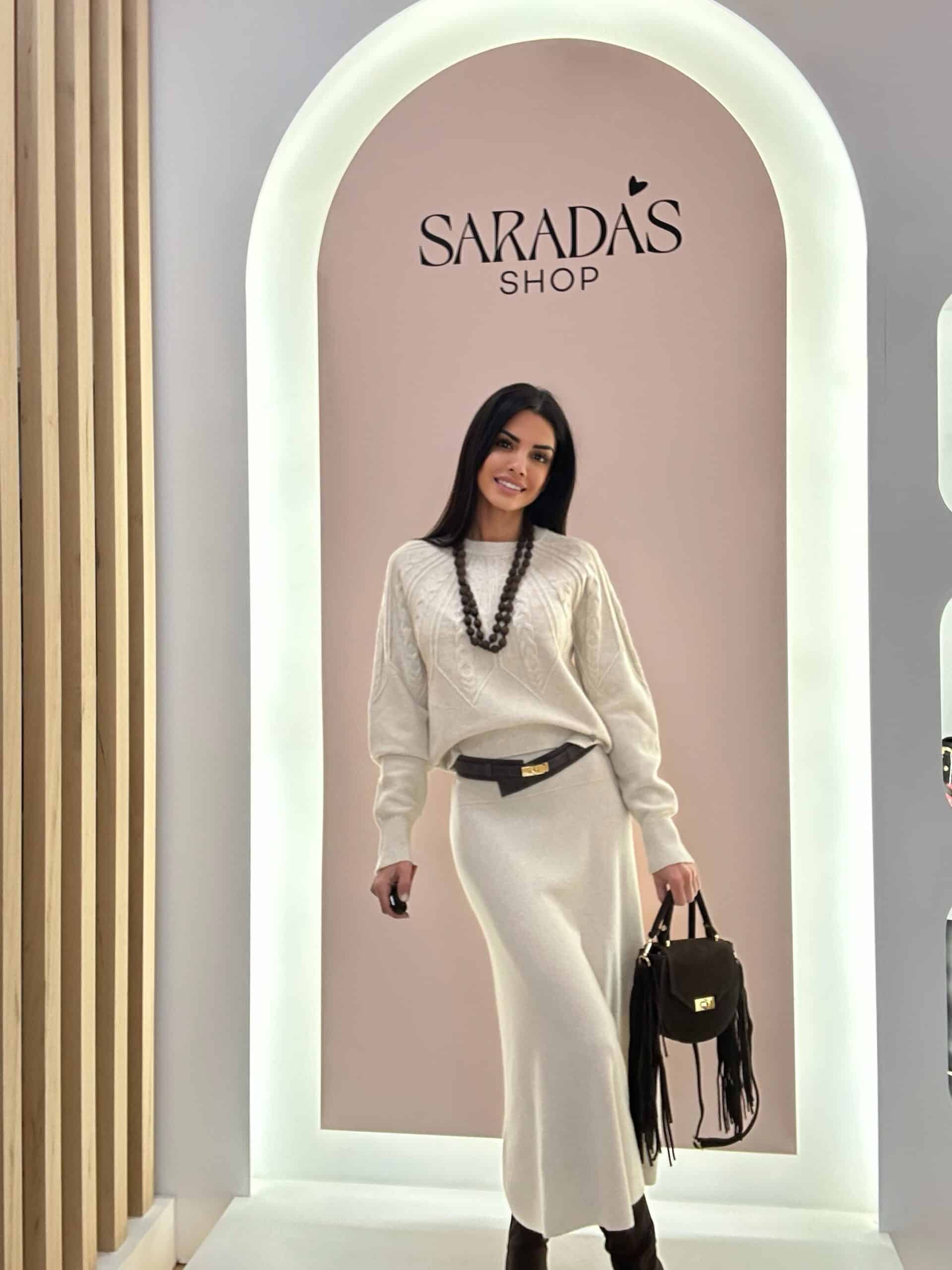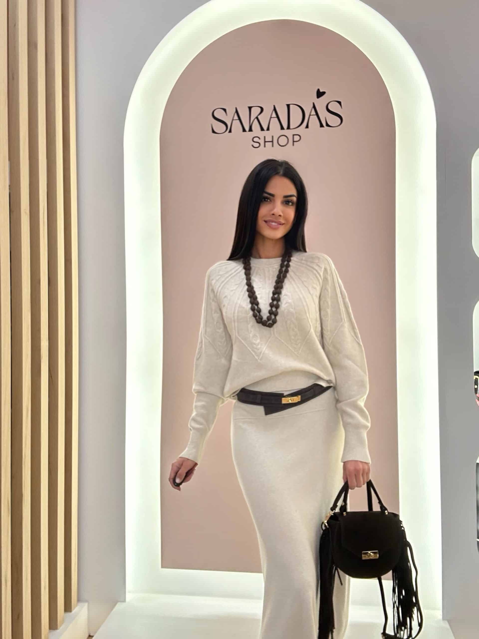 Conjunto en punto elástico en color crema, formado por jersey trenzado con cuello redondo, puños bajo y cuello en canalé, falda midi, corte evasé, ligero corte evasé, cintura elástica. Diseño Italiano.