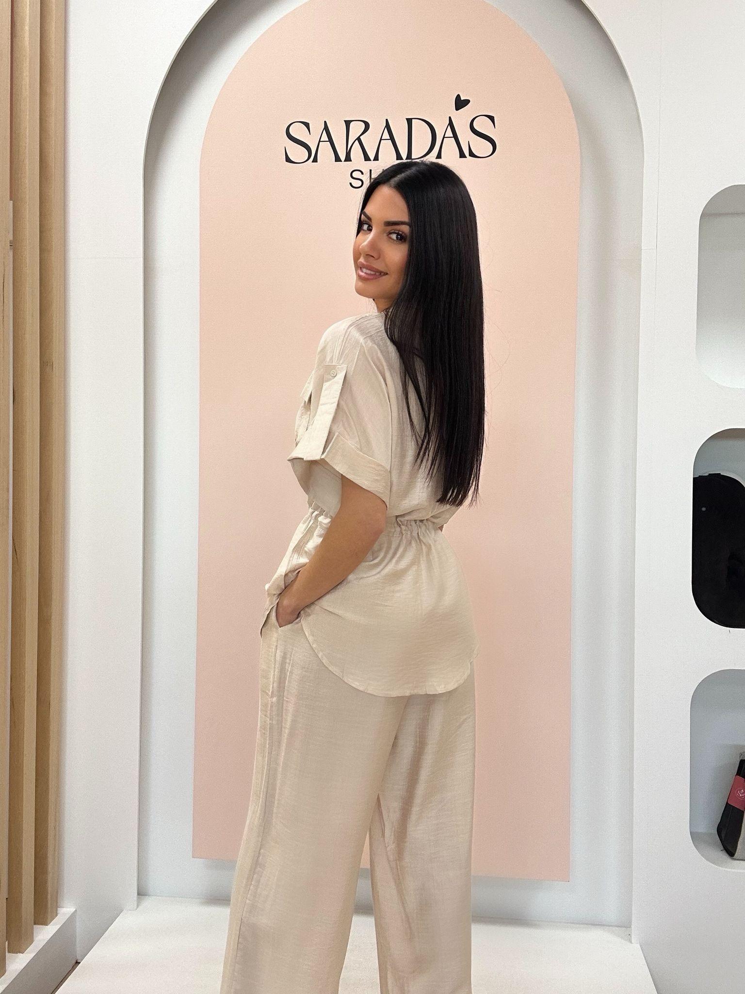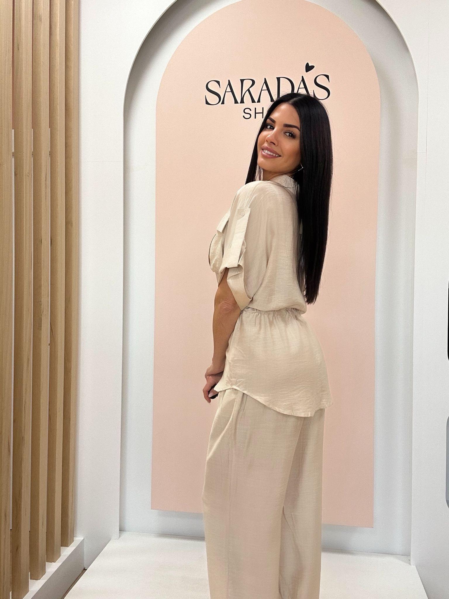 Conjunto fluido en mezcla de color beige, formado por camisa de cuello con solapa y botonadura central de cierre con ojal, manga corta con detalle de vuelta y trabilla al hombro y cinturón ajustable integrado, bolsillo cuadrado en pecho con solapa y pantalón largo en el mismo color, corte recto, bolsillos laterales y cintura elástica en laterales y trasera.