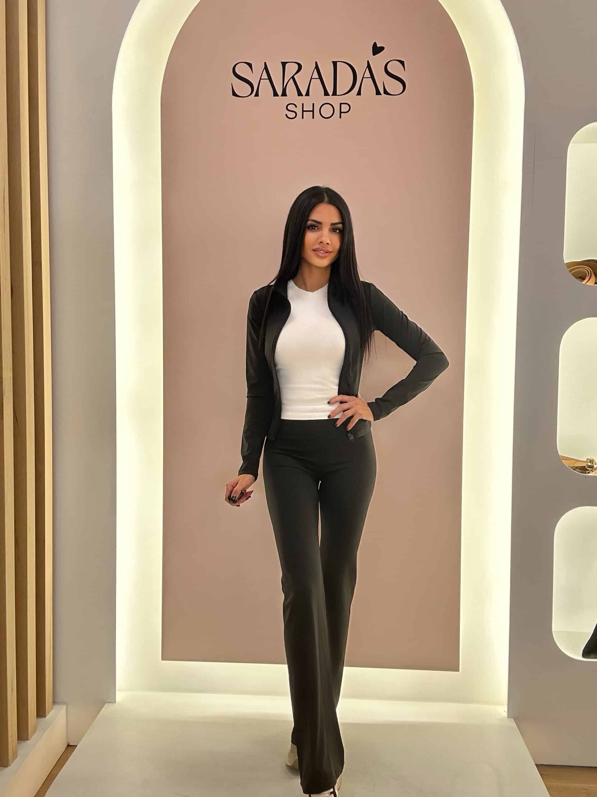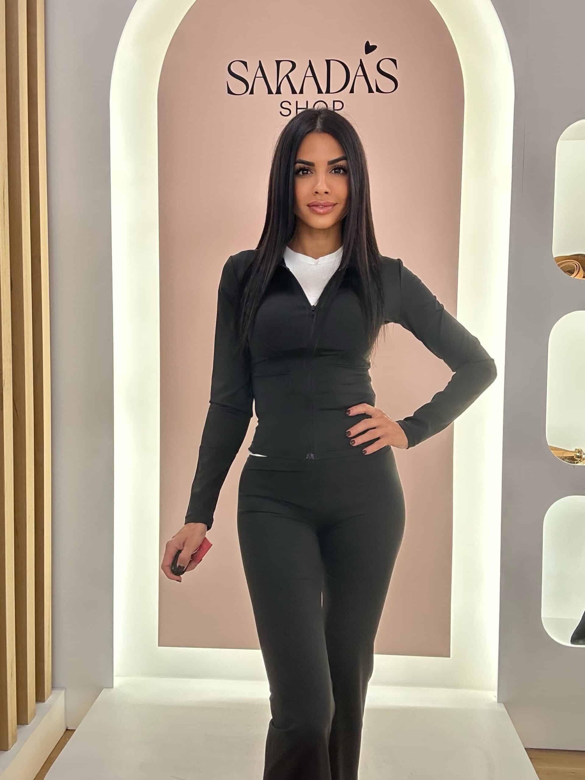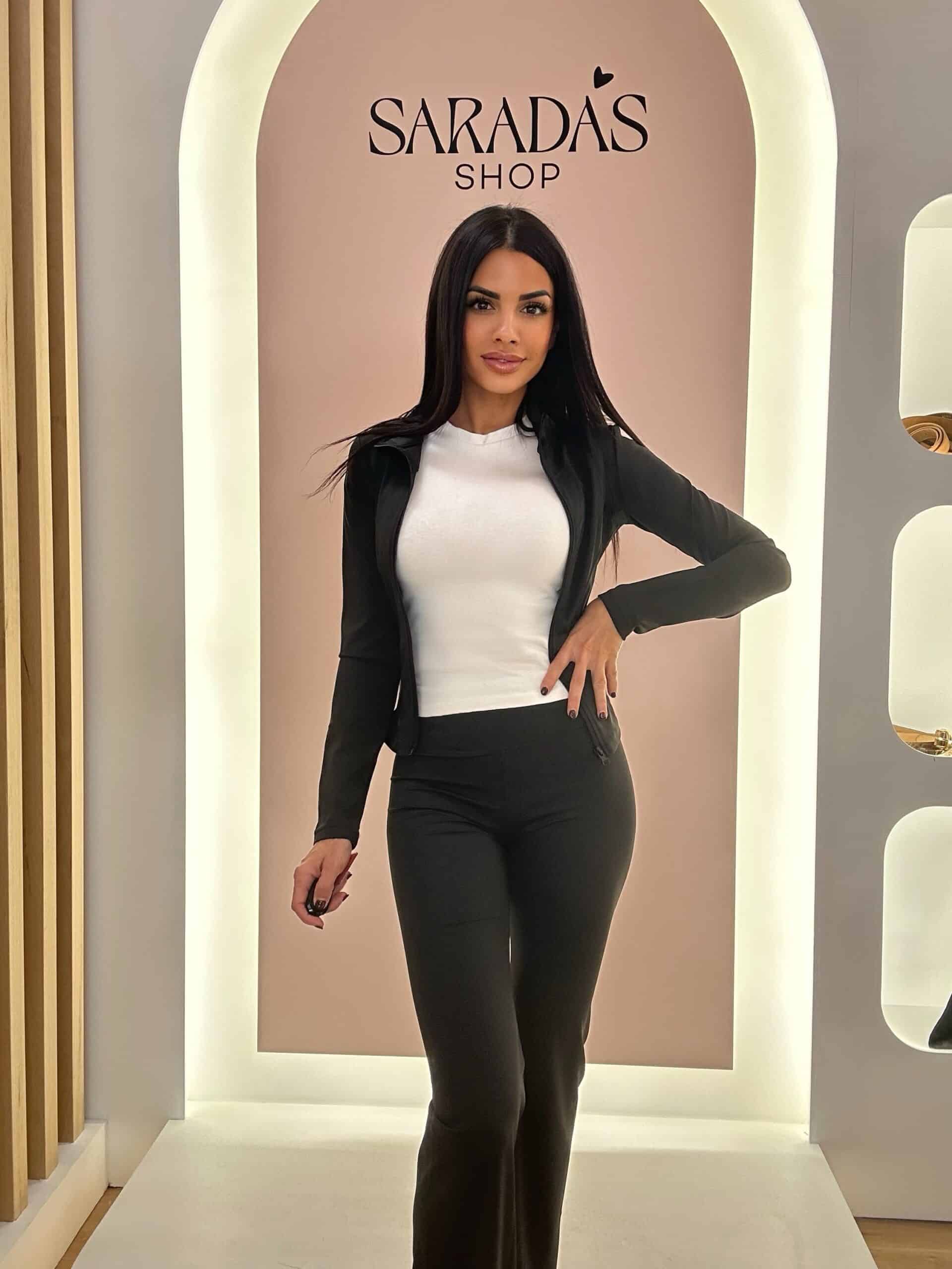 Conjunto en poliéster, de color negro, formado por chaqueta entallada de cierre con cremallera y cuello mal, y leggin flare en el mismo color, tiro alto, cintura con elástico, detalle de fruncido en la parte trasera. Elige tu talla: S/M(34/36), M/L(38/40). 83%Poliéster. 17%Elastan.