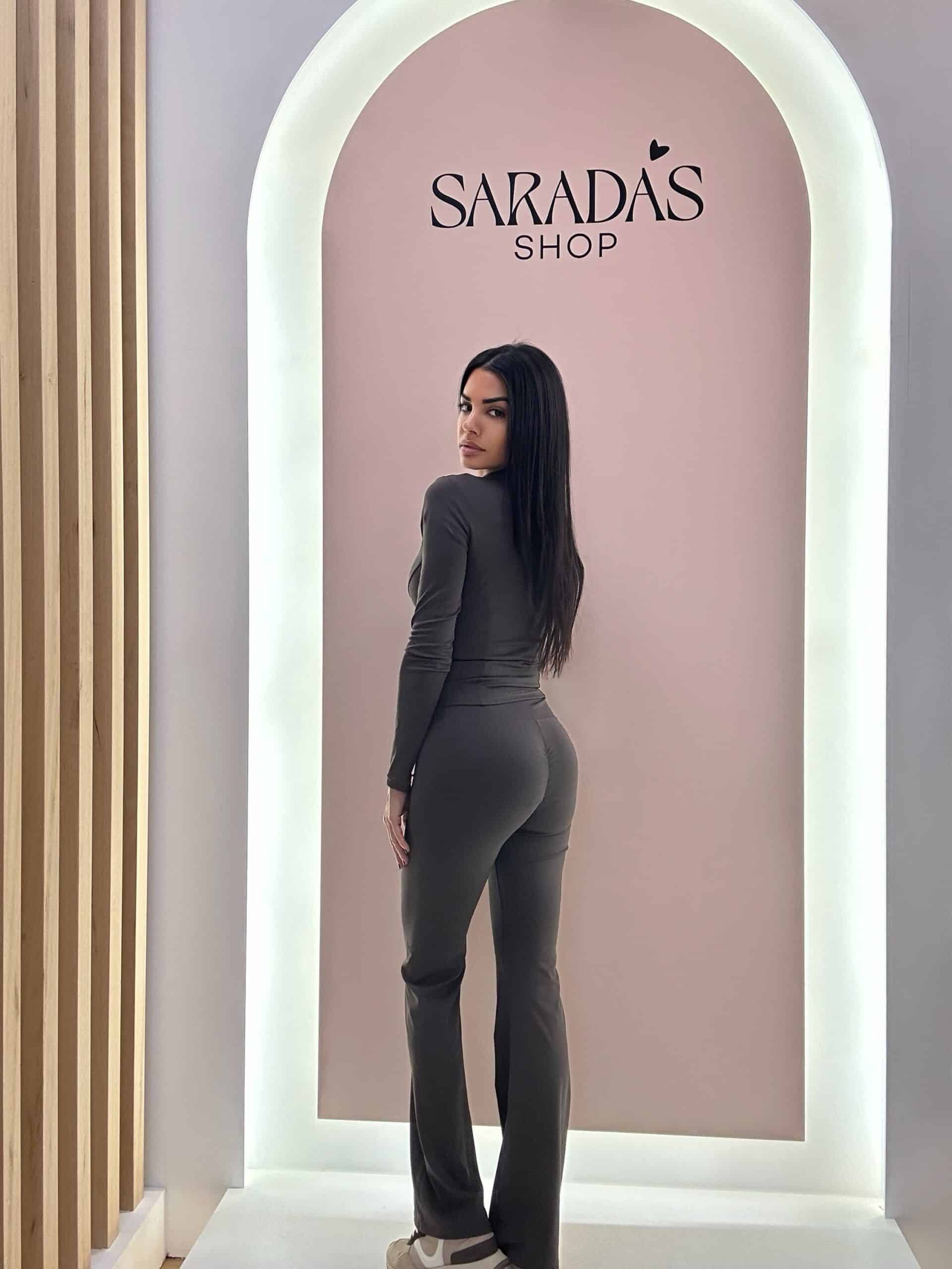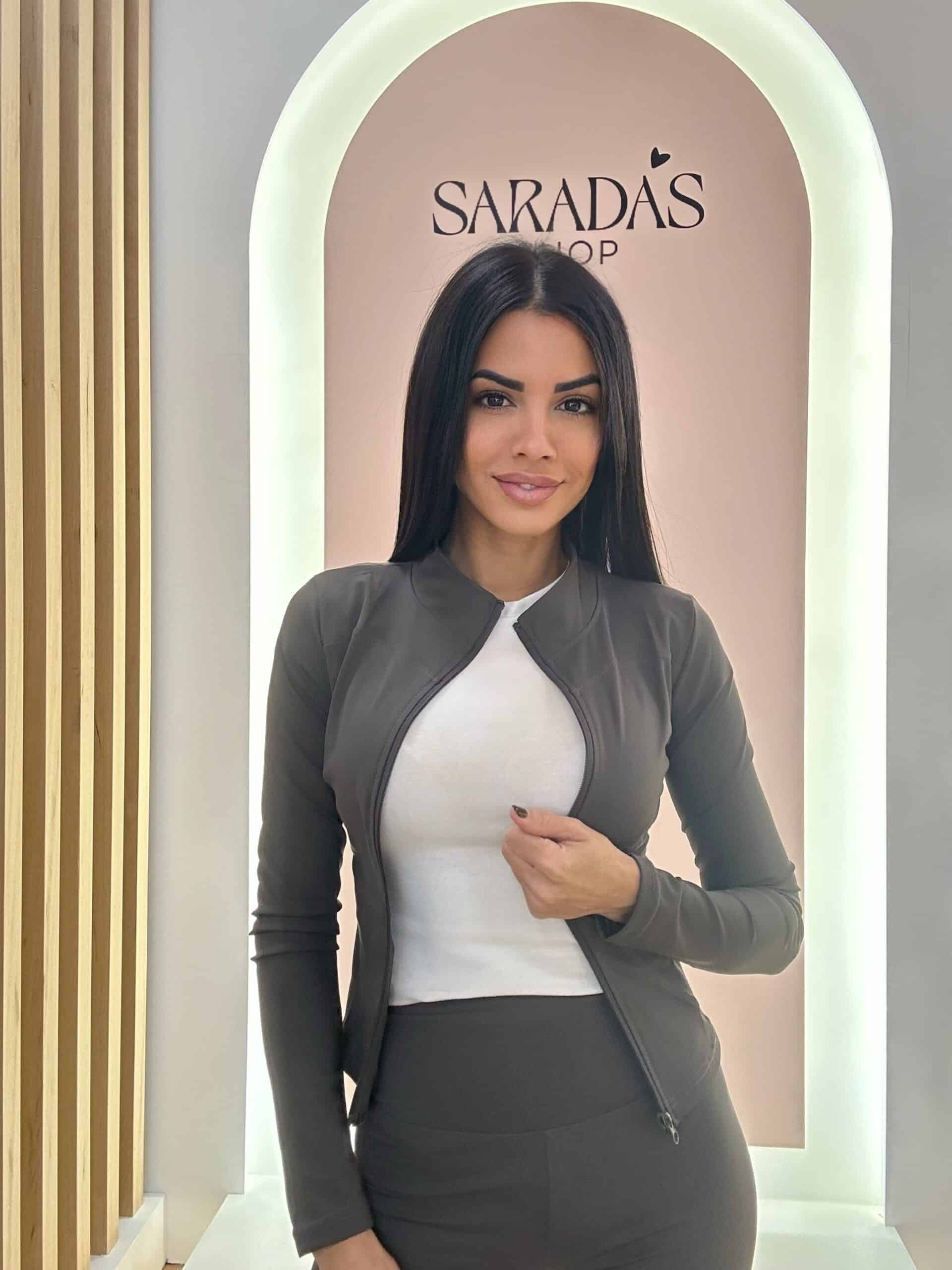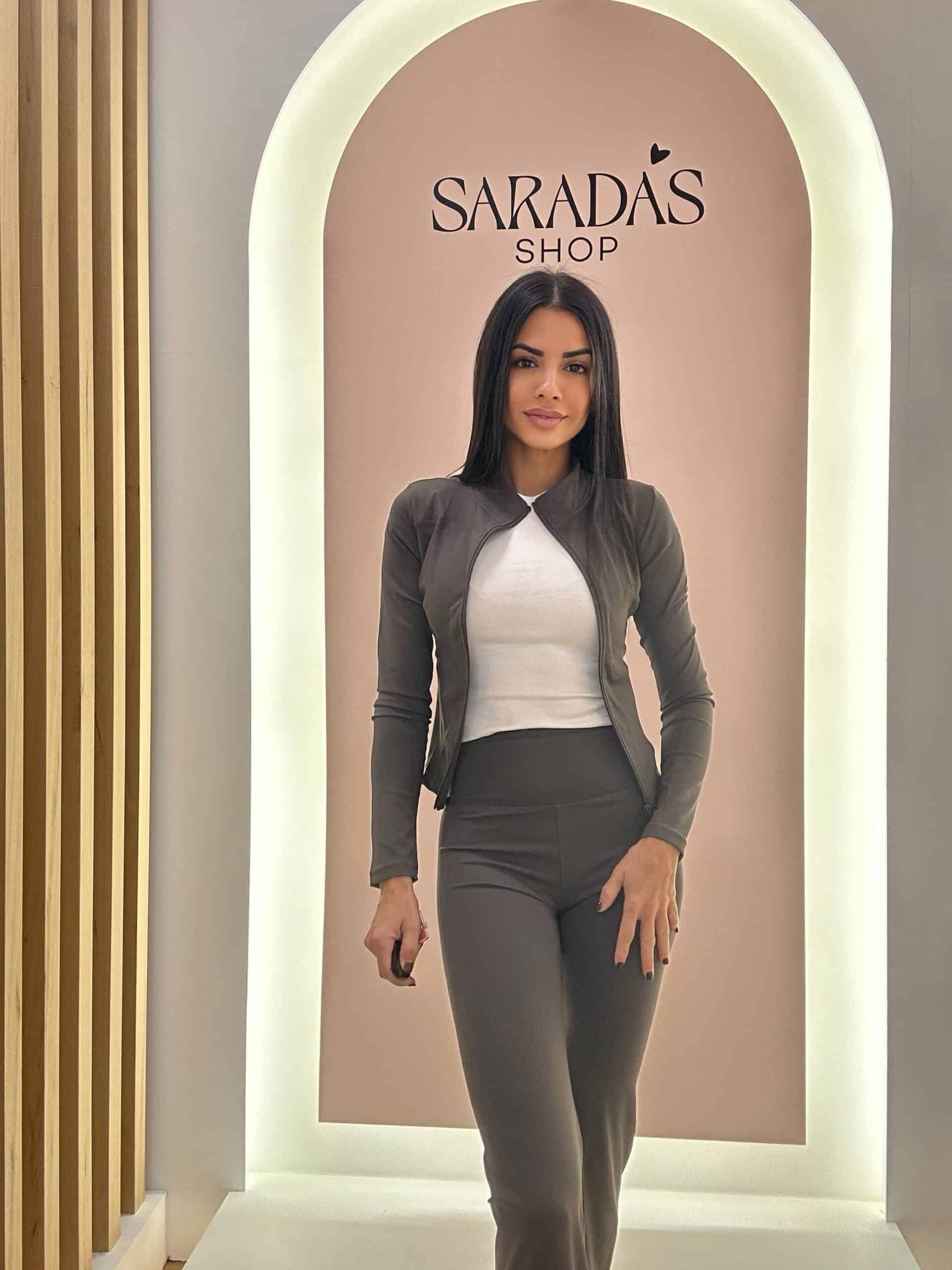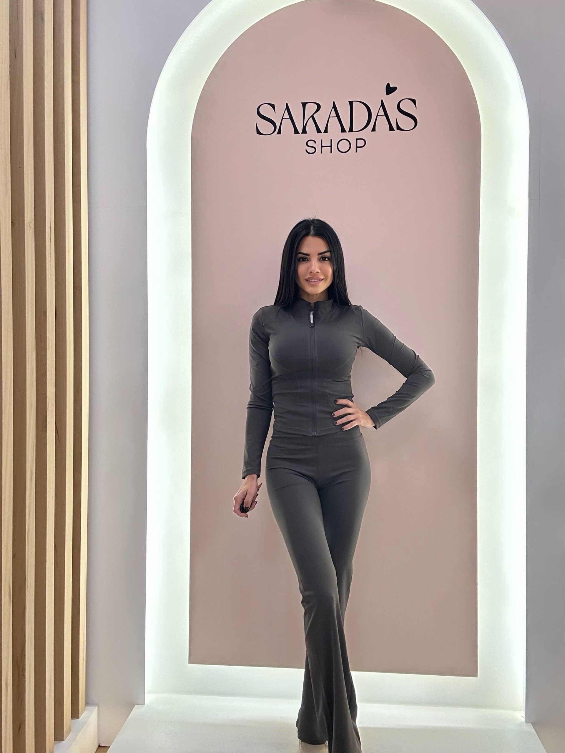 Conjunto en poliéster, de color topo, formado por chaqueta entallada de cierre con cremallera y cuello mal, y leggin flare en el mismo color, tiro alto, cintura con elástico, detalle de fruncido en la parte trasera.