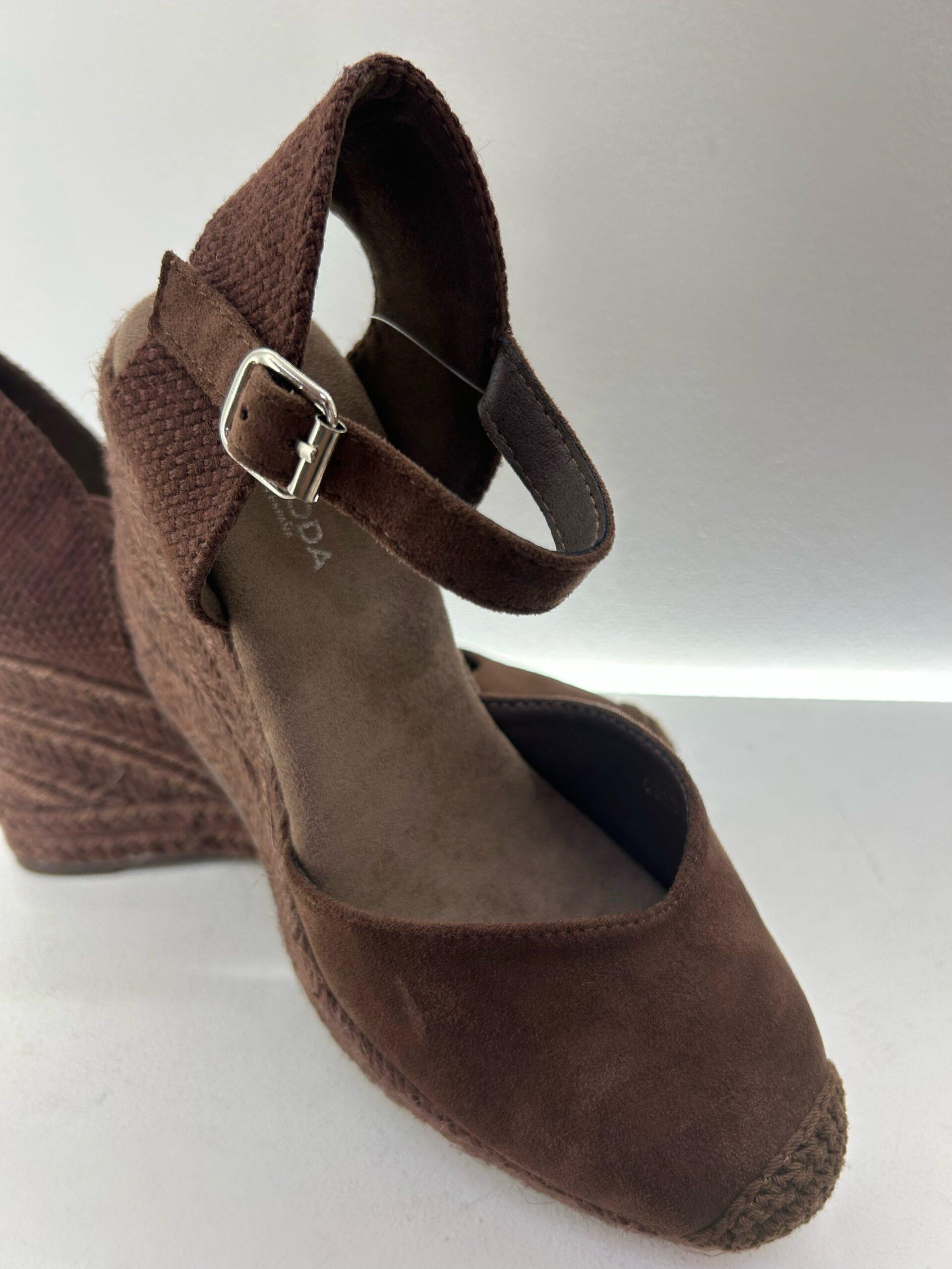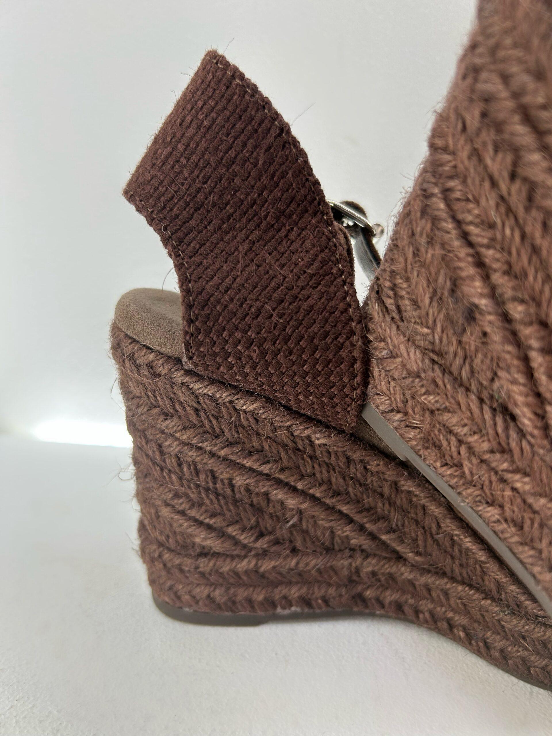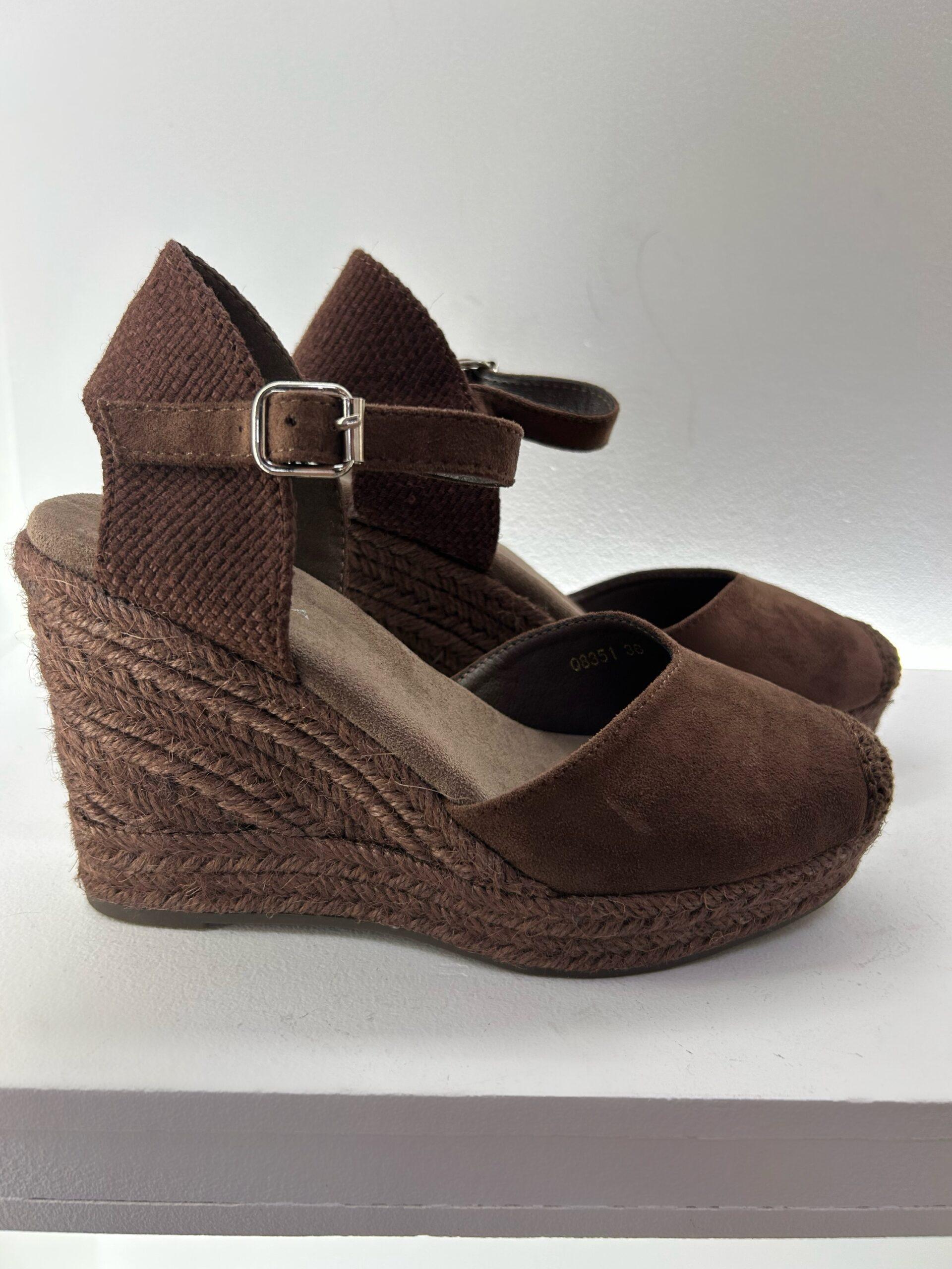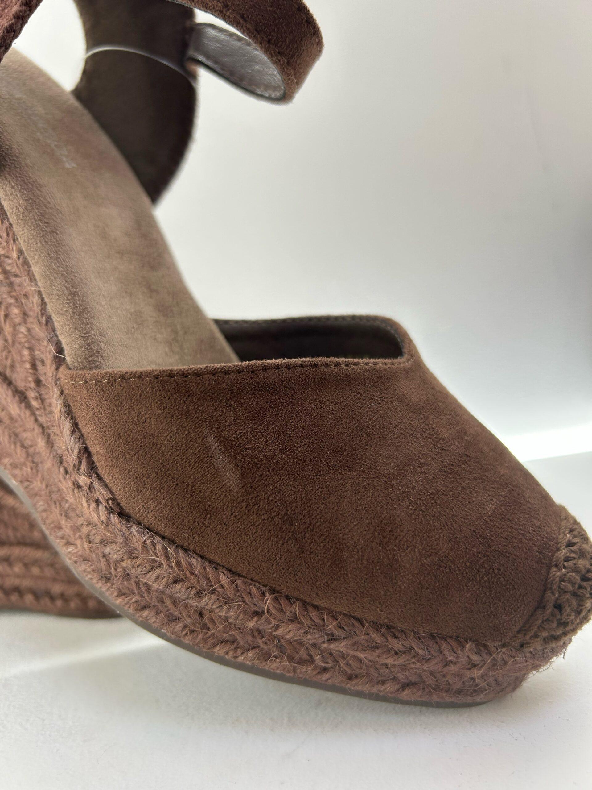 Cuña de esparto, en antelina de color marrón, cierre con hebilla ajustable al tobillo y pequeño elástico, puntera en ganchillo y detalle de escote en V. Diseñada en España. Elije tu talla: Talla habitual, si estas entre dos números, elige el más pequeño. 35, 36, 37, 38, 39, 40 Tacón 9cm.