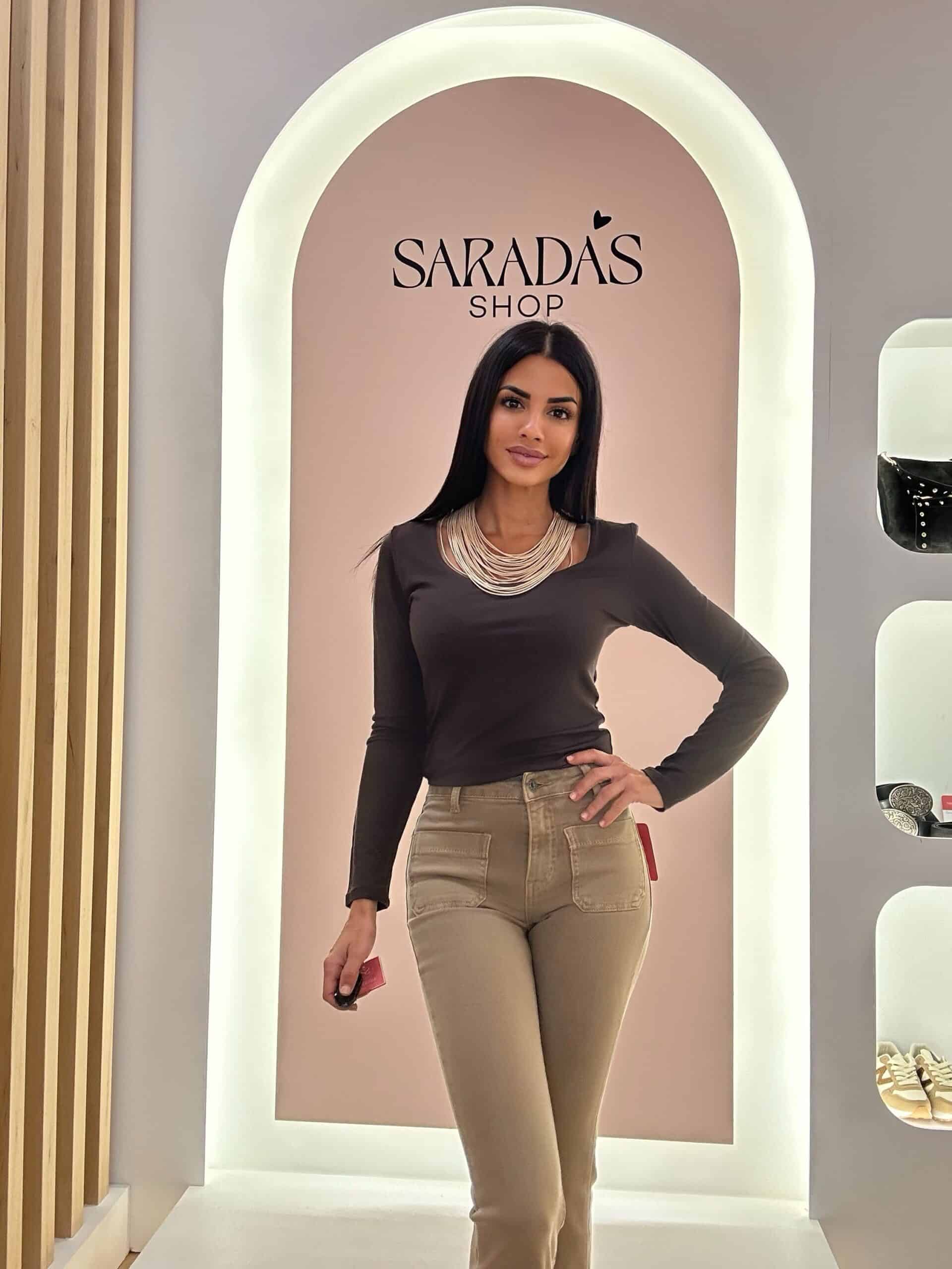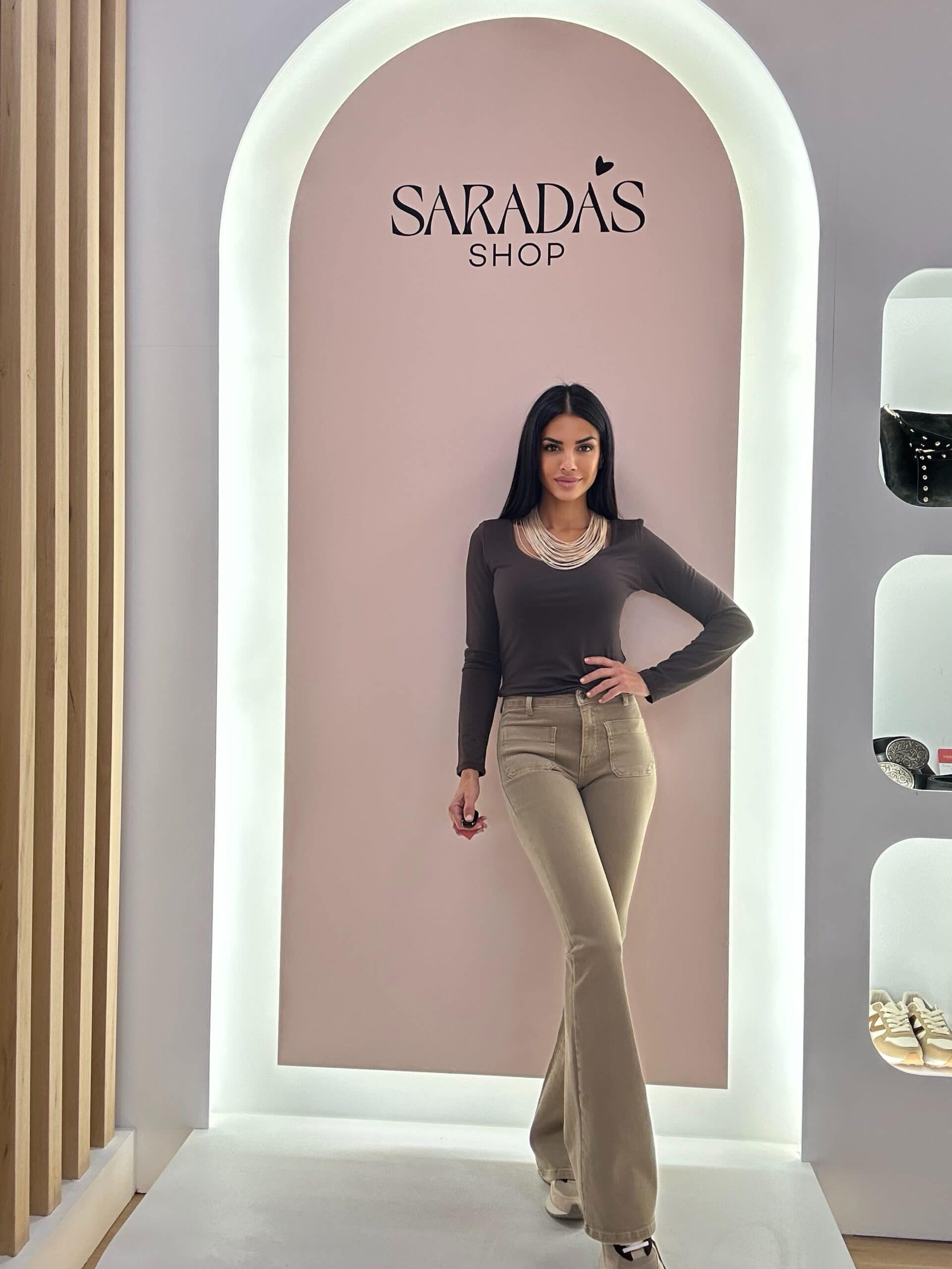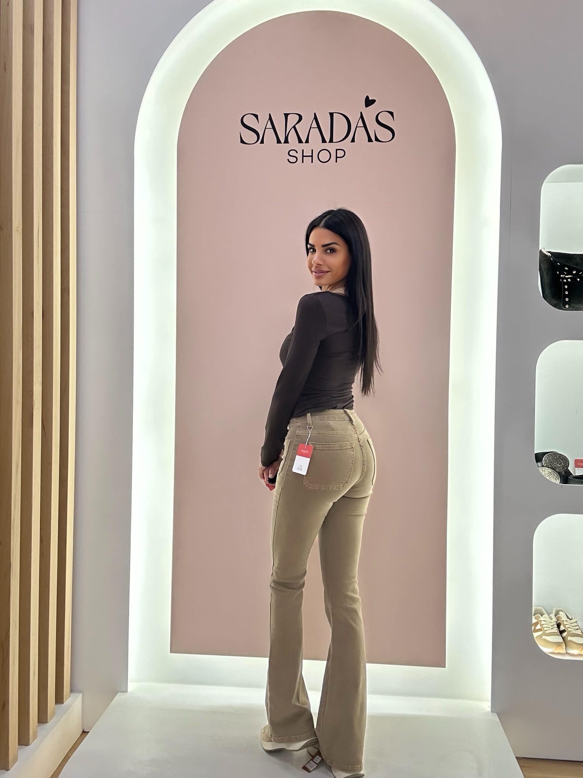 Pantalón denim en color arena, con detalle de bolsillos cuadrados delanteros, tiro medio, cierre con botón en color plateado, corte flared. Contiene elastano.