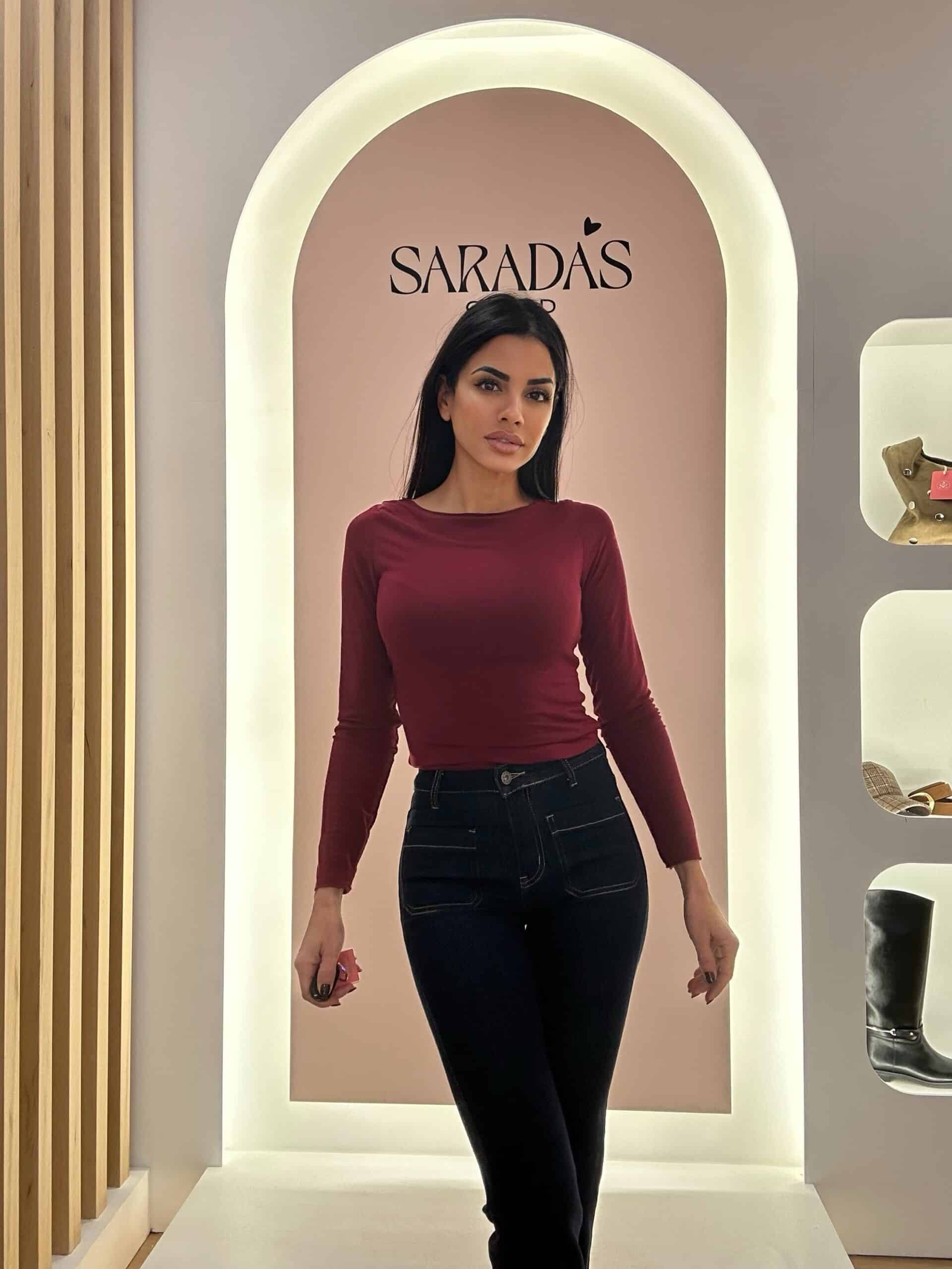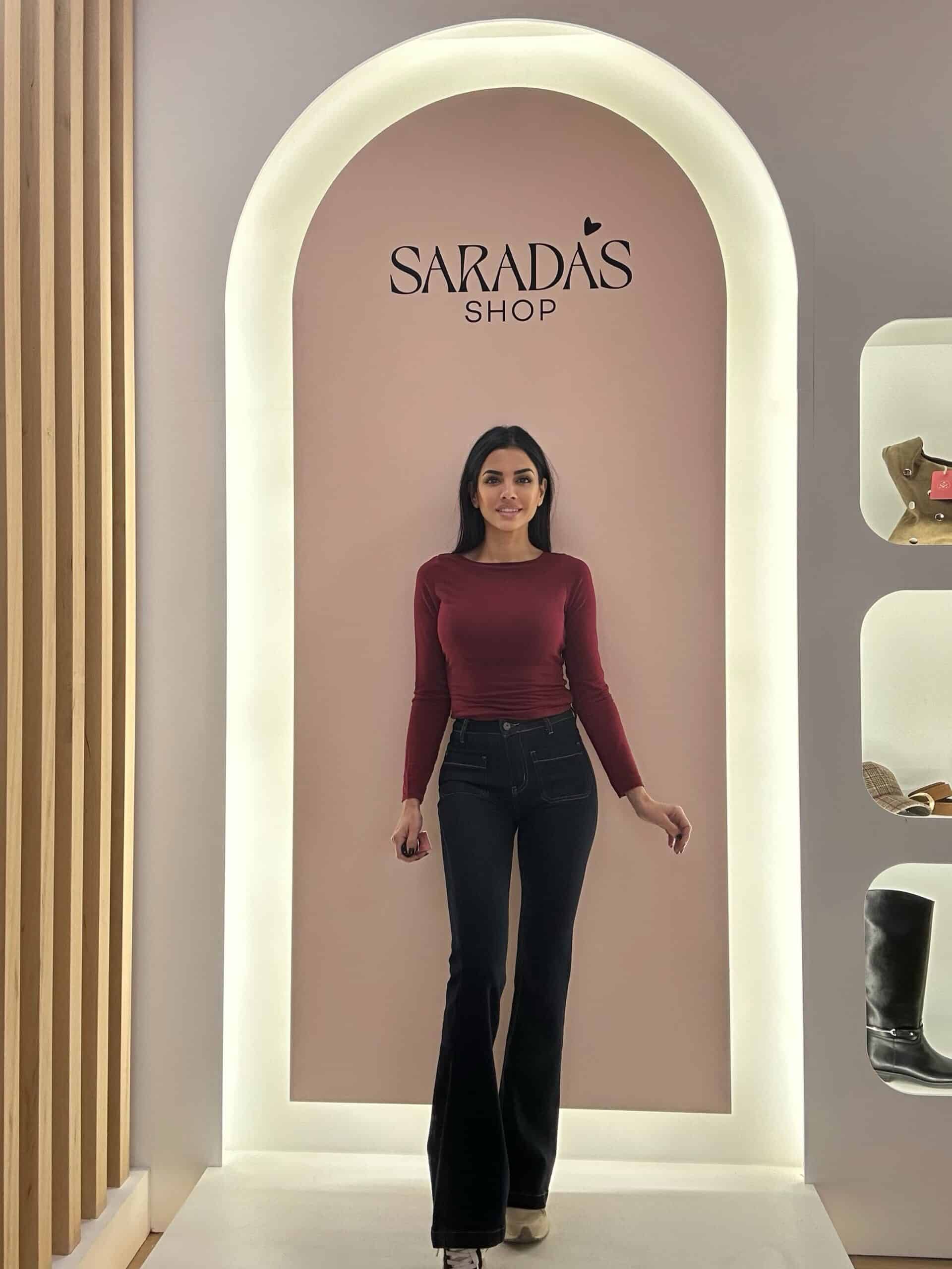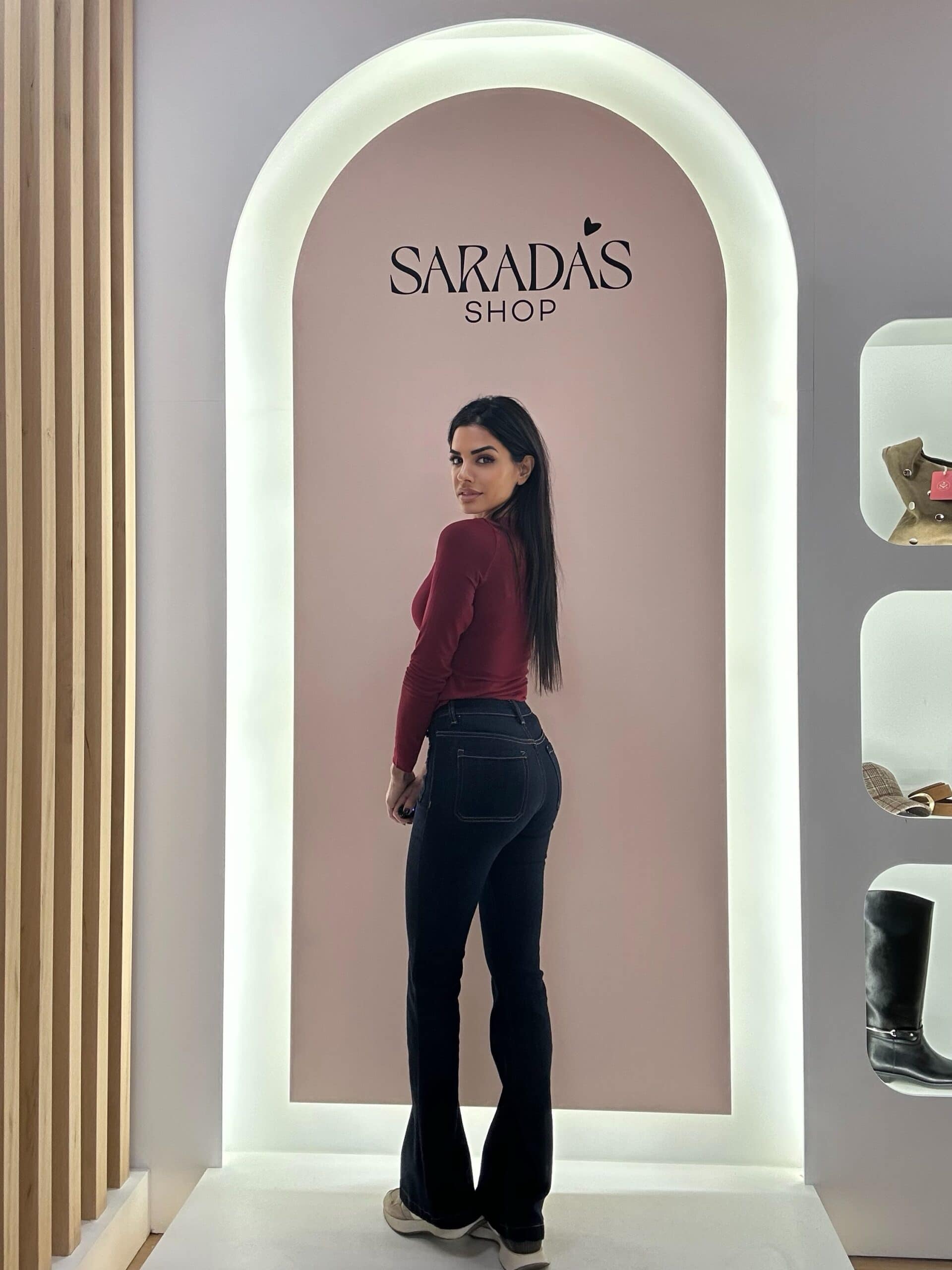 Pantalón denim en color azul oscuro con costuras camel, detalle de bolsillos cuadrados delanteros, tiro medio, cierre con botón en color plateado, corte flared. Contiene elastano.