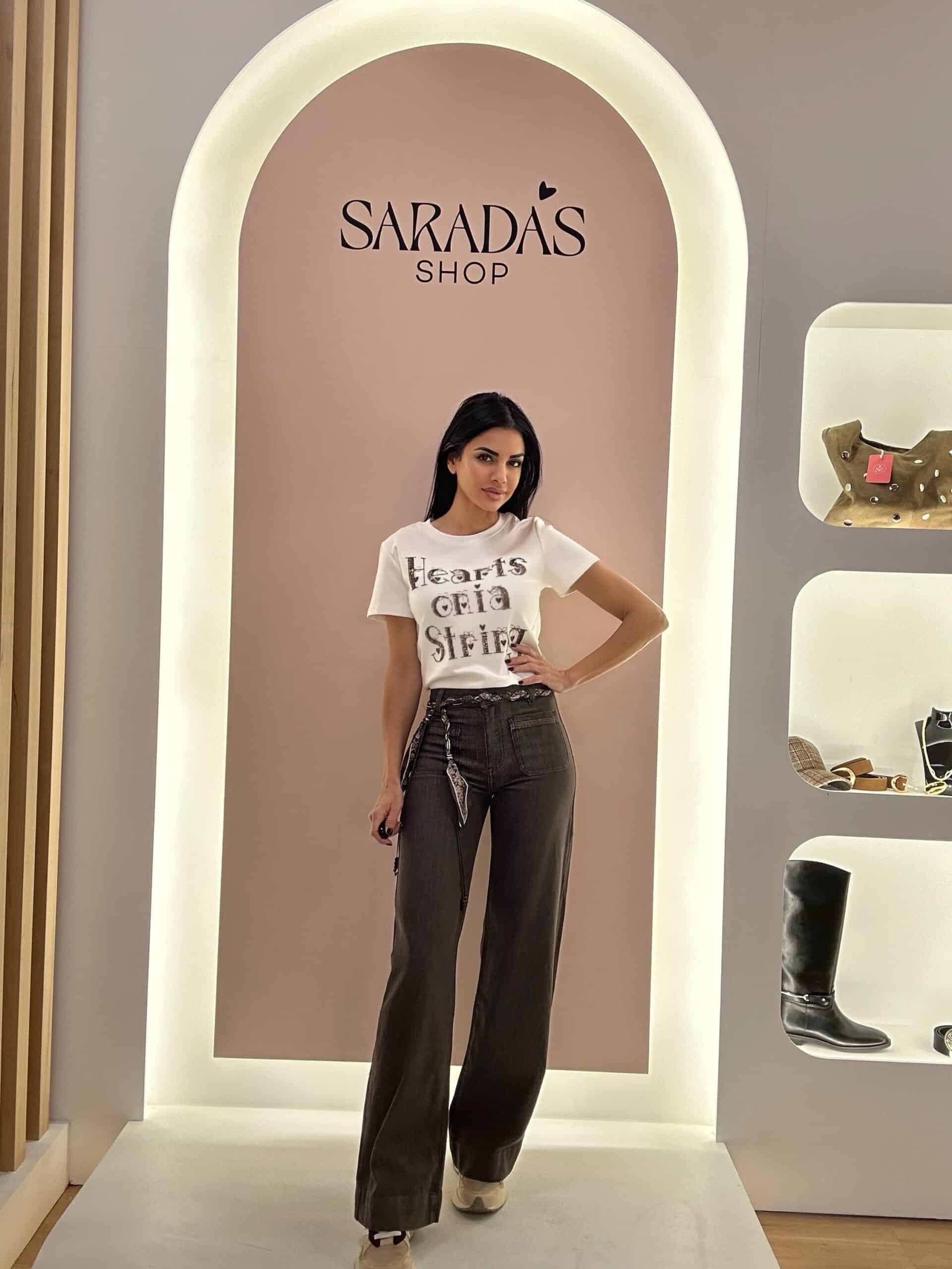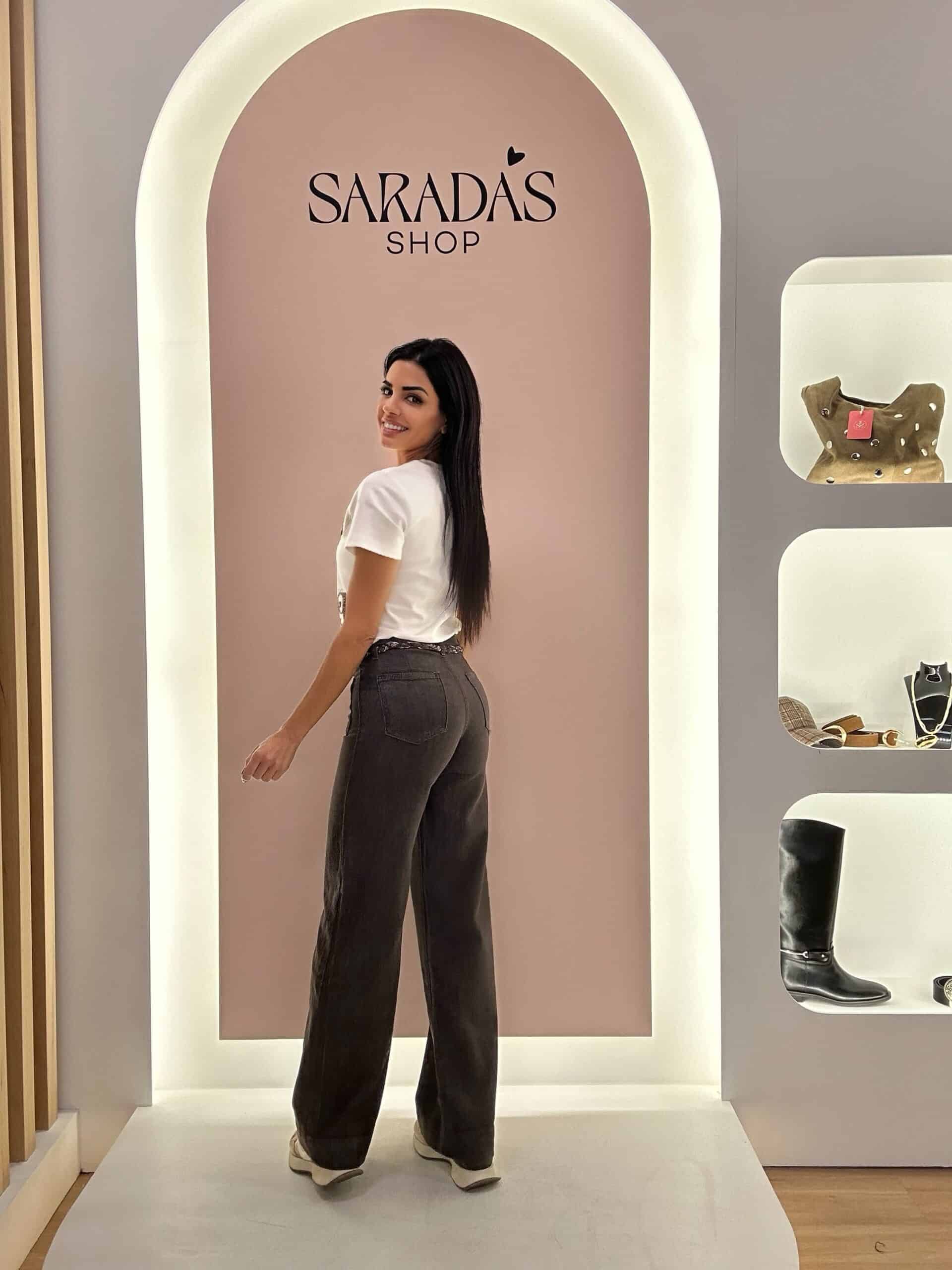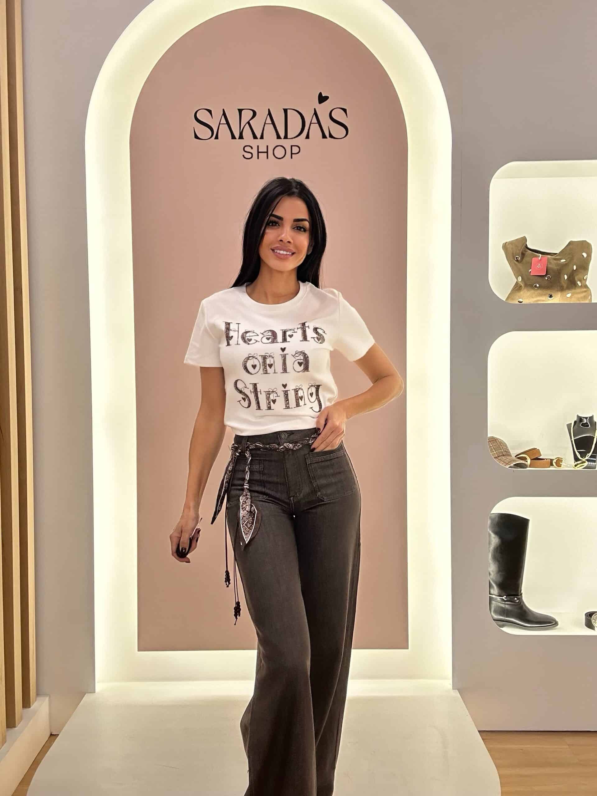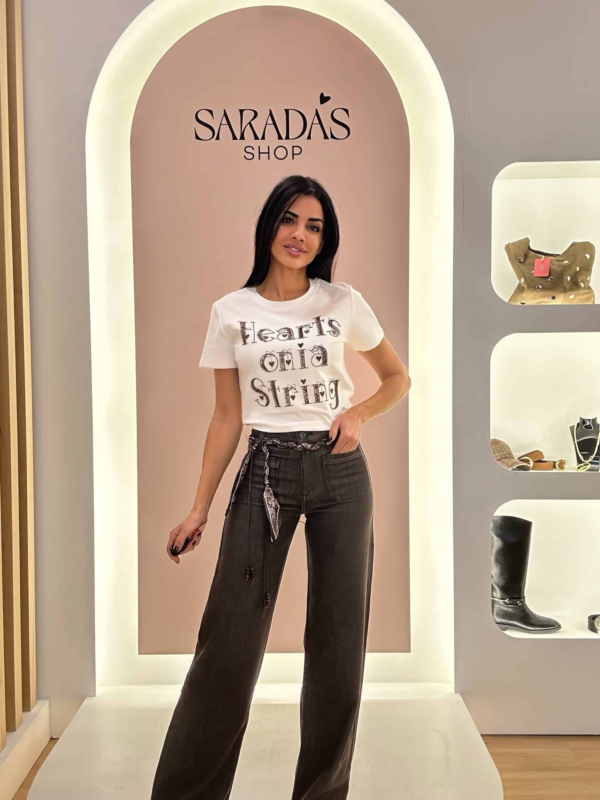 Pantalón denim color chocolate, tiro alto, corte recto(wide leg), bolsillos cuadrados, detalle de cinturón entrelazado de cuerda y pañuelo con cuentas que cuelgan. No contienen Elastano