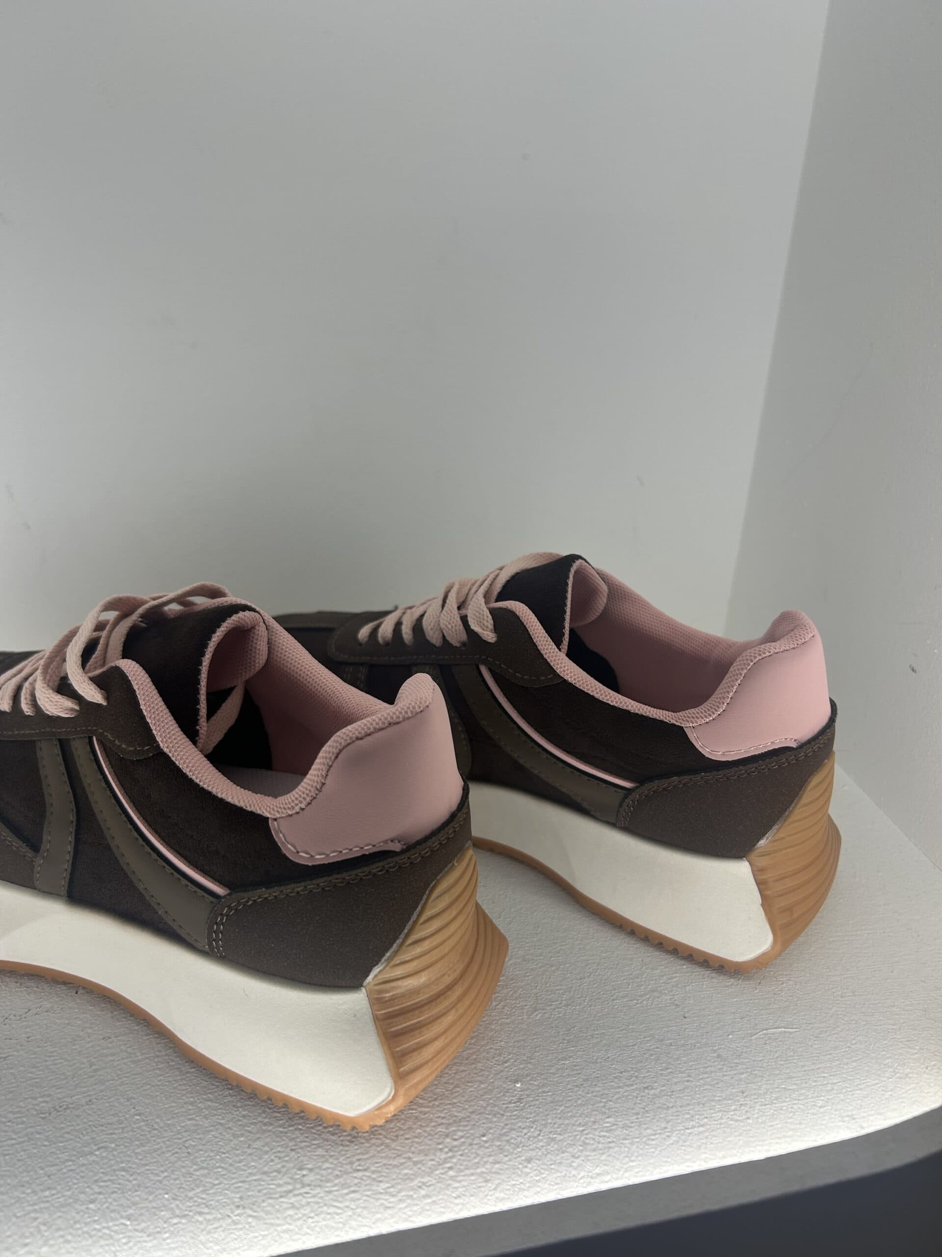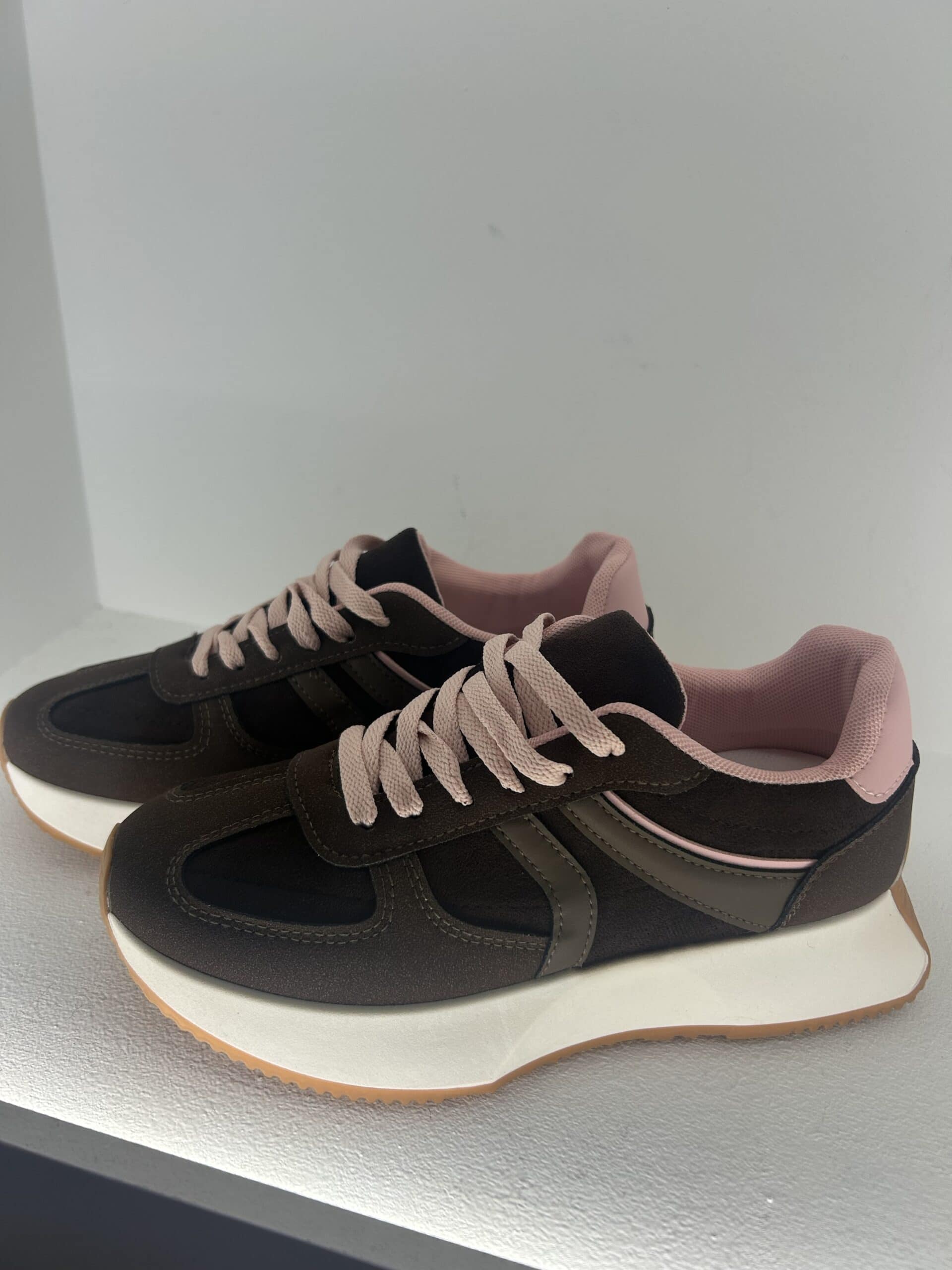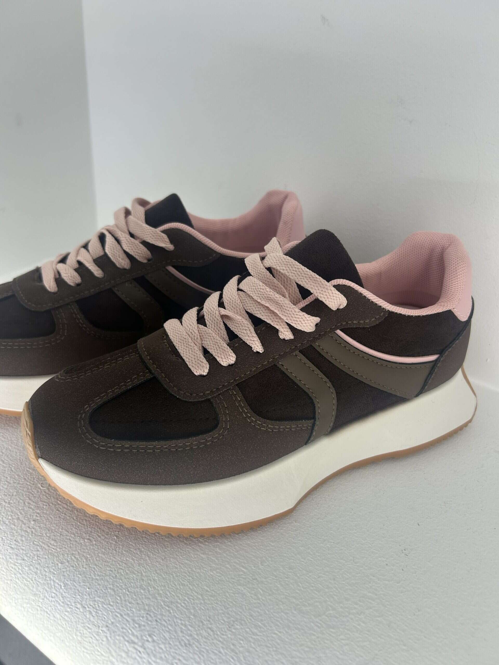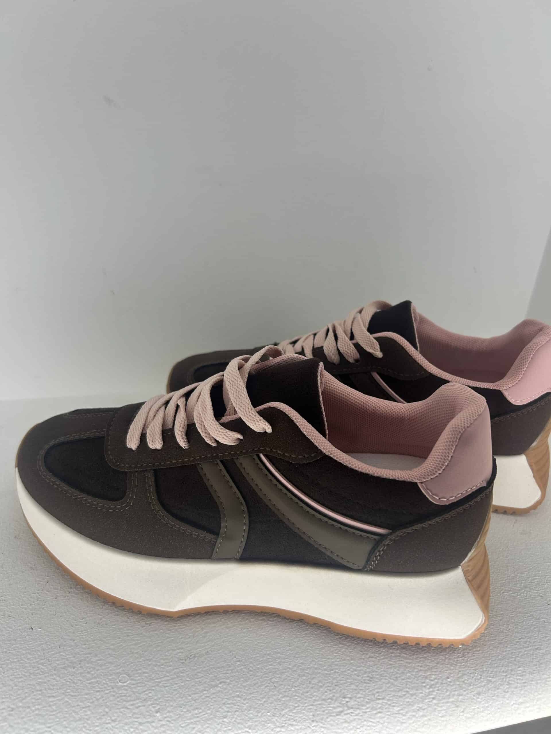 Deportiva en color marrón chocolate y rosa, con detalles en antelina. Cordones rosas, suela engomada, plataforma blanca. Elige tu talla,(talla habitual) 36-37-38-39-40-41