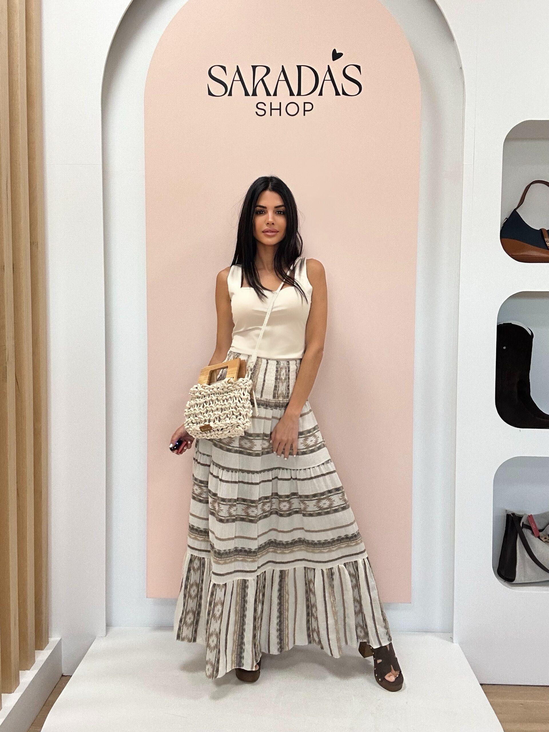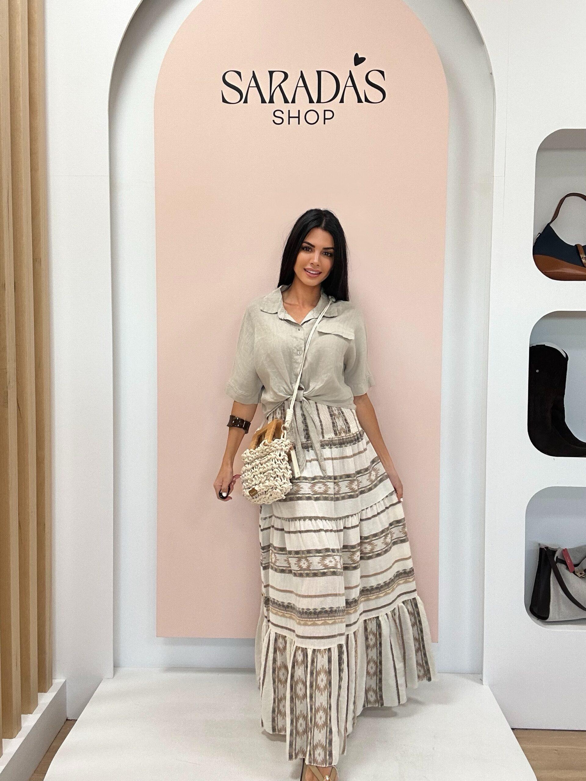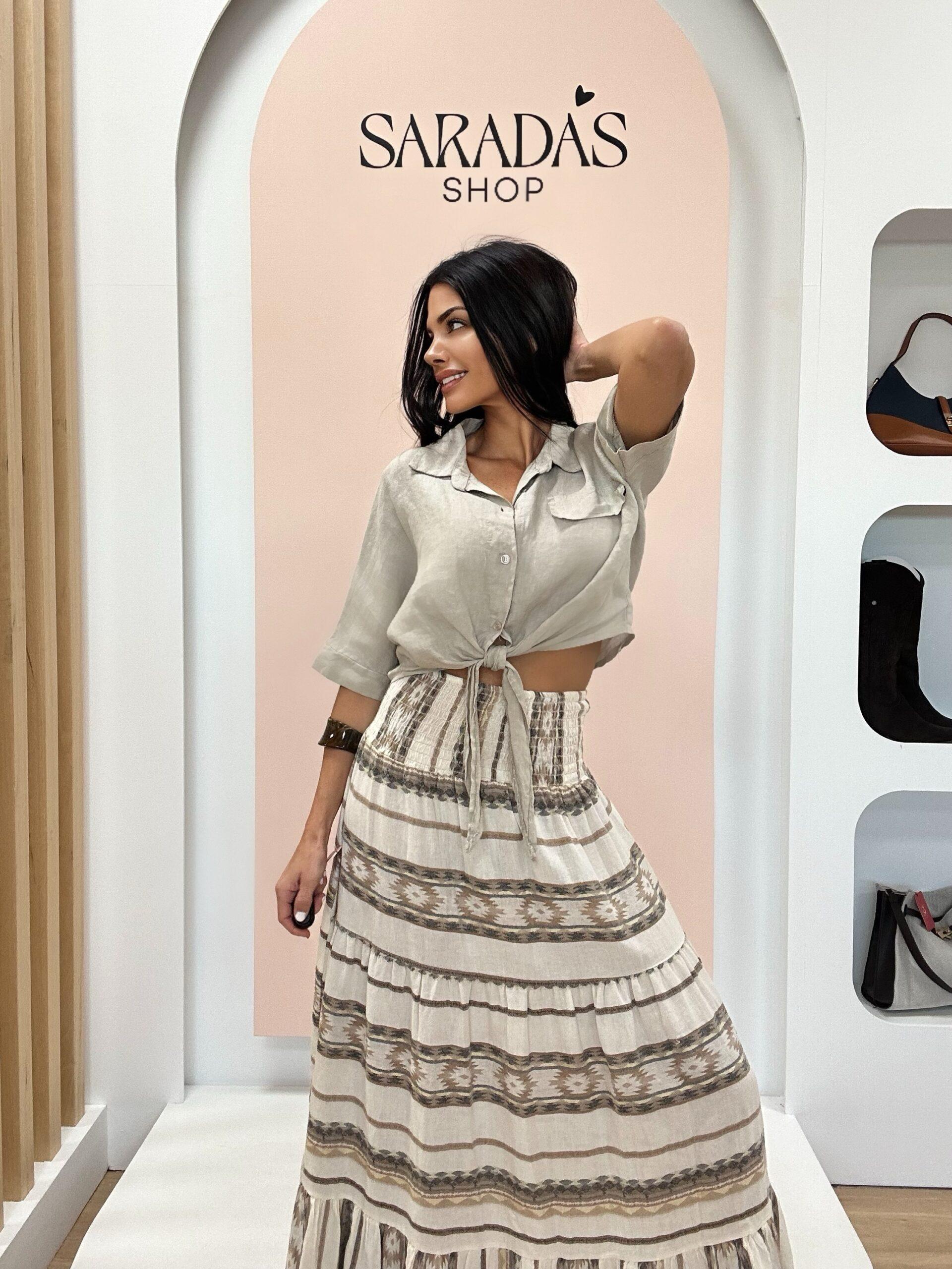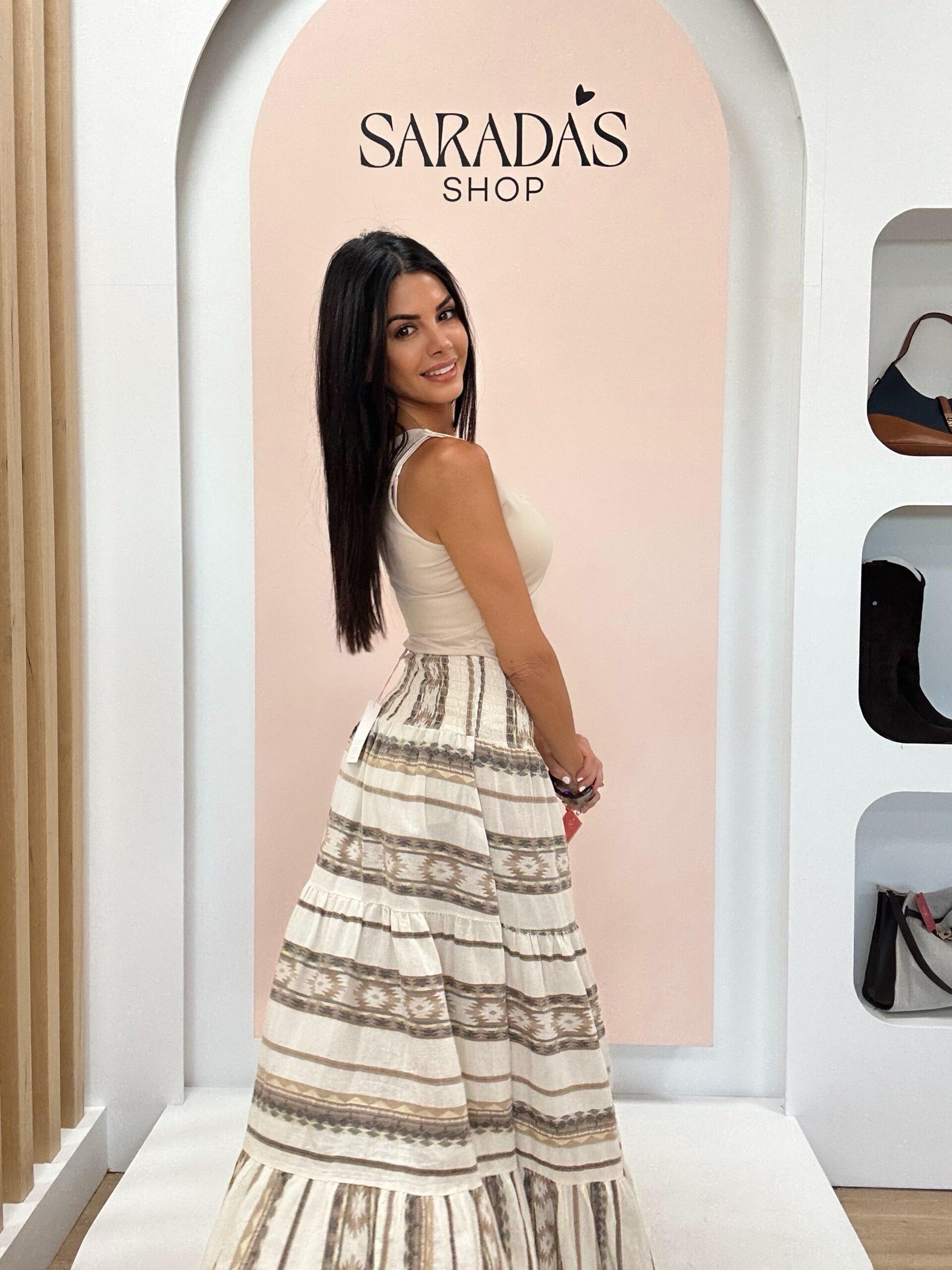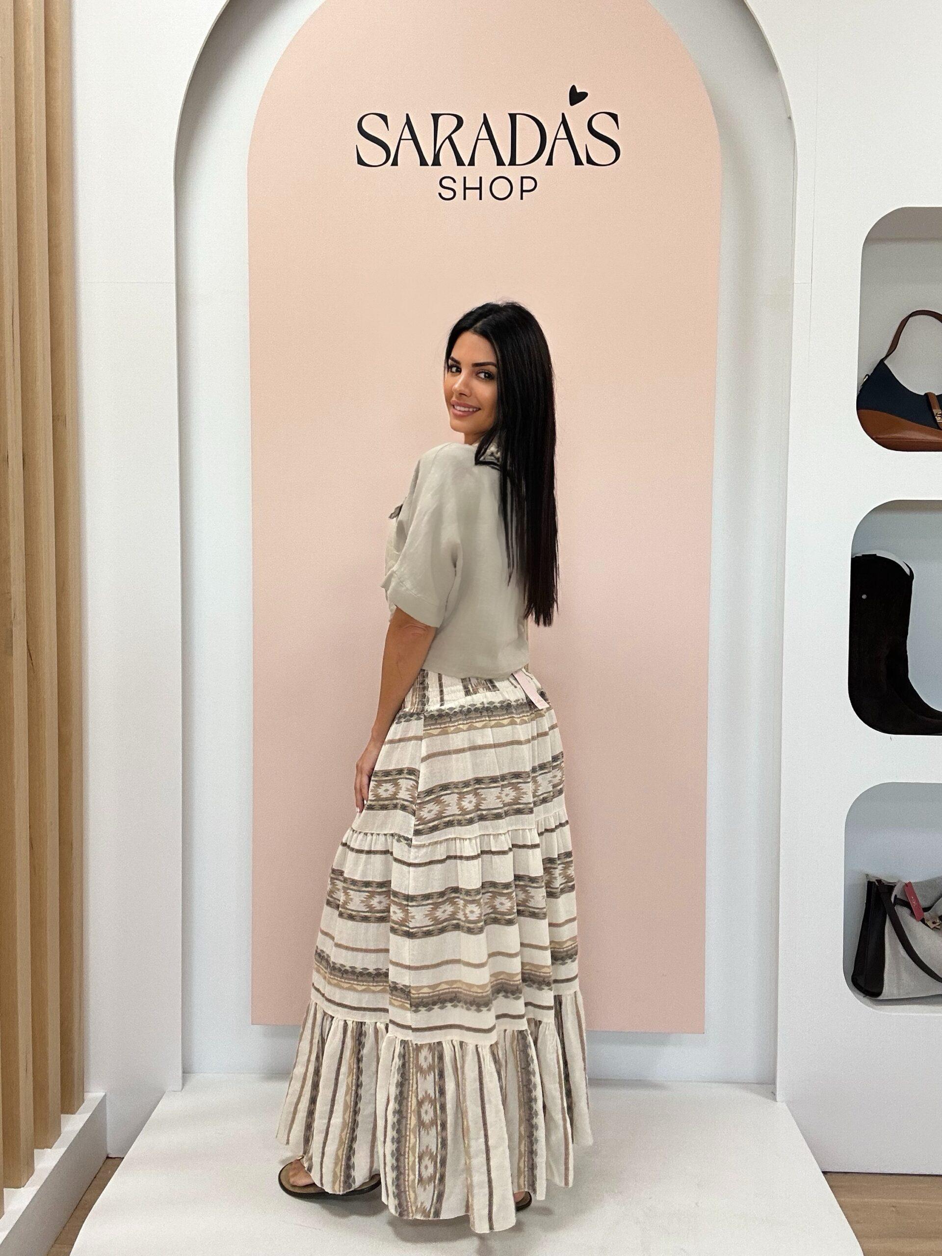 Falda en mezcla, estampado geométrico, en colores neutros, cintura elástica en panal de abeja, detalle de costuras. Diseño Italiano.