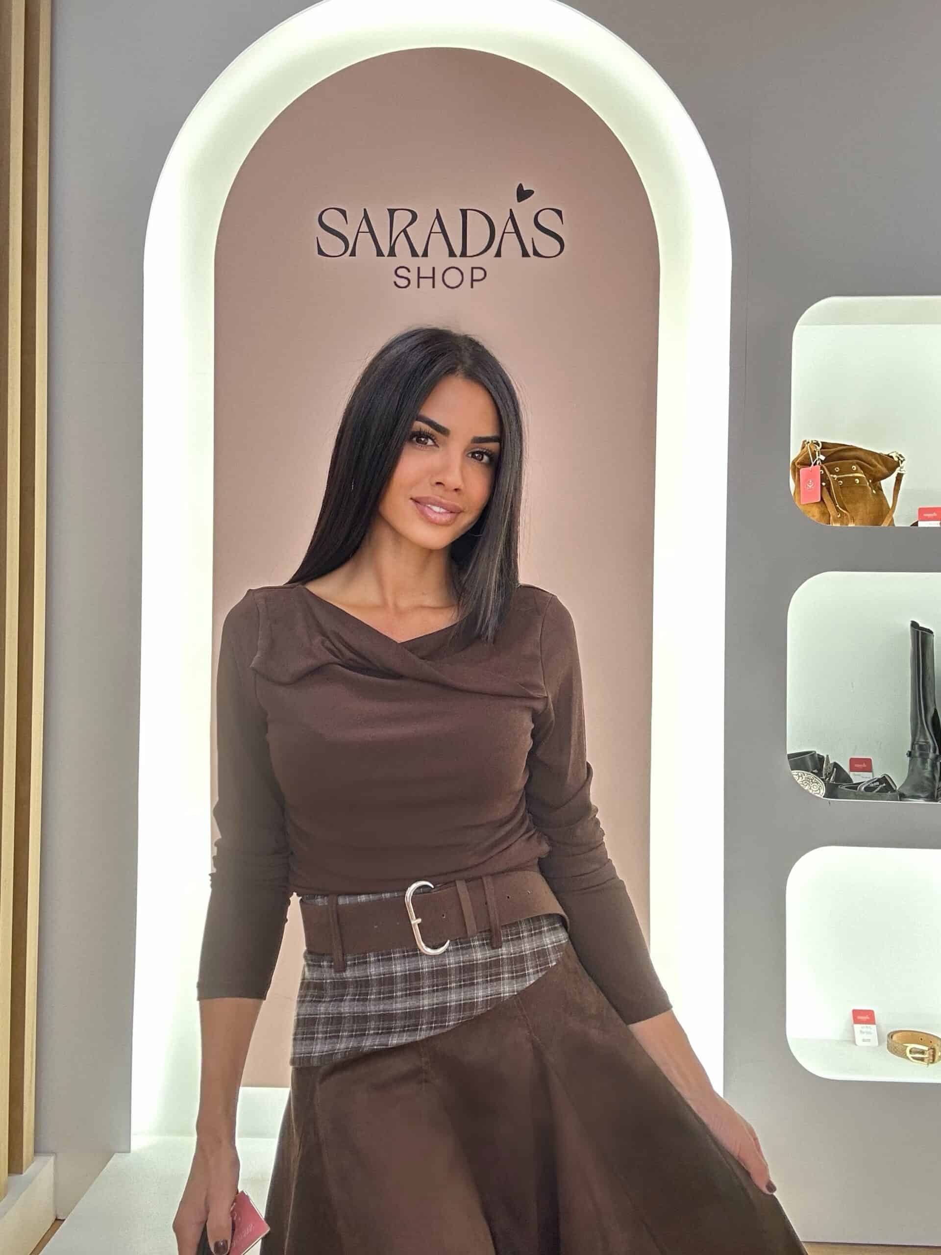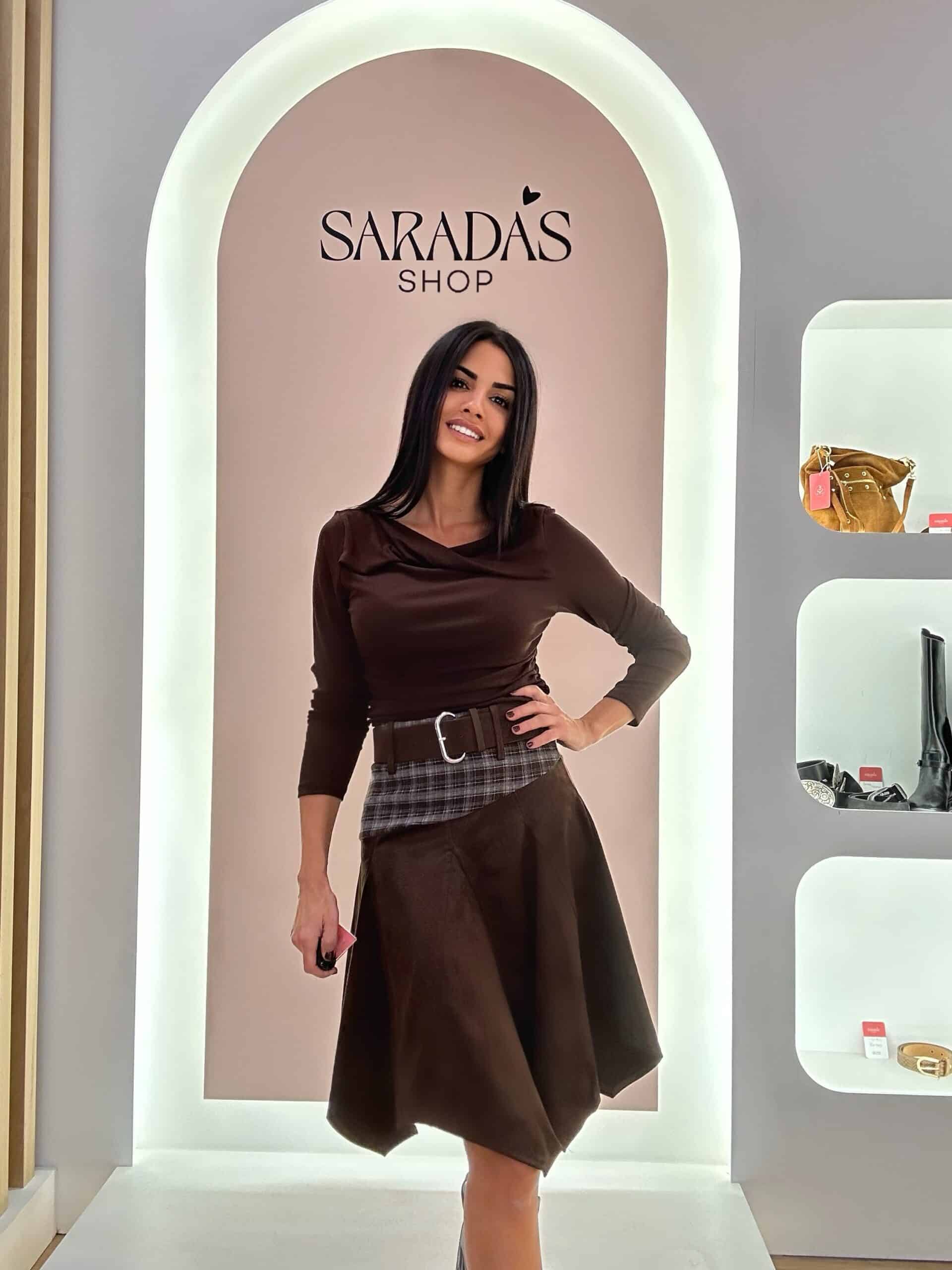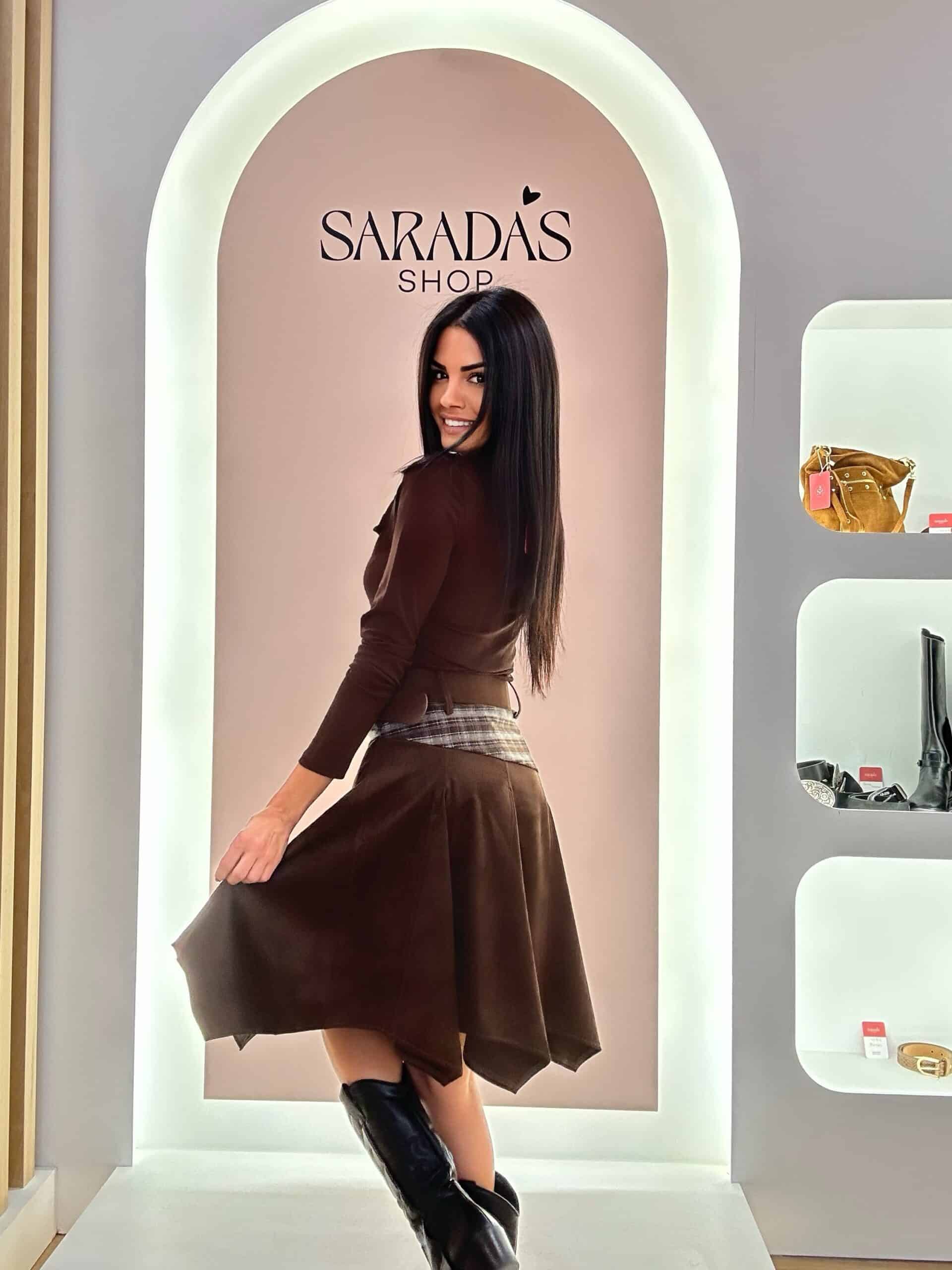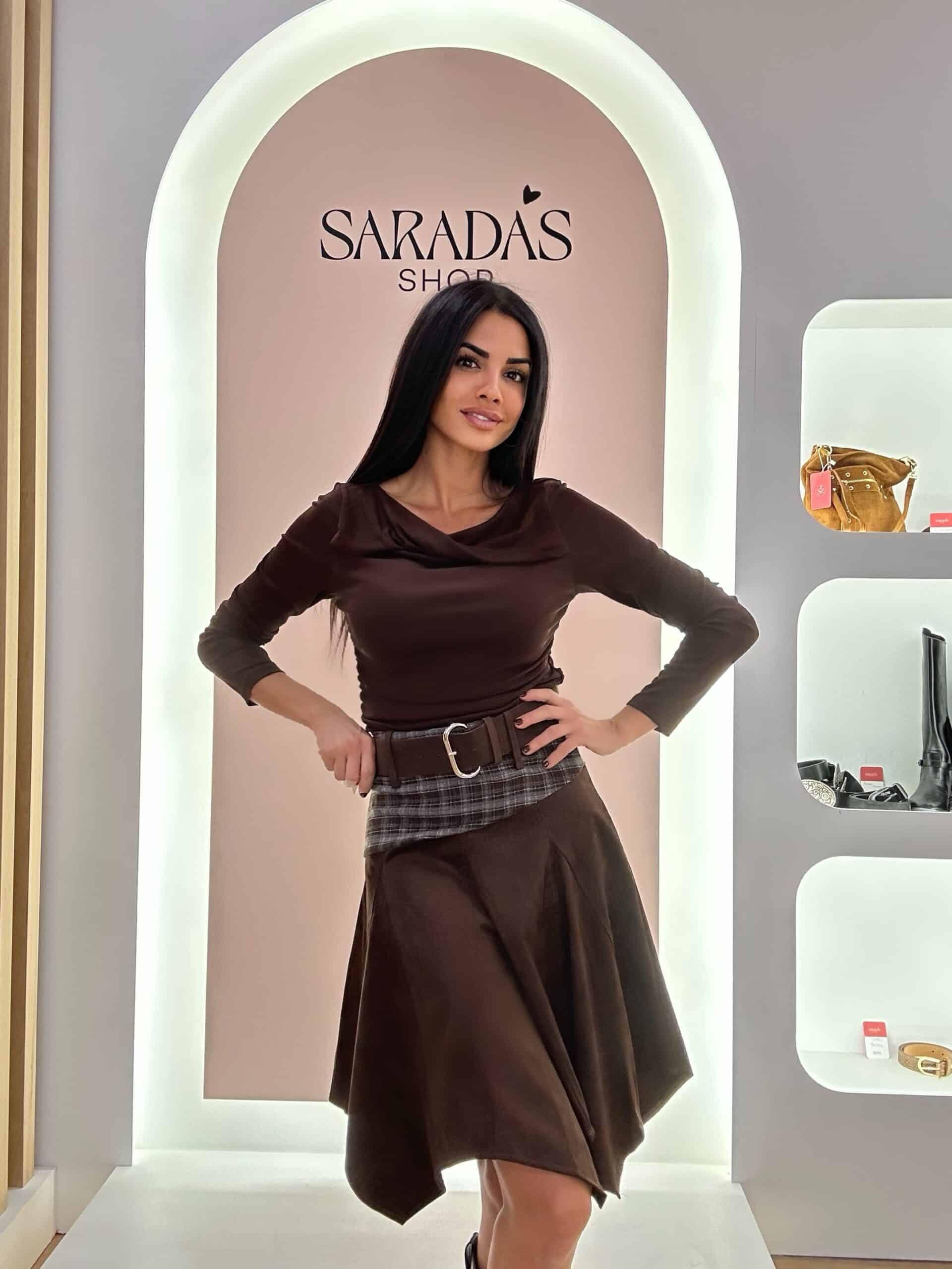 Falda combinada en tartán de cuadros en tonos marrón chocolate y beige en cintura, y antelina en marrón chocolate, detalle despuntado del bajo, corte evasé. Incluye cinturón con hebilla plateada en color marrón chocolate.