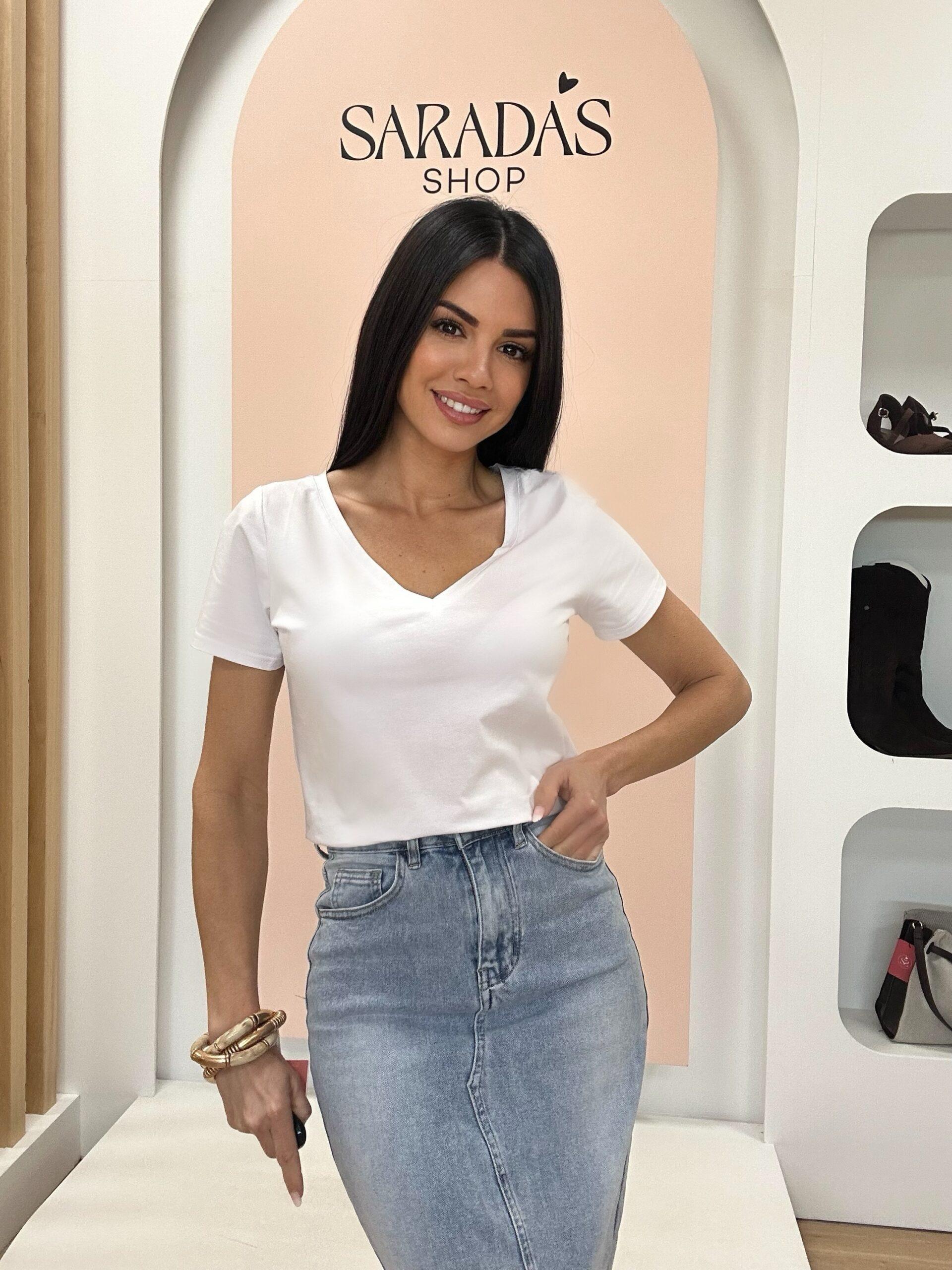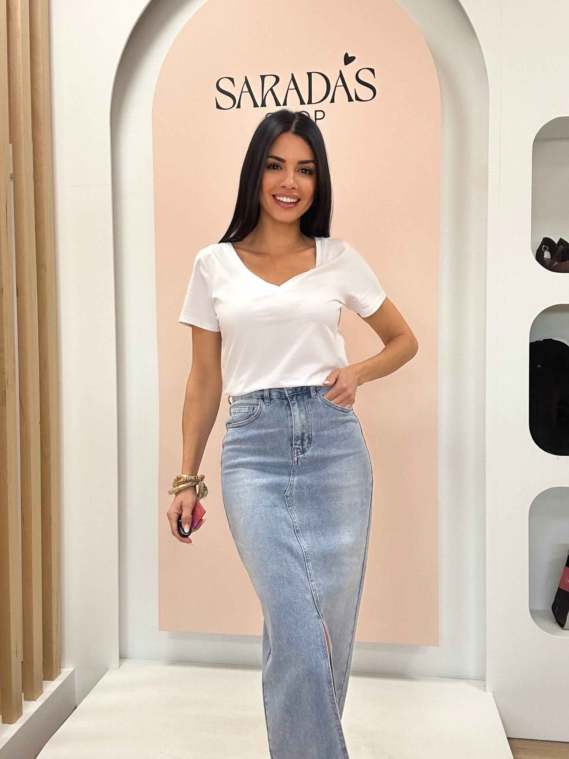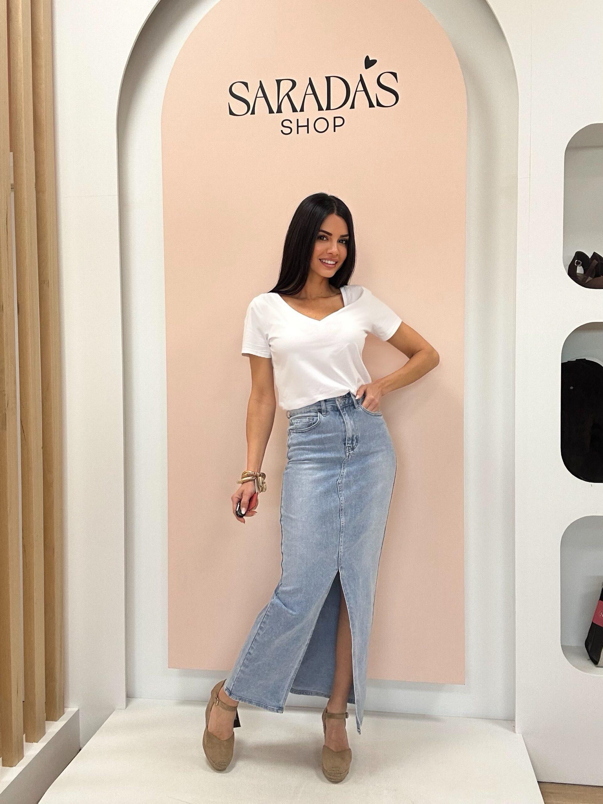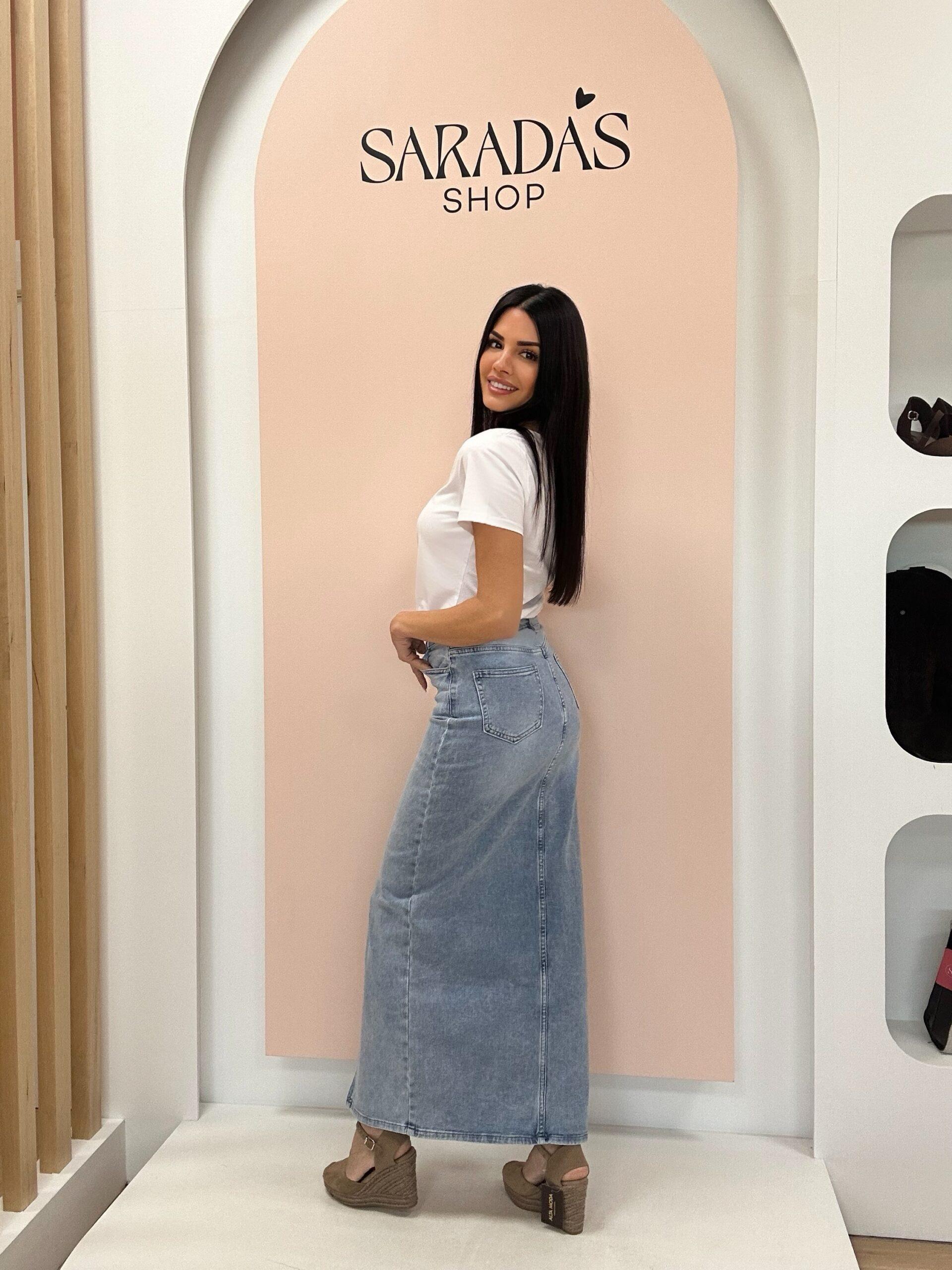 Falda denim de color azul claro, cintura de cierre con cremallera y botón, trabillas, bolsillos laterales y abertura central delantera.