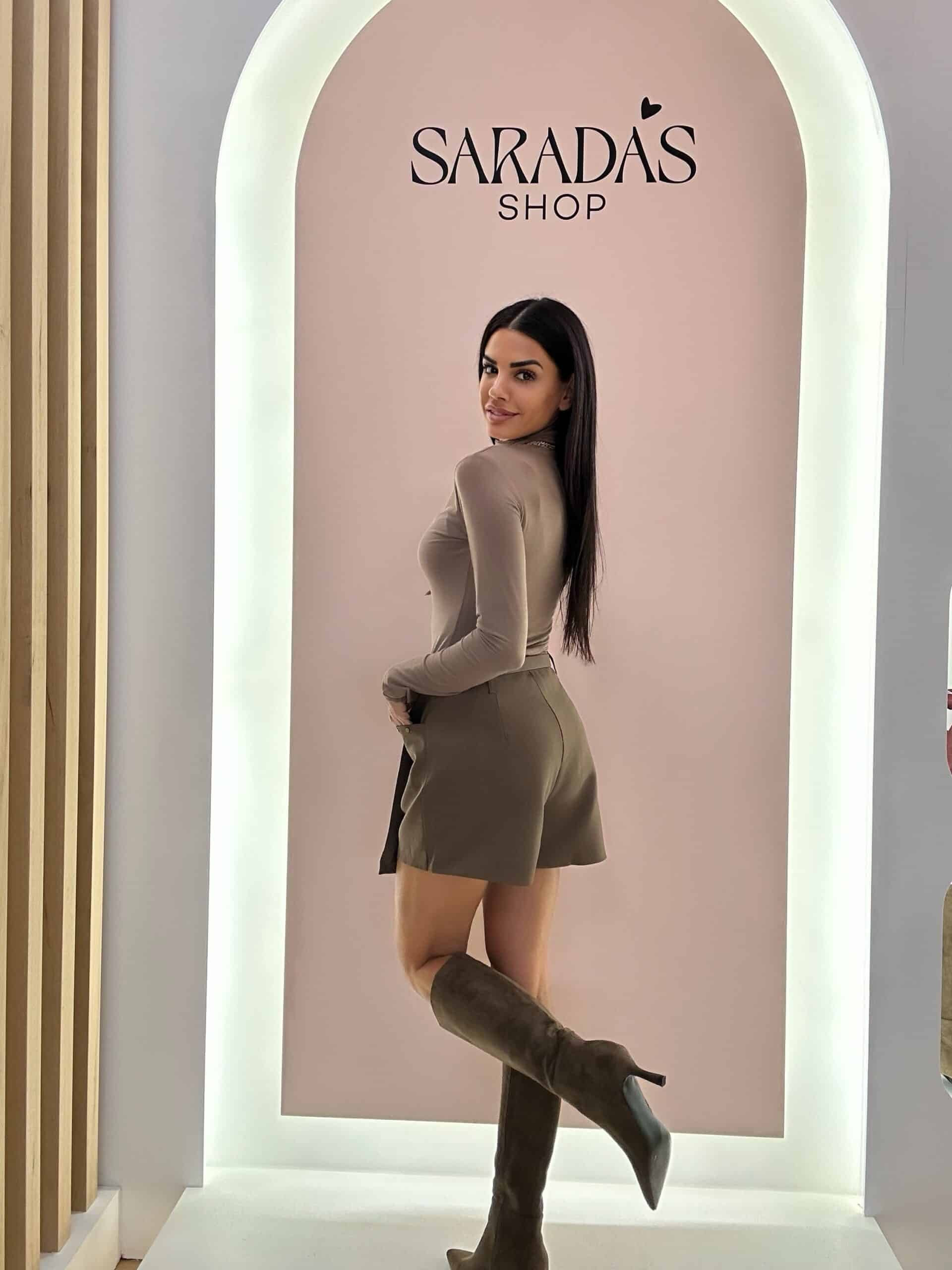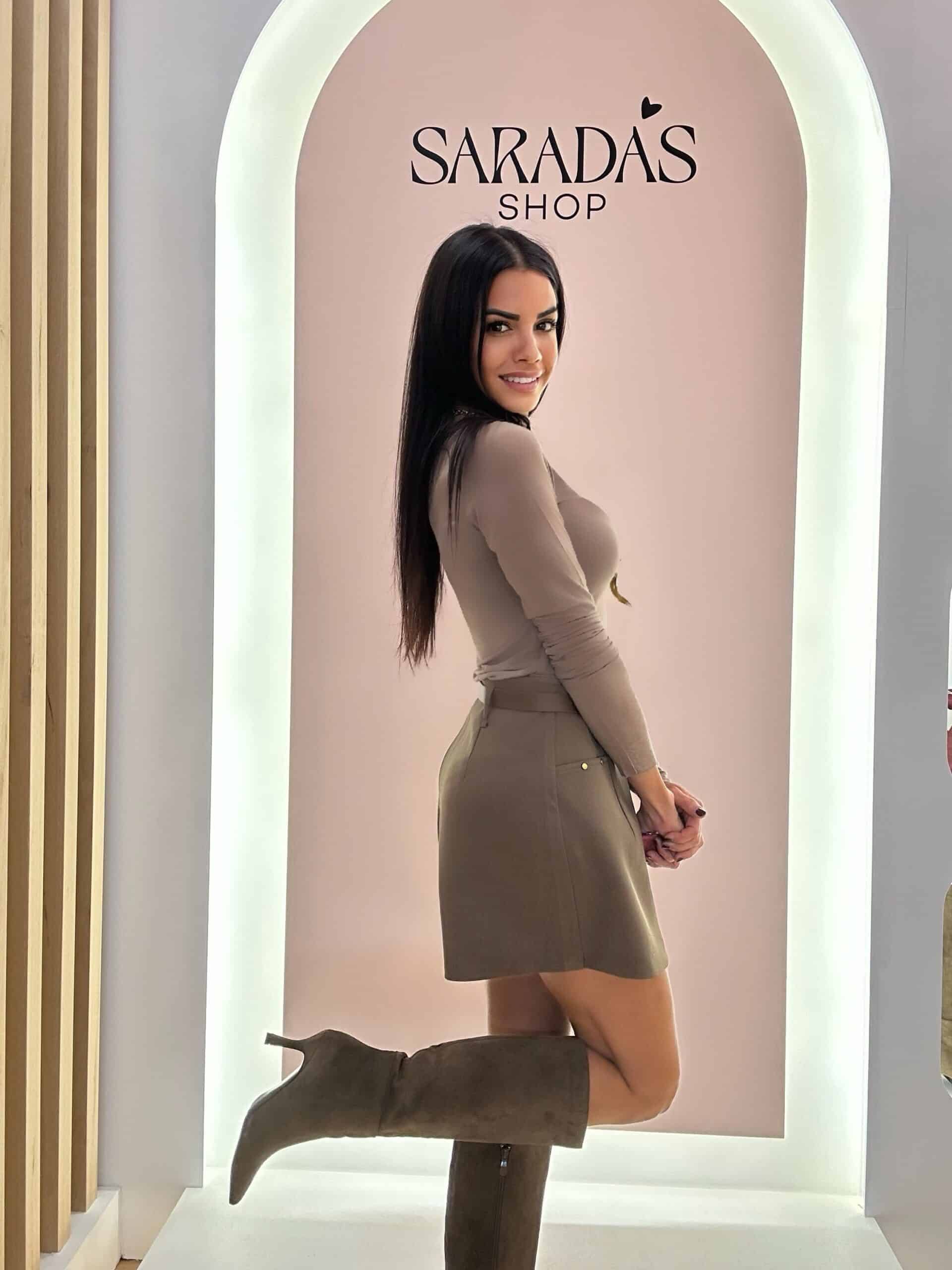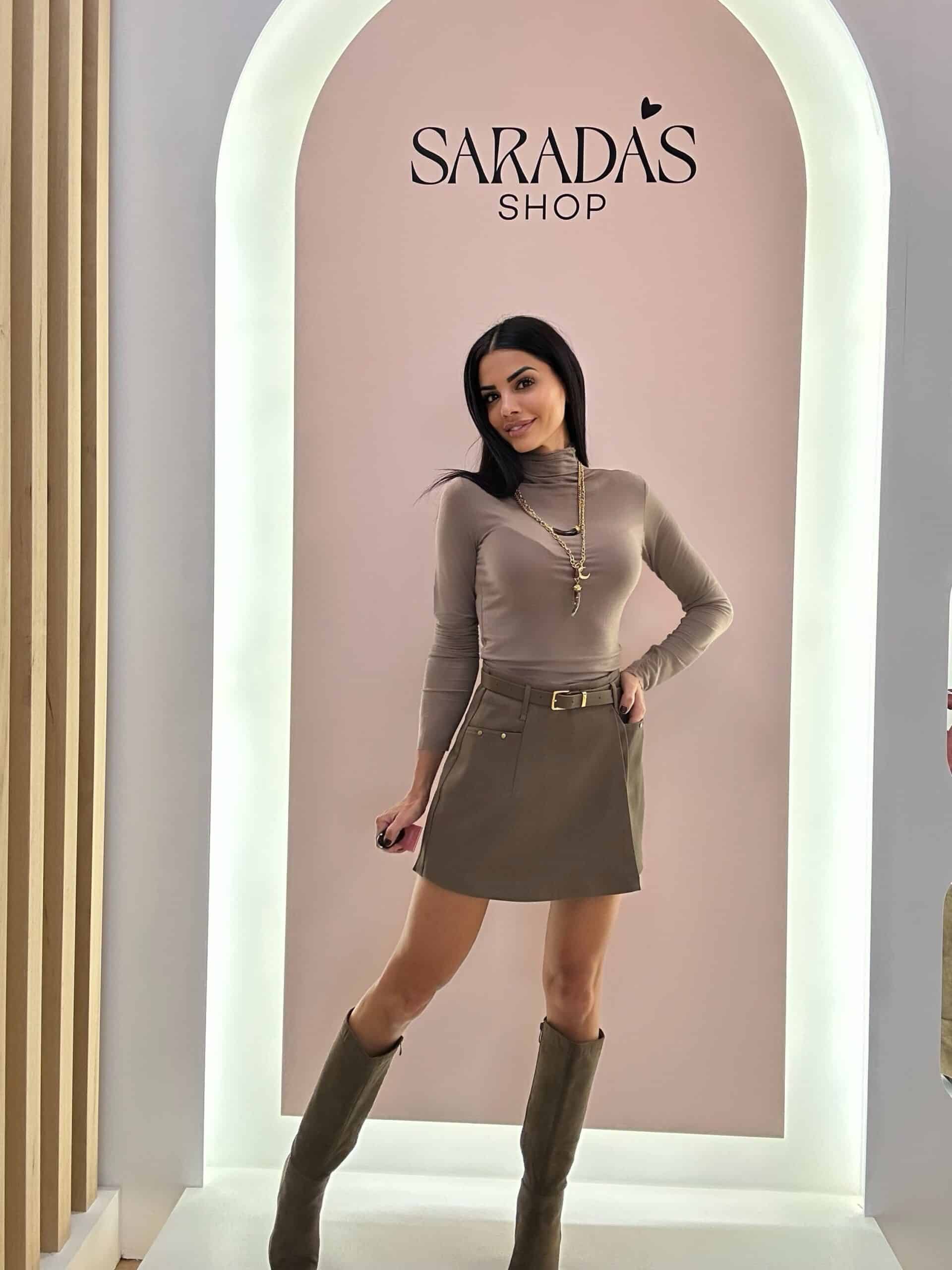 Falda pantalón en poliéster de color taupe, detalle bolsillo lateral con tachuelas en dorado envejecido, cierre con cremallera invisible trasera, incluye cinturón en mismo color, con hebilla en color dorado. Totalmente forrada.