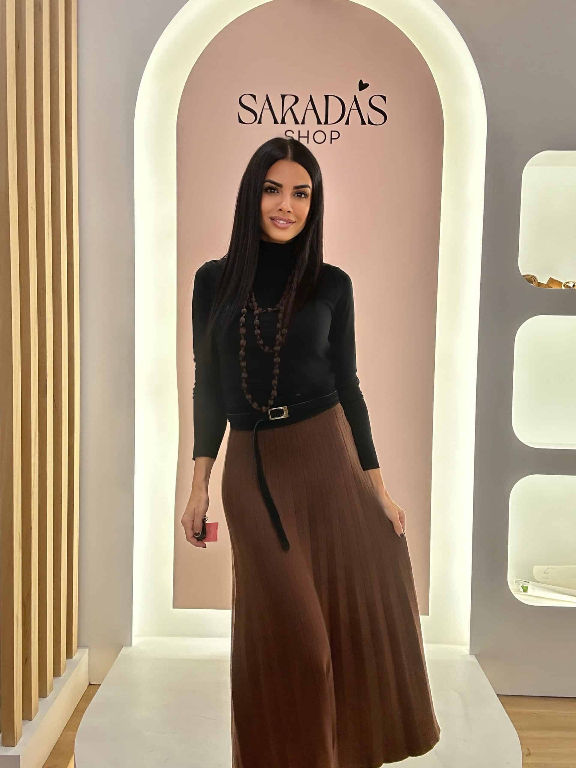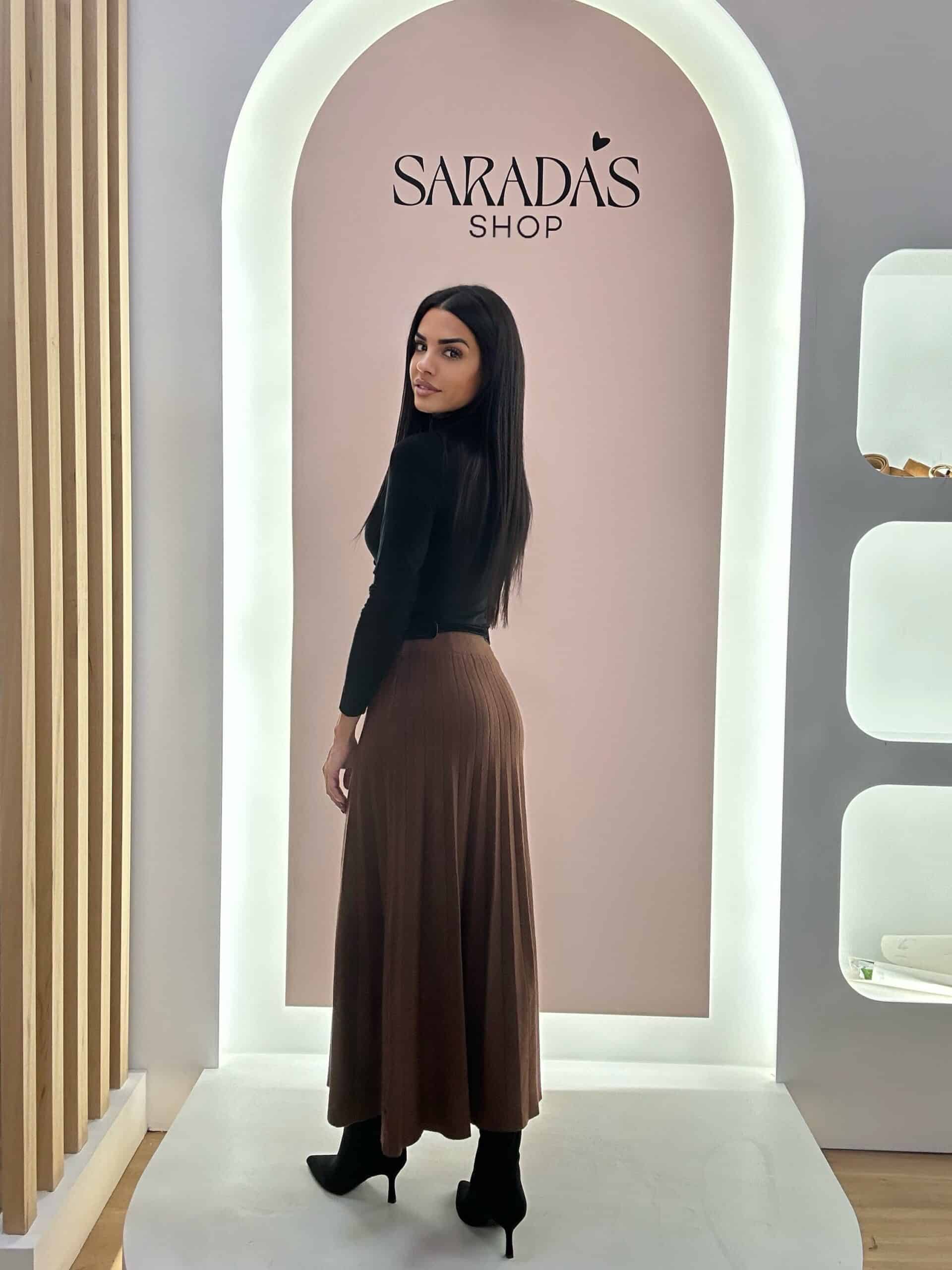 Falda larga en punto, de color chocolate, cintura con elástico, corte evasé. Detalle de efecto tableado.