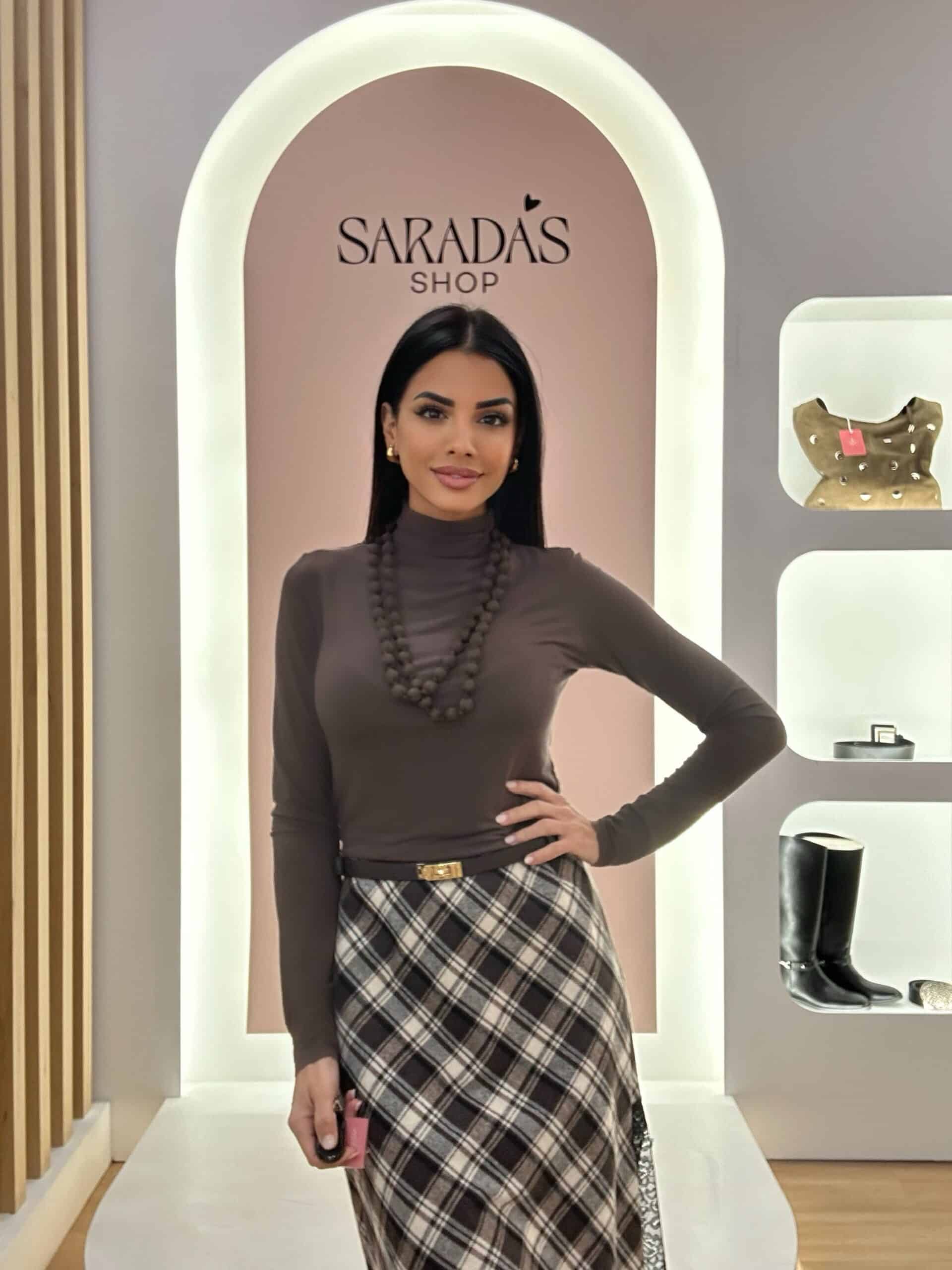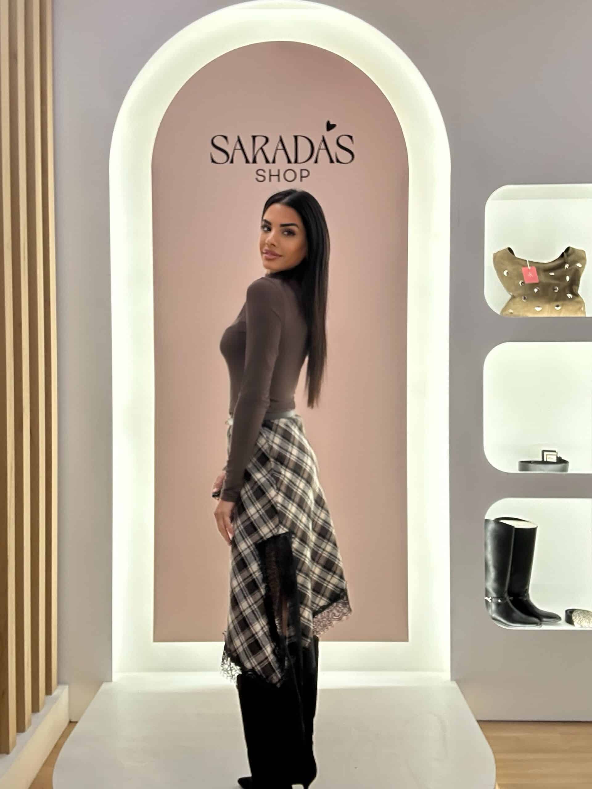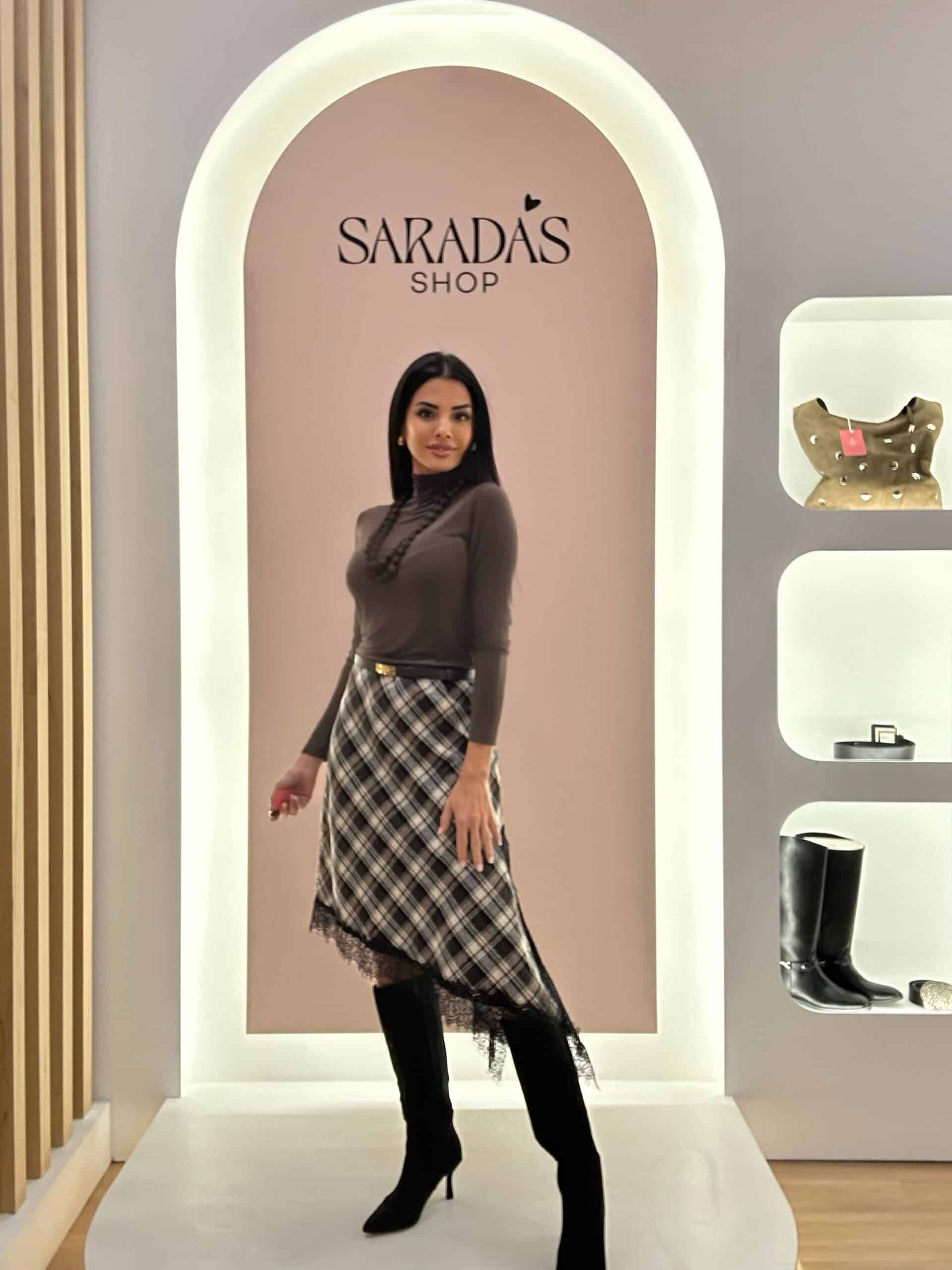 Falda tartán de cuadros en tonos marrón chocolate, beige y negro, cintura con elástico interior, corte evasé asimétrico con abertura y detalle de encaje.