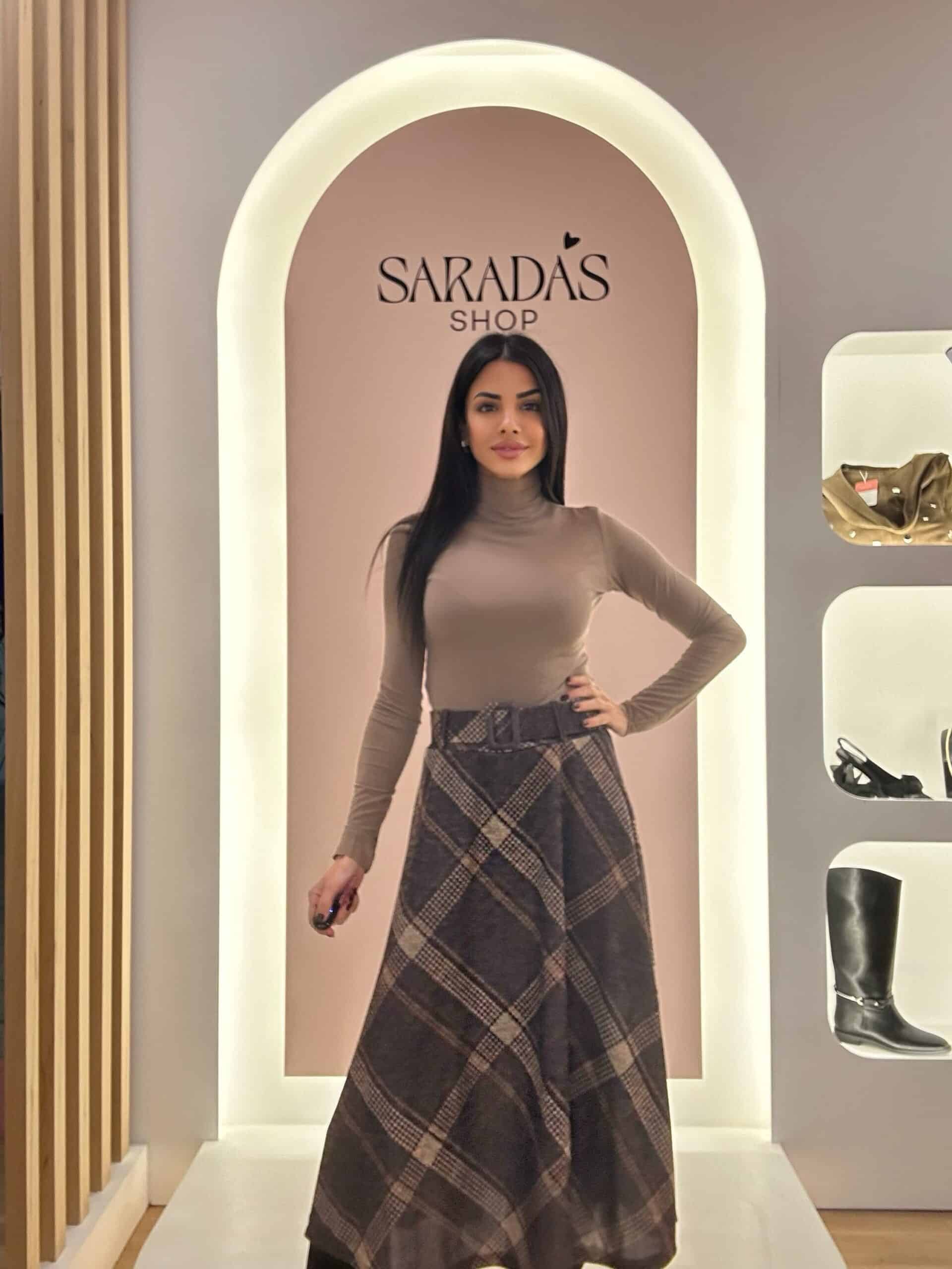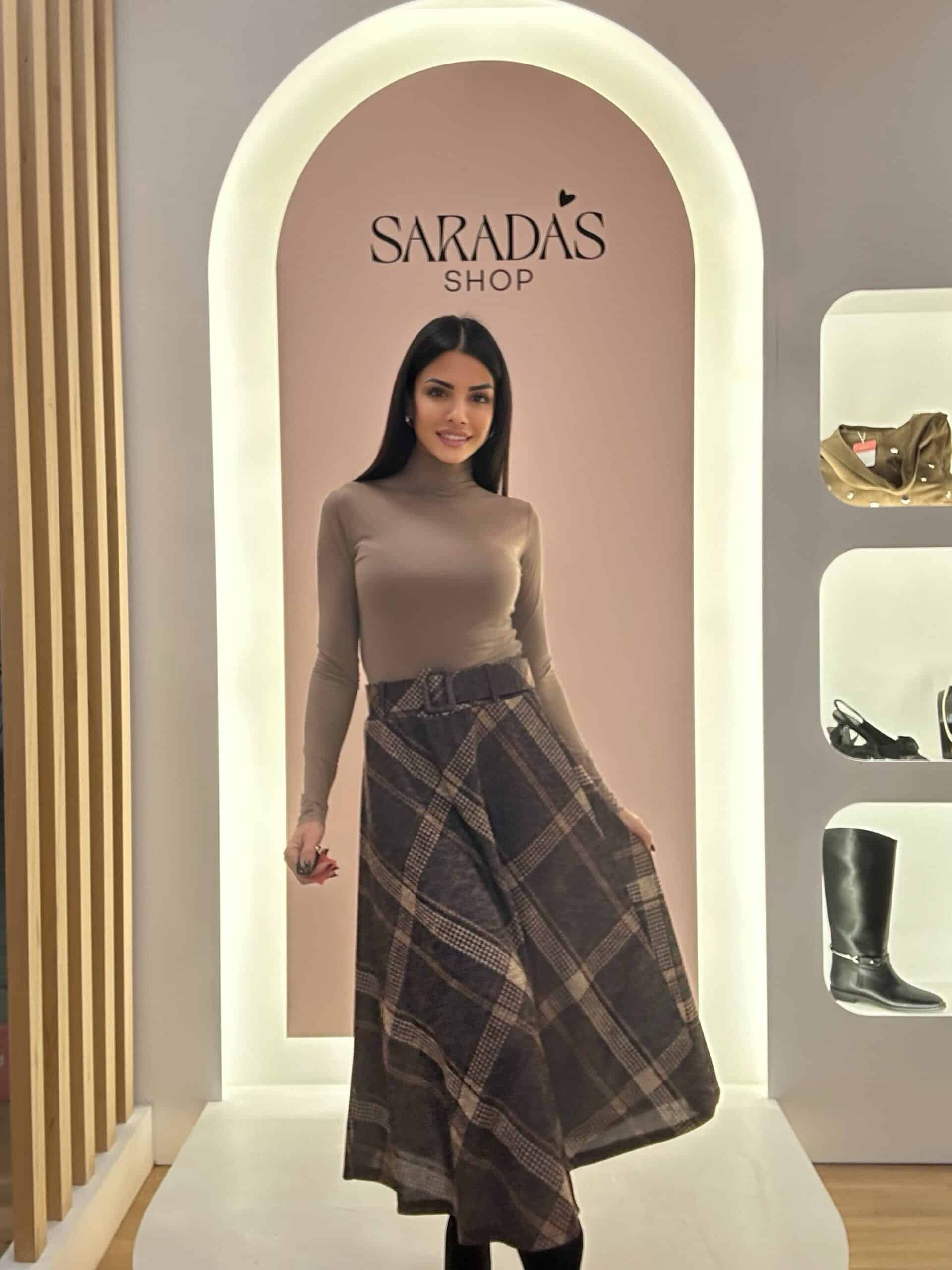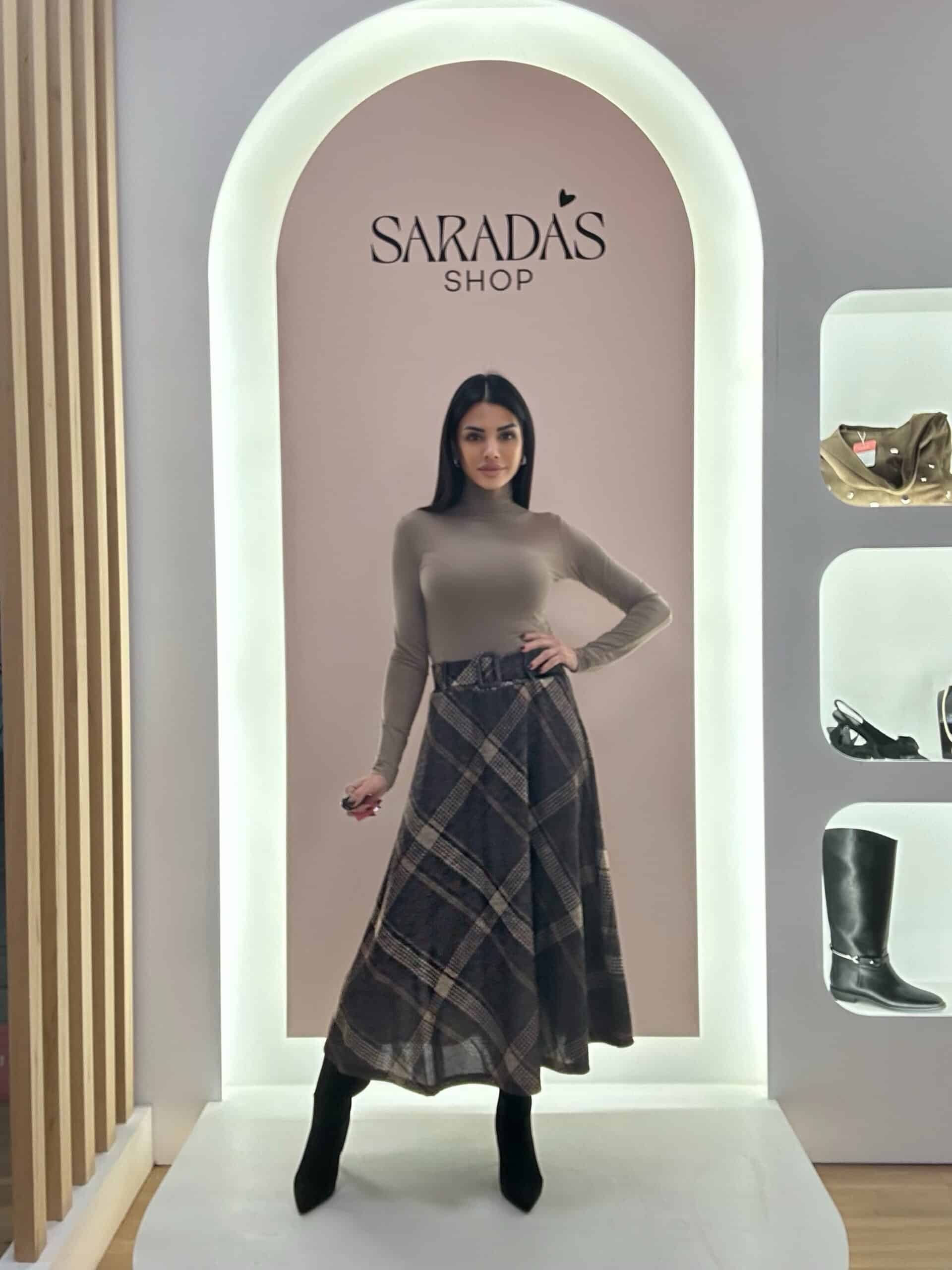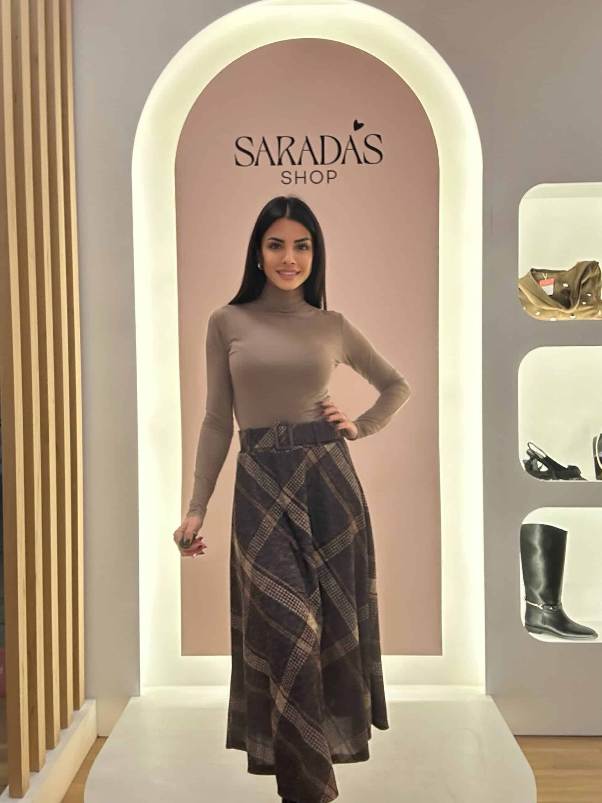 Falda tartán de cuadros en tonos berenjena oscuro y taupe, corte evasé, cintura con elástico interior y trabillas, incluye cinturón en el mismo estampado y color, bajo redondeado. Diseño Italiano.