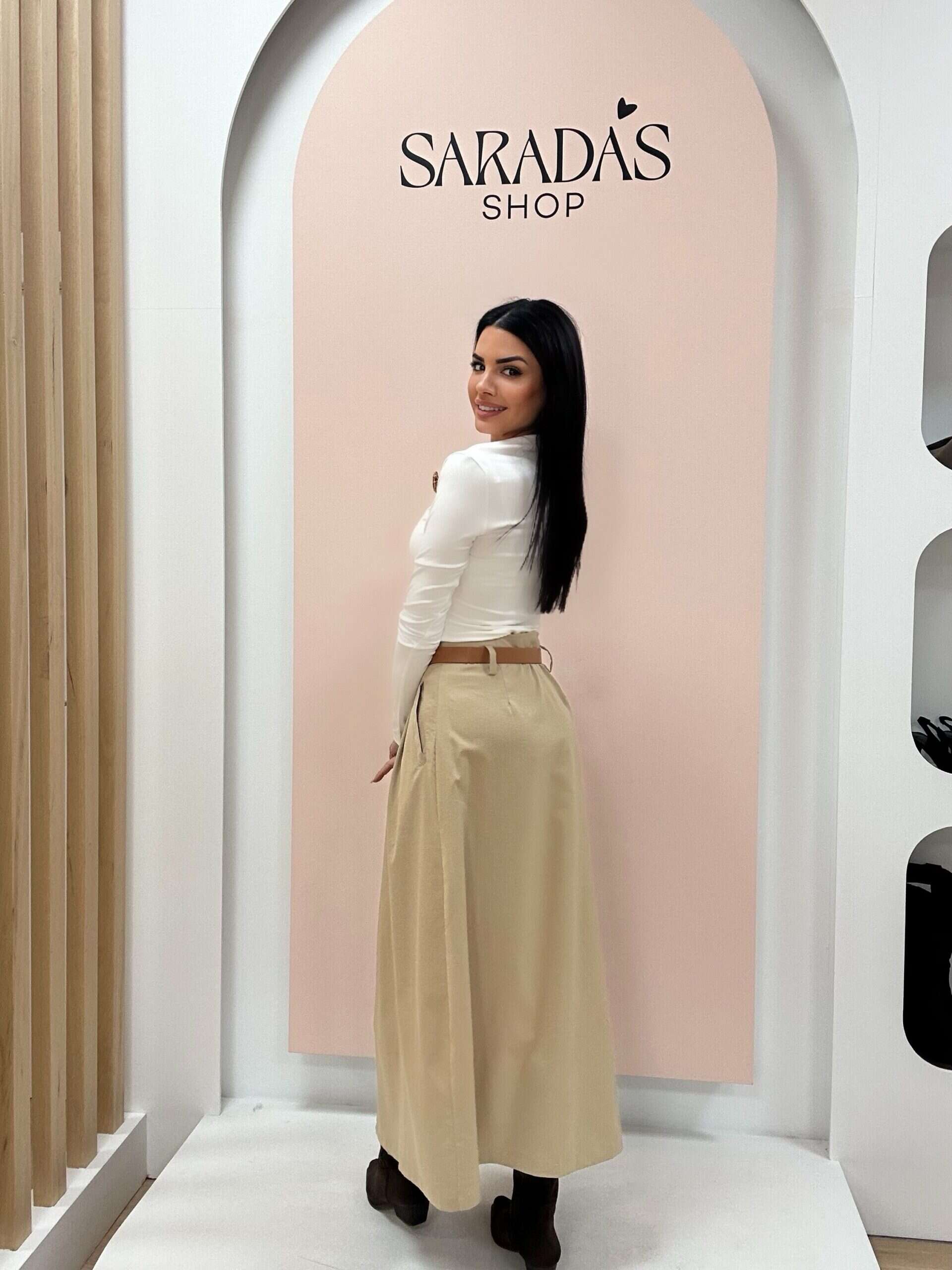 Falda en poliéster de color camel, cintura de cierre con cremallera, trabillas con cinturón camel incluido,, corte recto, pinzas, bolsillos laterales y abertura central delantera. Elige tu talla: S/34, M/36, L/38, XL/40 100%Poliéster.